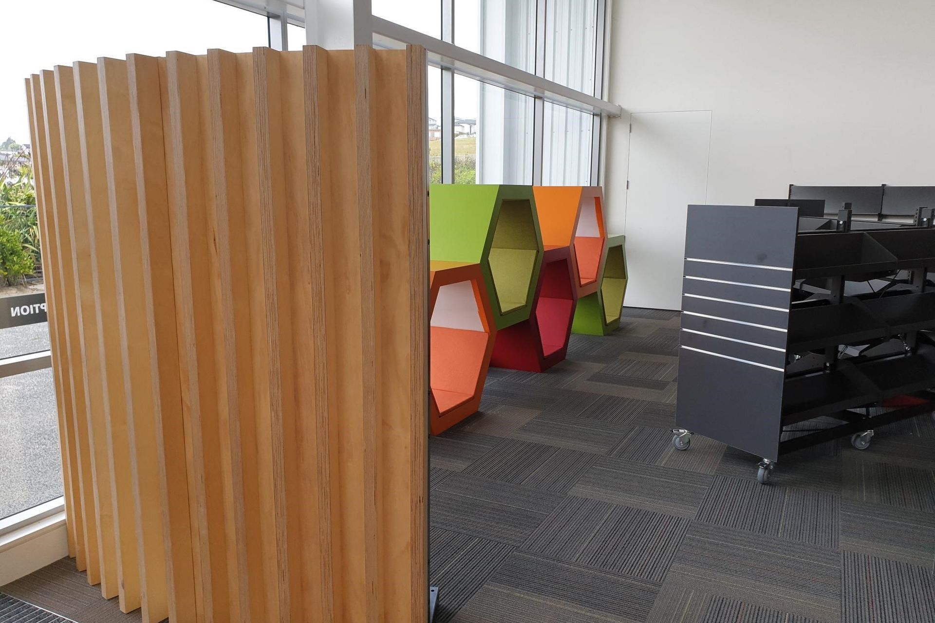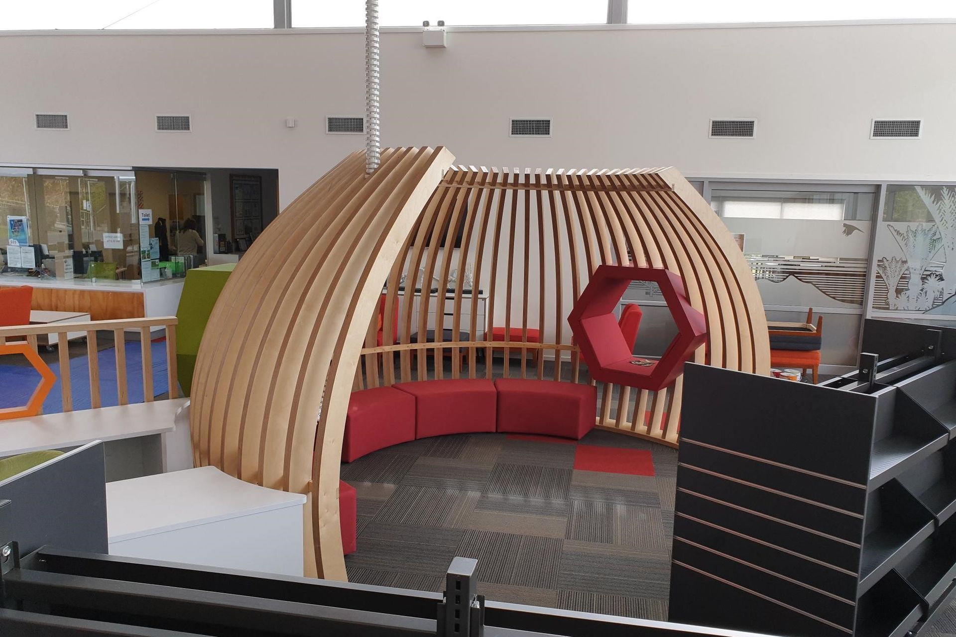 ArchiPro Project Summary - Kingsway School Fitout in Silverdale, designed by Office Interiors in Hastings and manufactured by Craftbuilt Industries in Levin, featuring 40mm Birch fins that create an inviting reading nook.