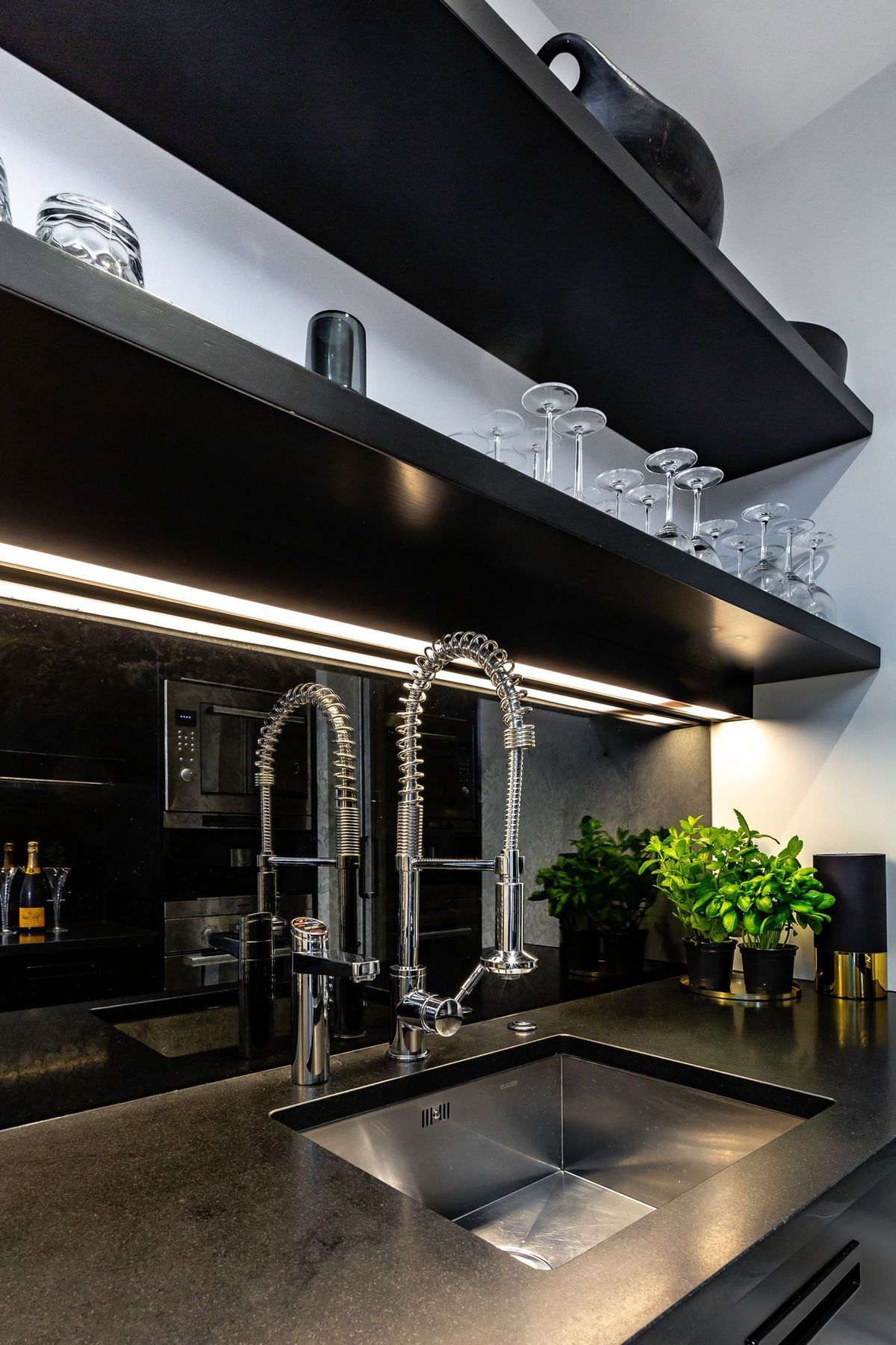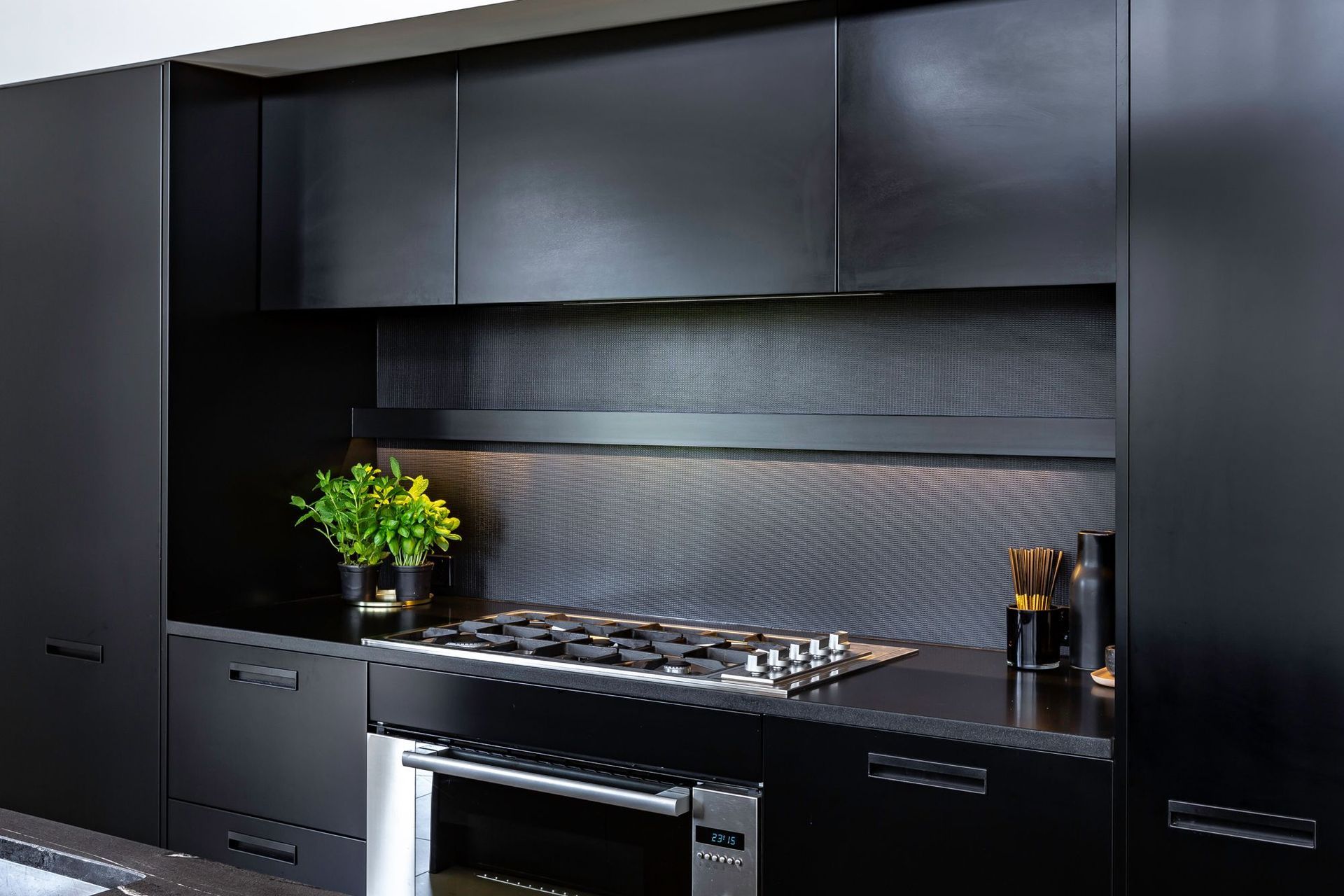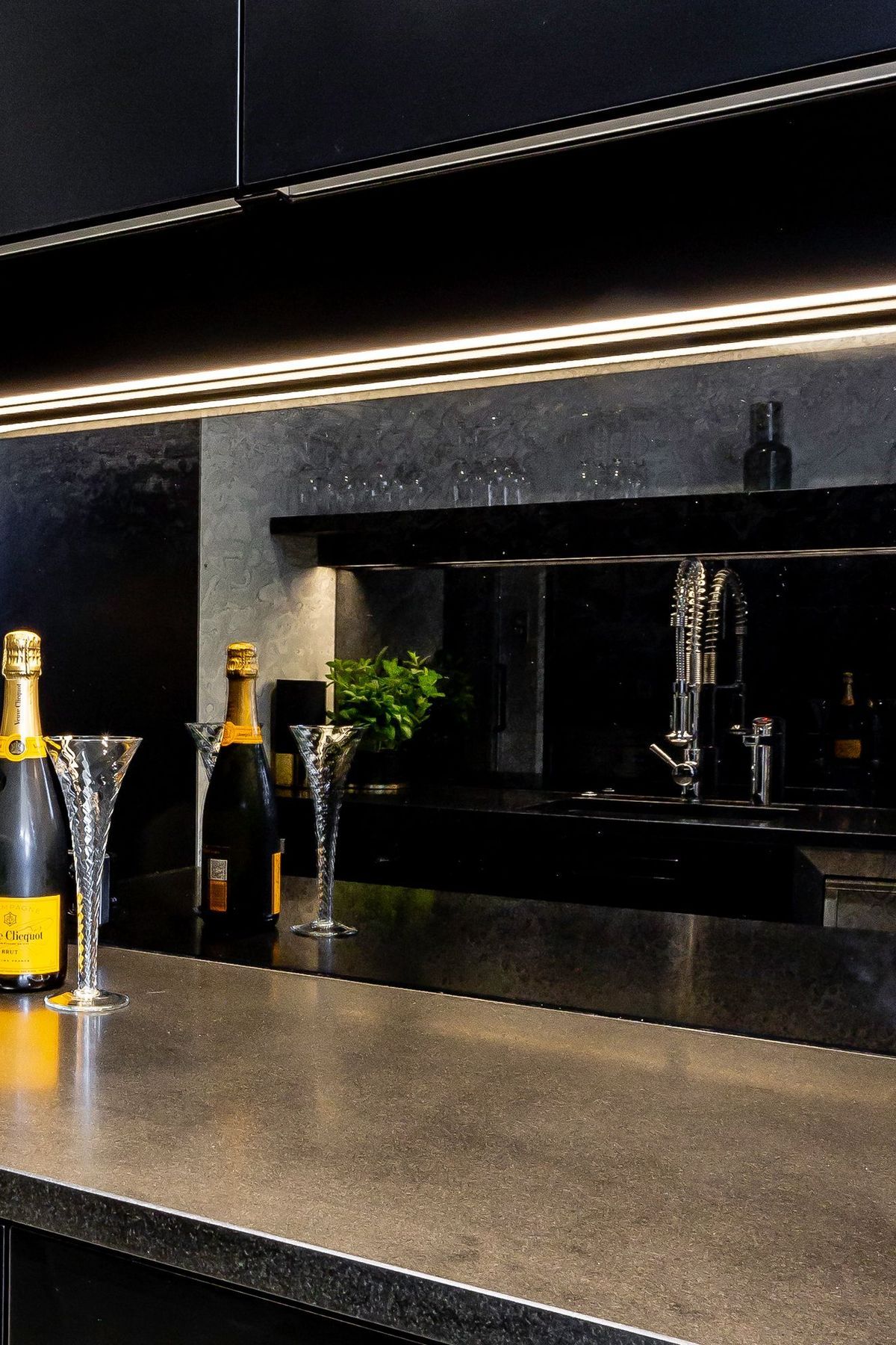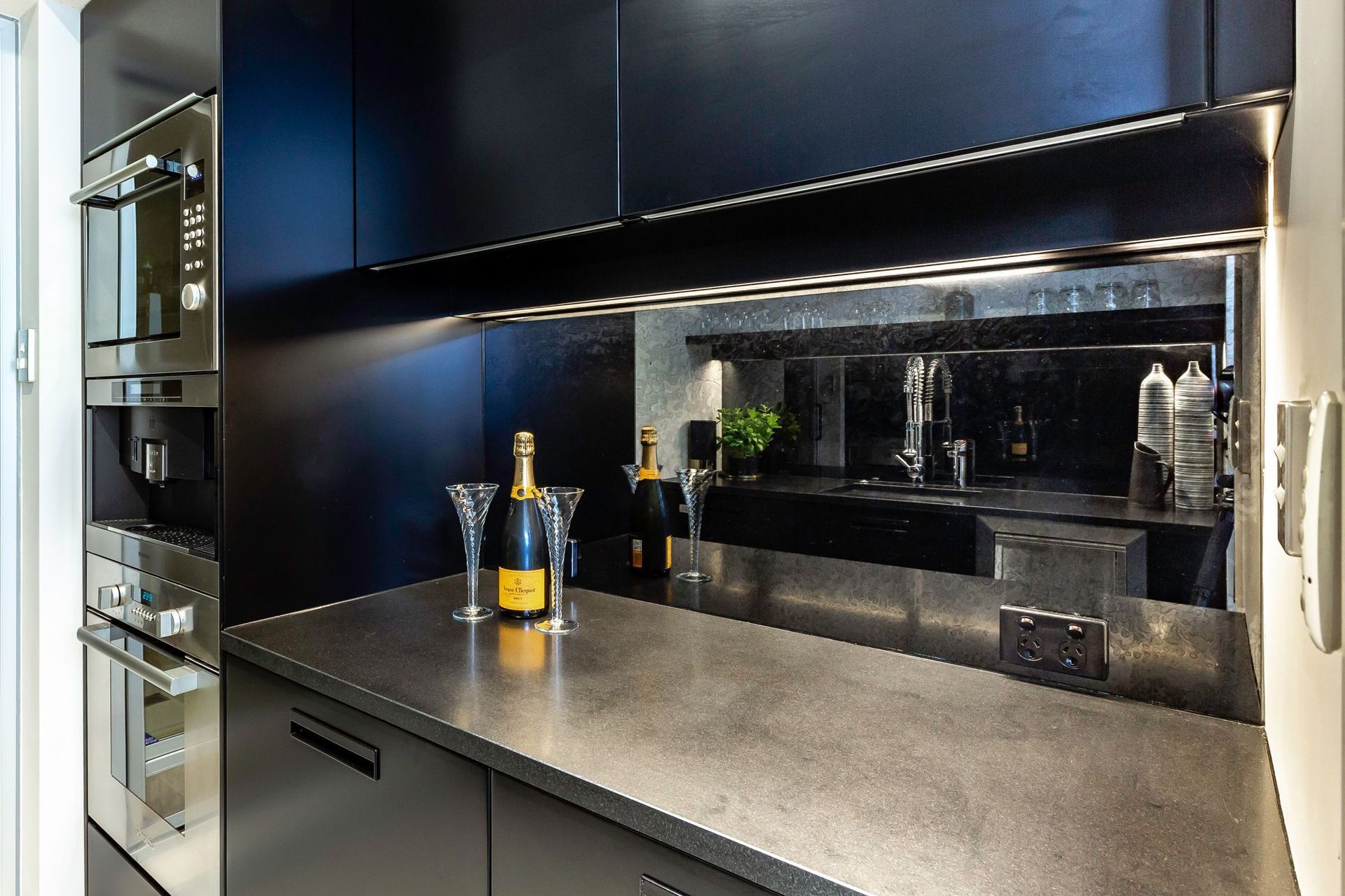 ArchiPro Project Summary - Innovative kitchen featuring metal coated glass splashbacks for a contemporary aesthetic and lasting durability.