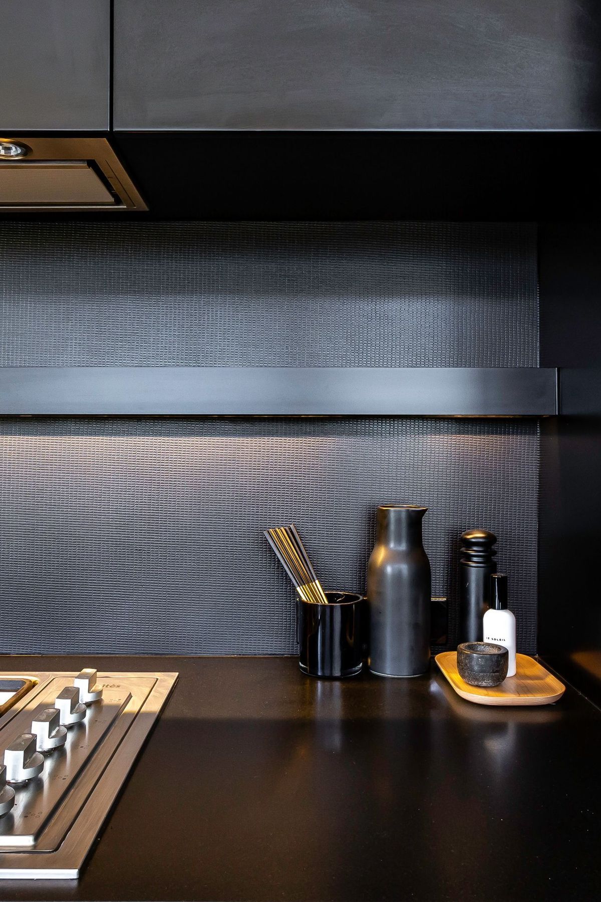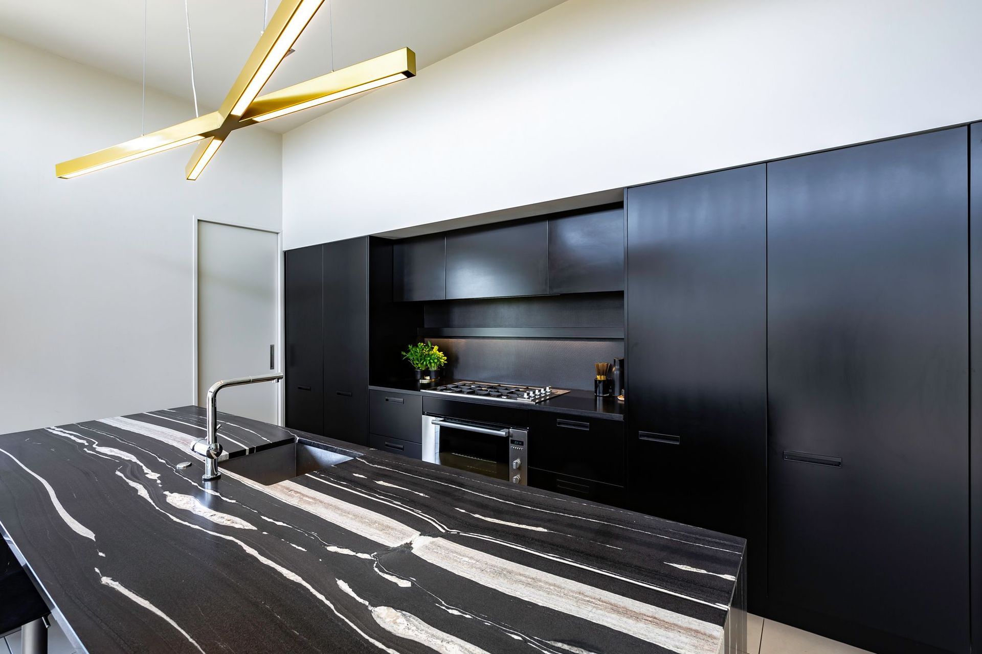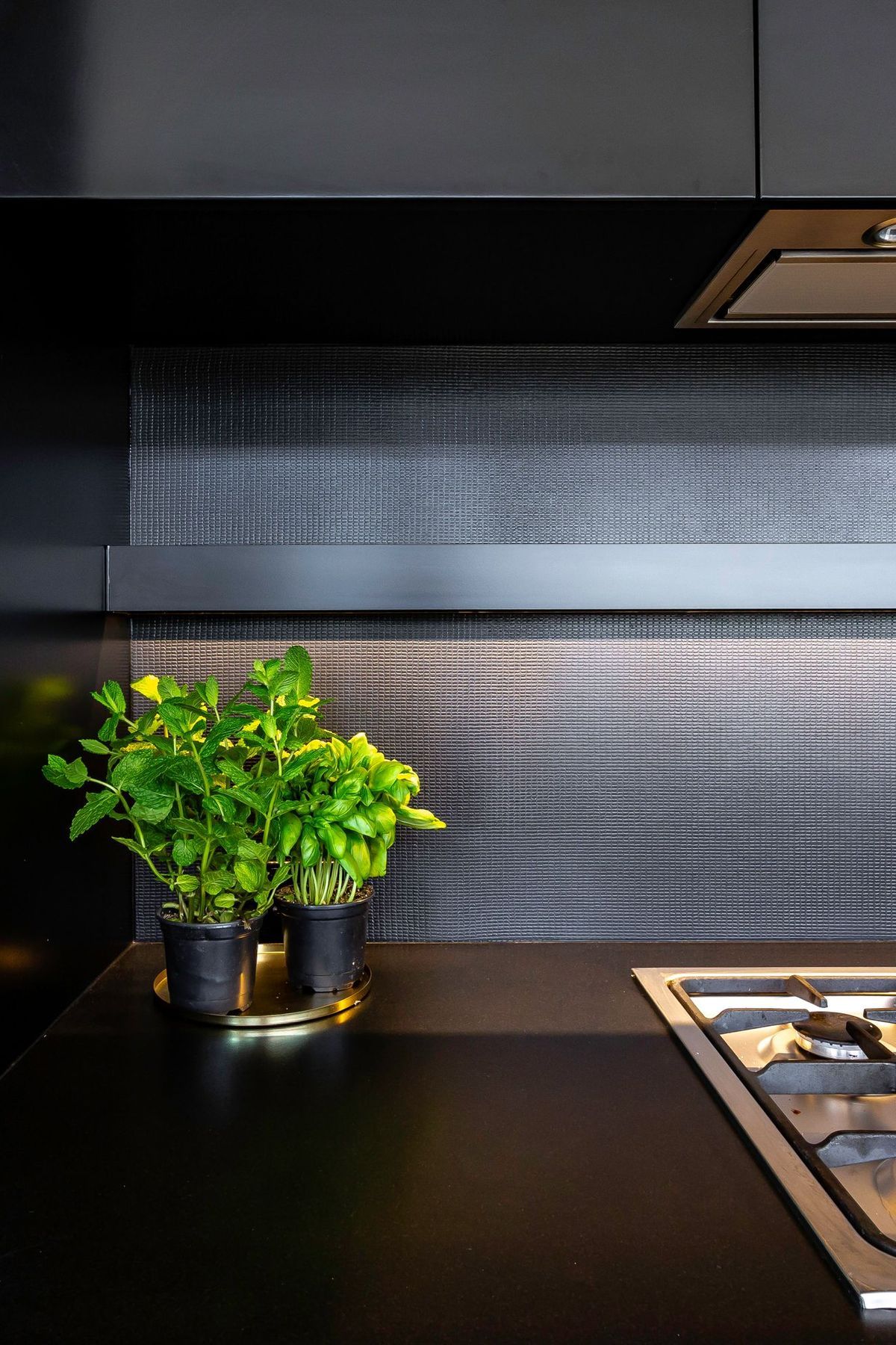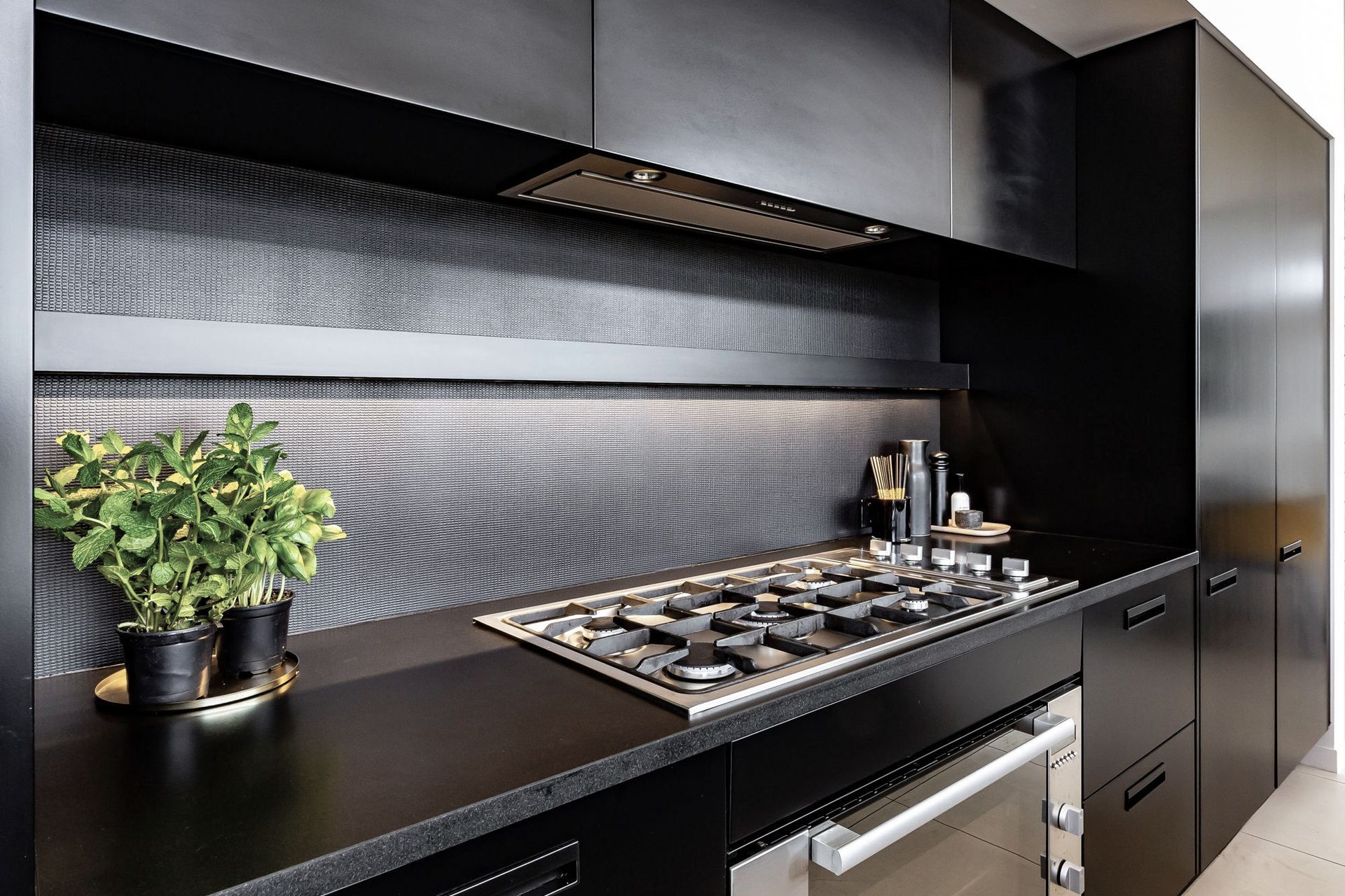 ArchiPro Project Summary - Innovative kitchen featuring metal coated glass splashbacks for a contemporary aesthetic and lasting durability.