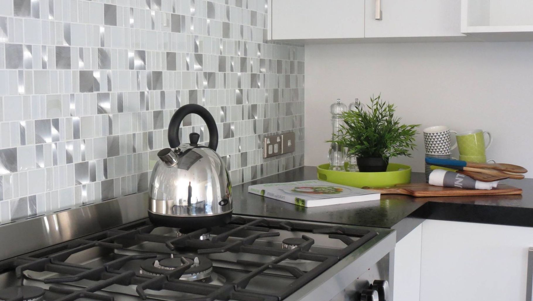 ArchiPro Project Summary - A modern kitchen featuring grey countertops, silver appliances, and elegant tiles for a stylish and functional cooking space.