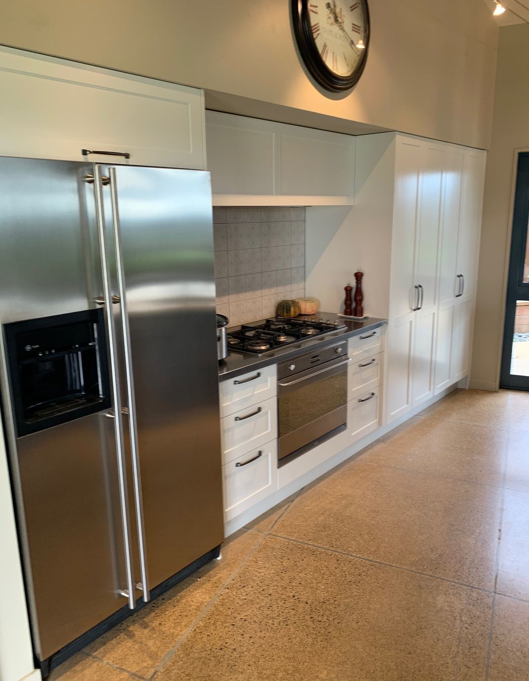 ArchiPro Project Summary - A stunning kitchen re-face featuring elegant shaker doors and panels, expertly finished in 2 pot lacquer and complemented by 40mm engineered stone, transforming the space into a beautiful and functional area despite the challenges posed by Covid-19.