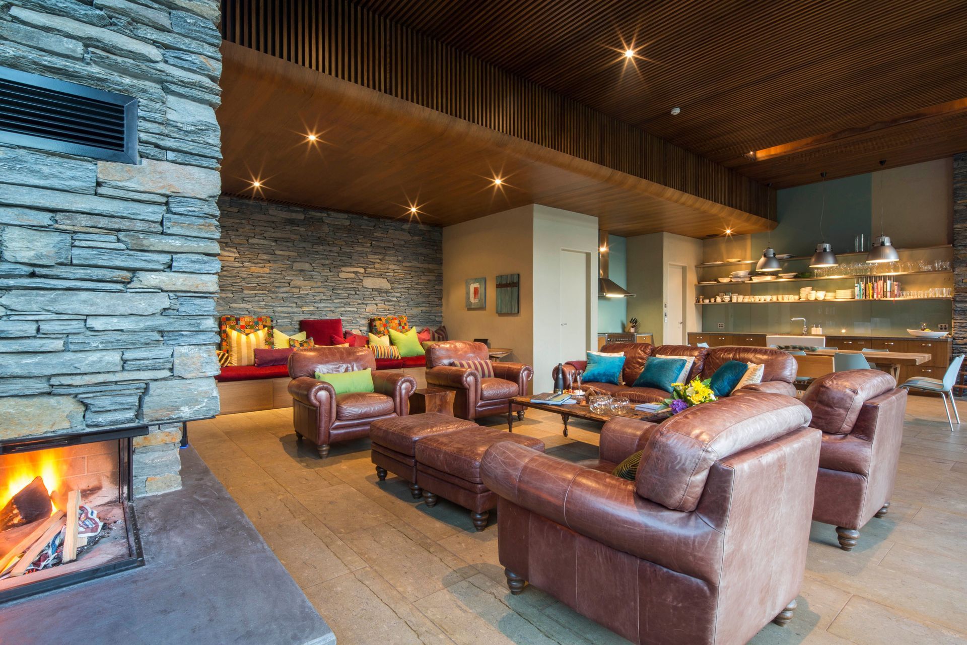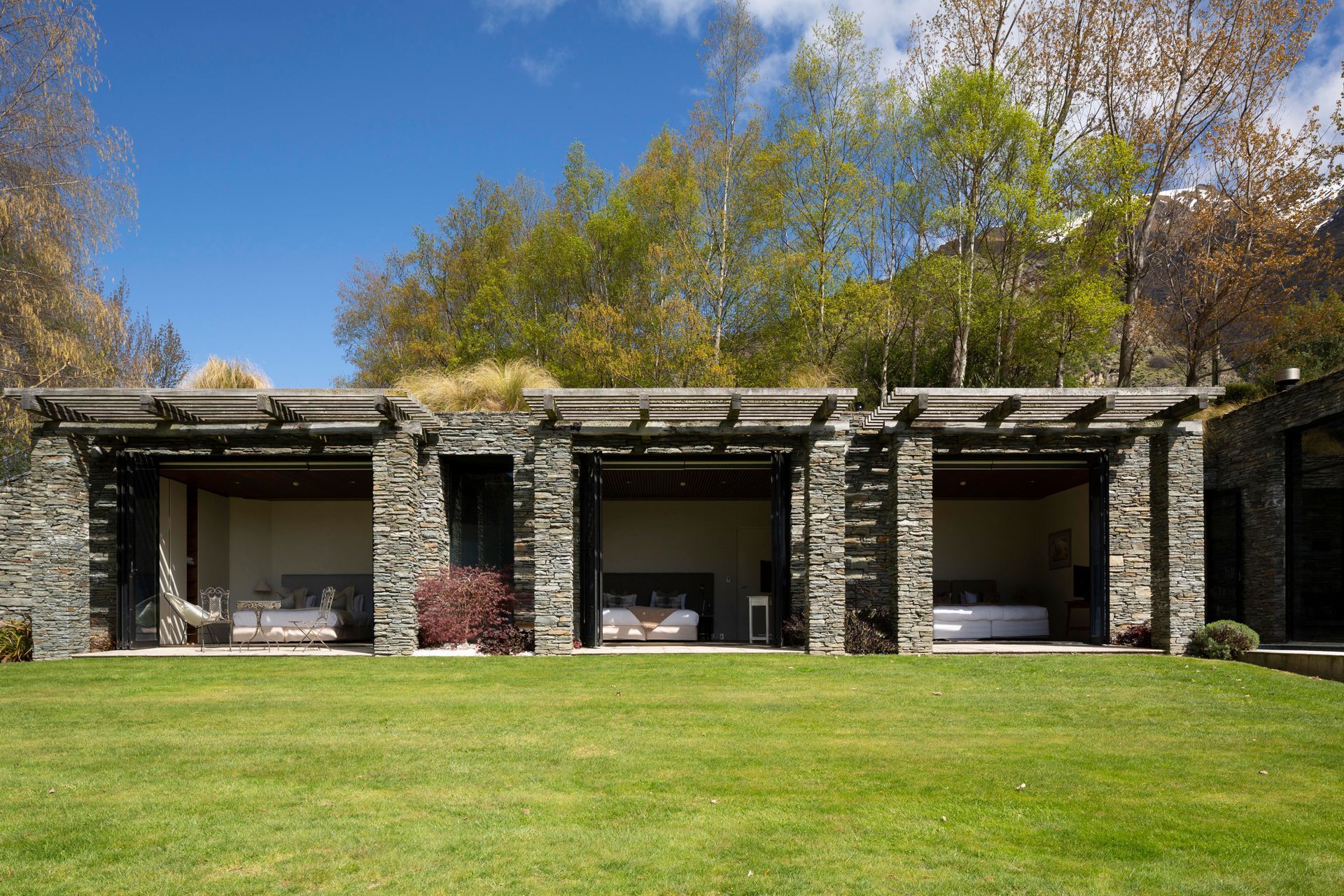 ArchiPro Project Summary - Award-winning environmentally designed house in Arthurs Point, featuring schist stone and natural wood beams, with stunning views of the Shotover River and Coronet Peak.