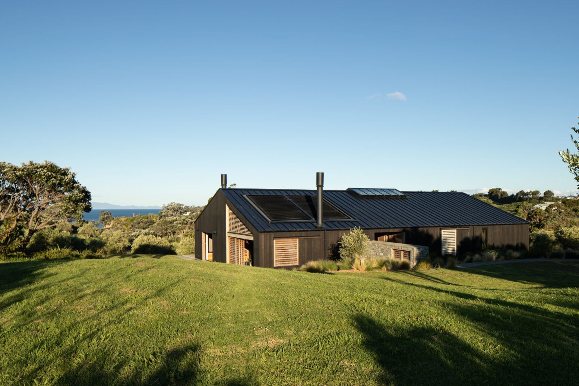 ArchiPro Project Summary - Award-winning residence nestled in an olive grove, featuring a harmonious blend of natural materials and modern design, offering stunning views of Waiheke's outer harbour.