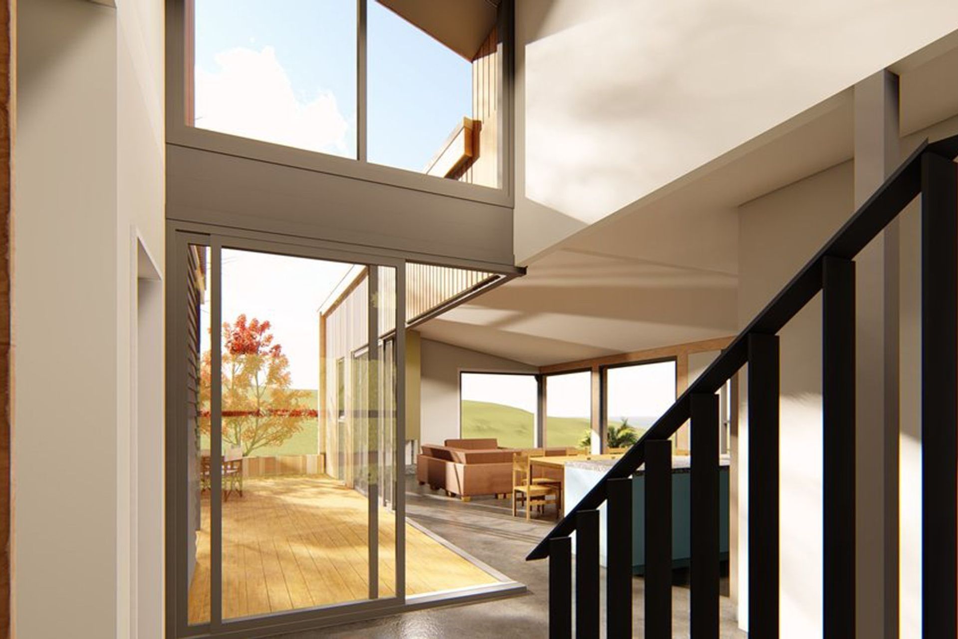 ArchiPro Project Summary - Contemporary split-level home designed for family living, featuring stunning coastal views, private outdoor spaces, and a central stairwell that enhances natural light.