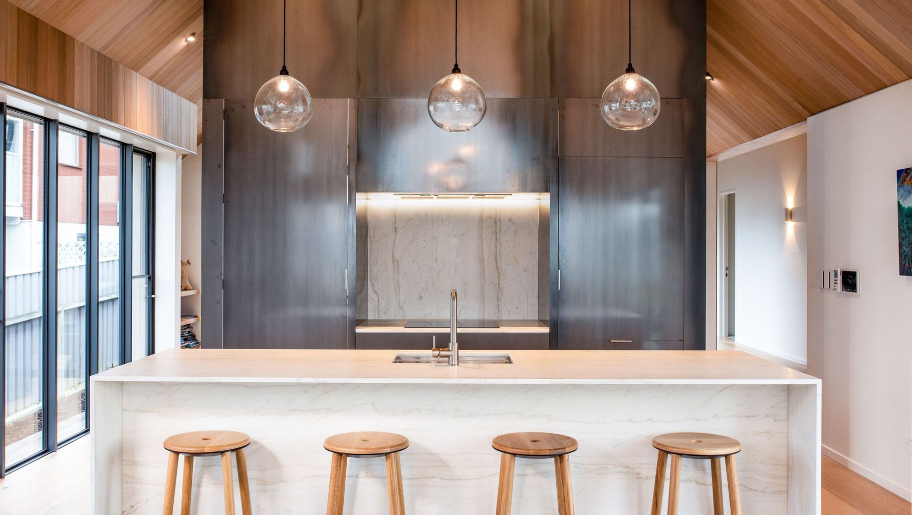 ArchiPro Project Summary - Contemporary Lake House featuring bold design elements, mild steel cabinetry, and seamless integration of kitchen and living spaces, enhanced by a striking marble benchtop and custom-built timber furnishings.