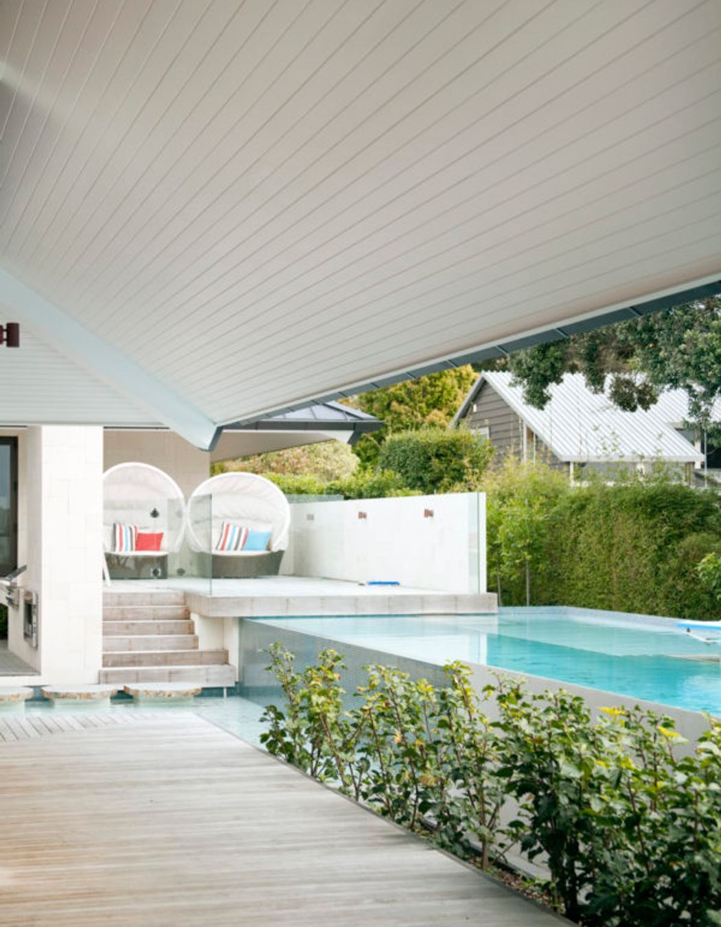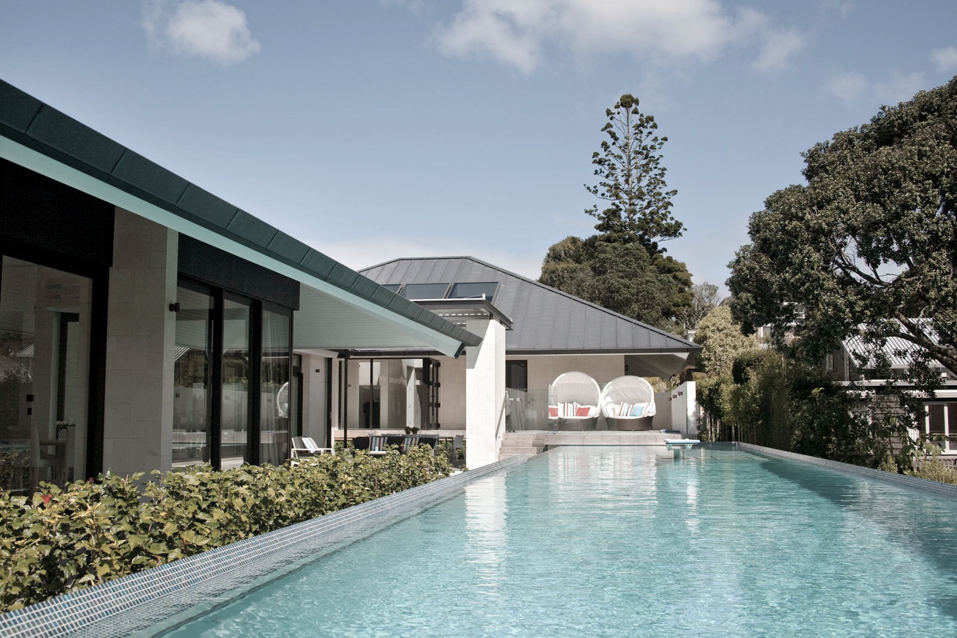 ArchiPro Project Summary - Two elegantly designed pavilions connected by a kitchen causeway, featuring expansive roof forms and a pool courtyard, offering stunning views of an extinct volcano cone lake in Takapuna, Auckland.