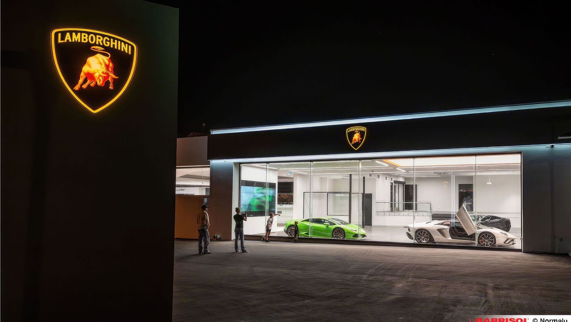 ArchiPro Project Summary - Innovative Barrisol Lumière lighting solution enhances the luxury showroom experience at Lamborghini Adelaide, showcasing dynamic and customizable effects while maintaining energy efficiency and ease of maintenance.