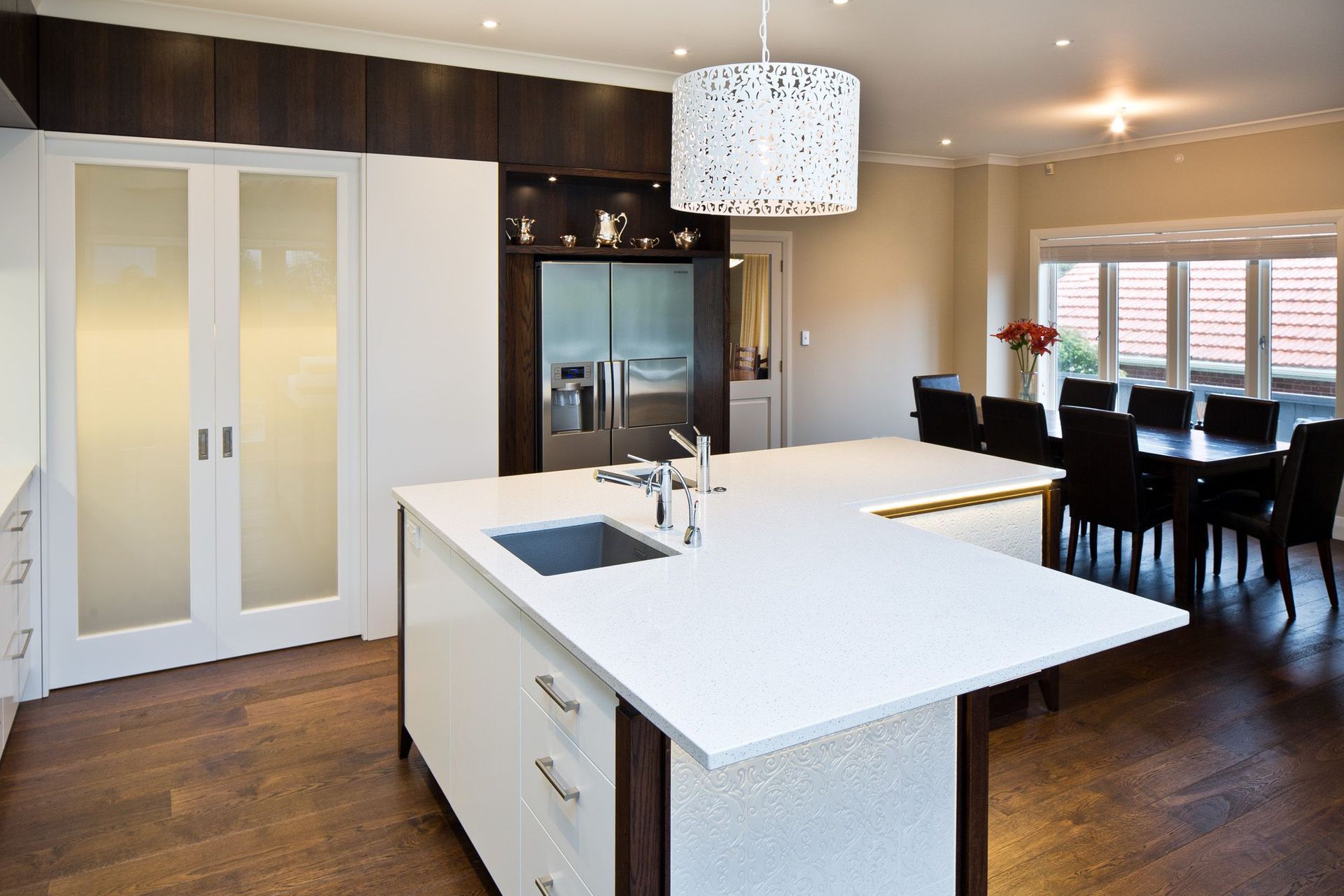 ArchiPro Project Summary - A beautifully reimagined kitchen in Wellington, featuring an innovative L-shaped island, hidden storage solutions, and a classic material palette that enhances functionality and flow while maintaining architectural sensitivity.