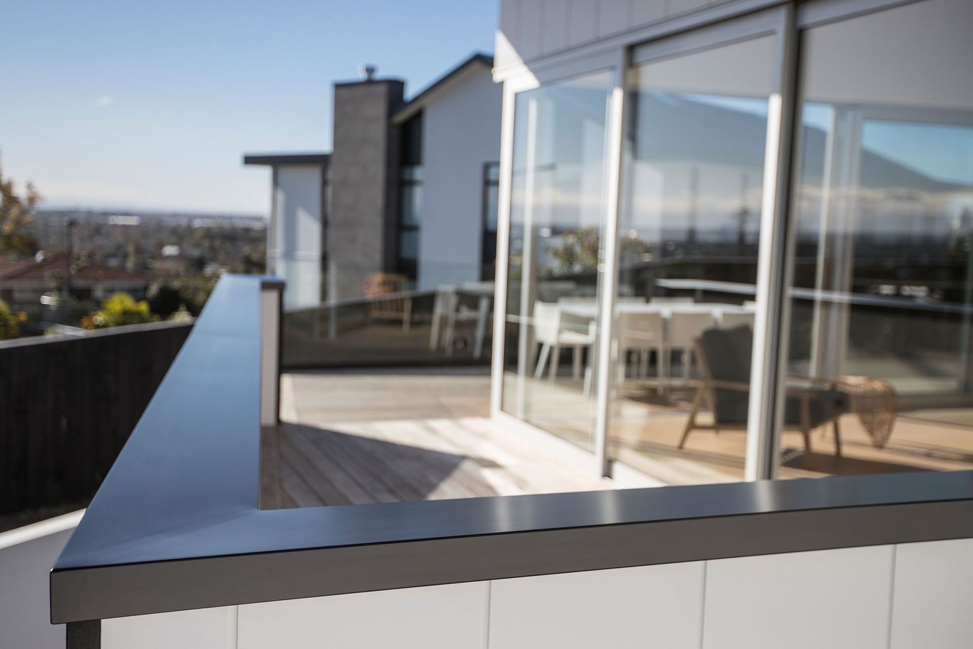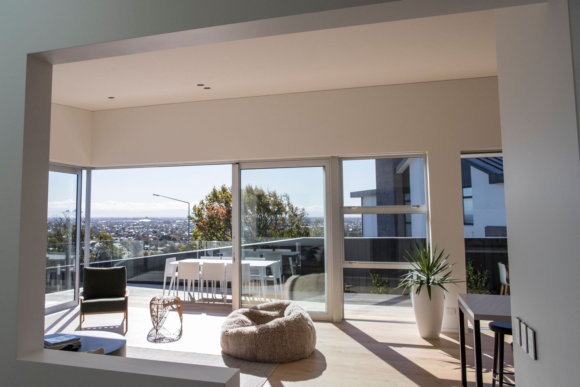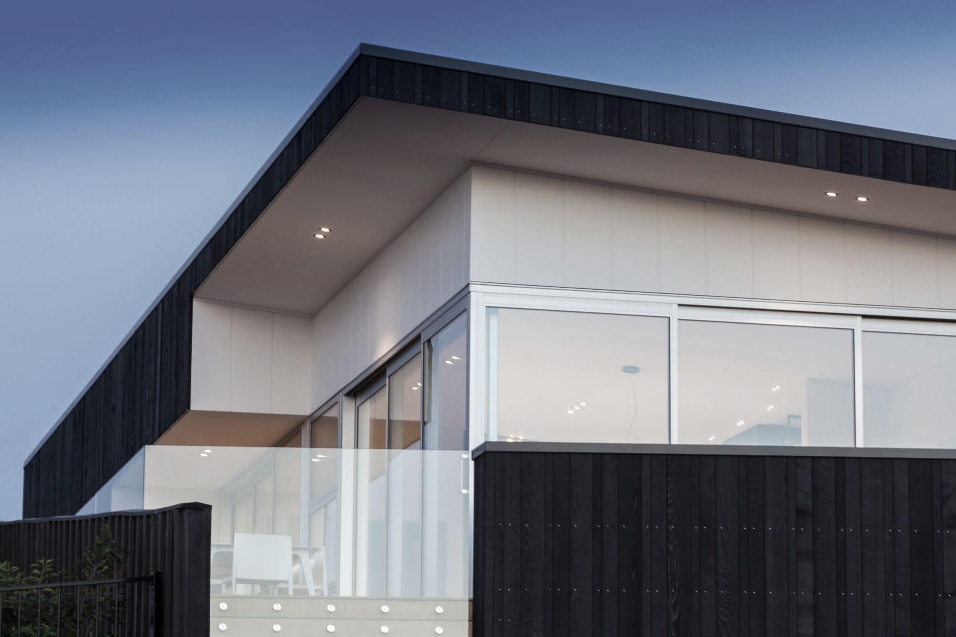 ArchiPro Project Summary - Award-winning four-bedroom home featuring a striking blend of vertical stained cedar and white Hardies Stria board, optimized views, bespoke joinery, and intimate living spaces, rising from the resilience of post-earthquake Christchurch.