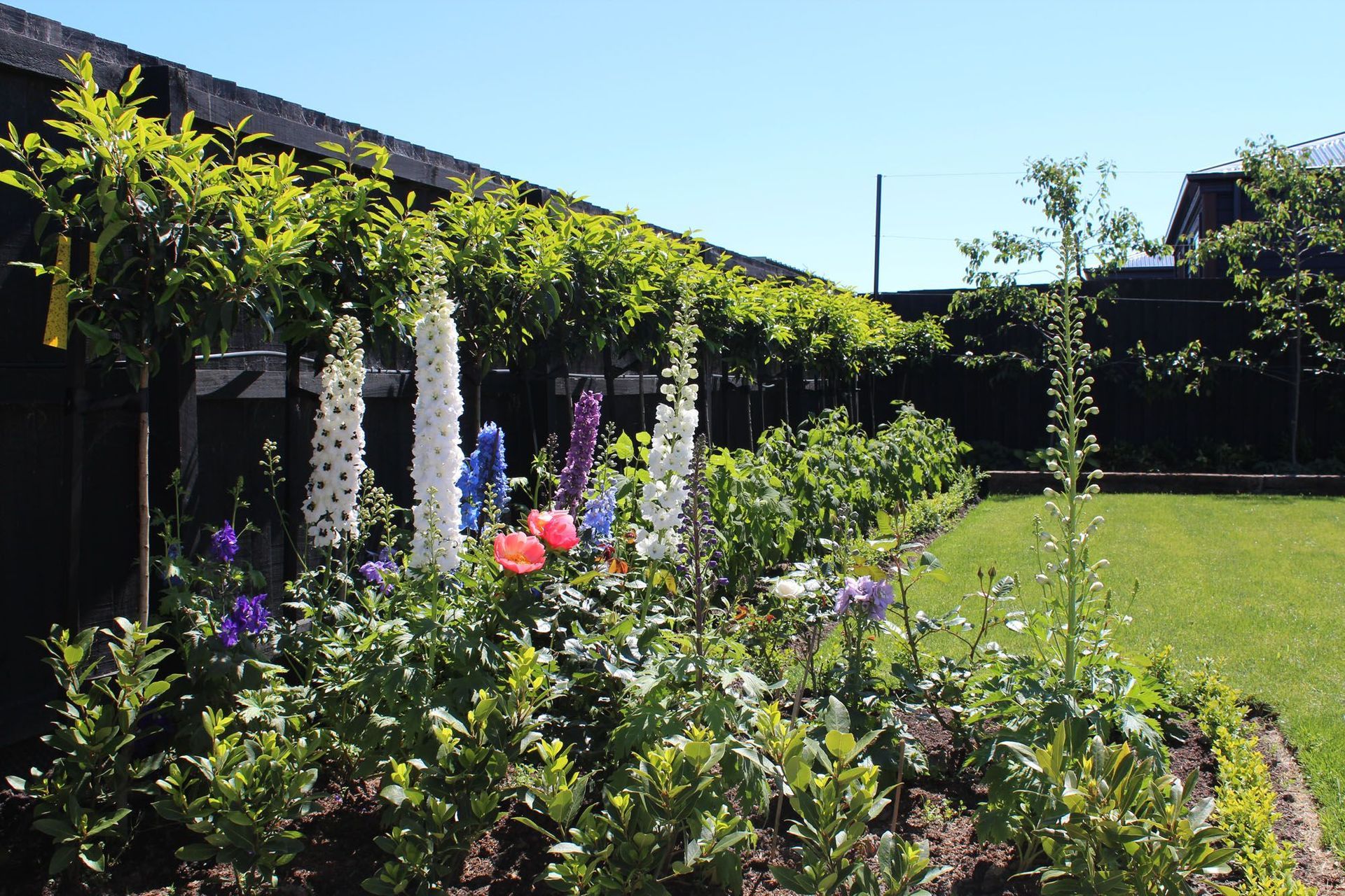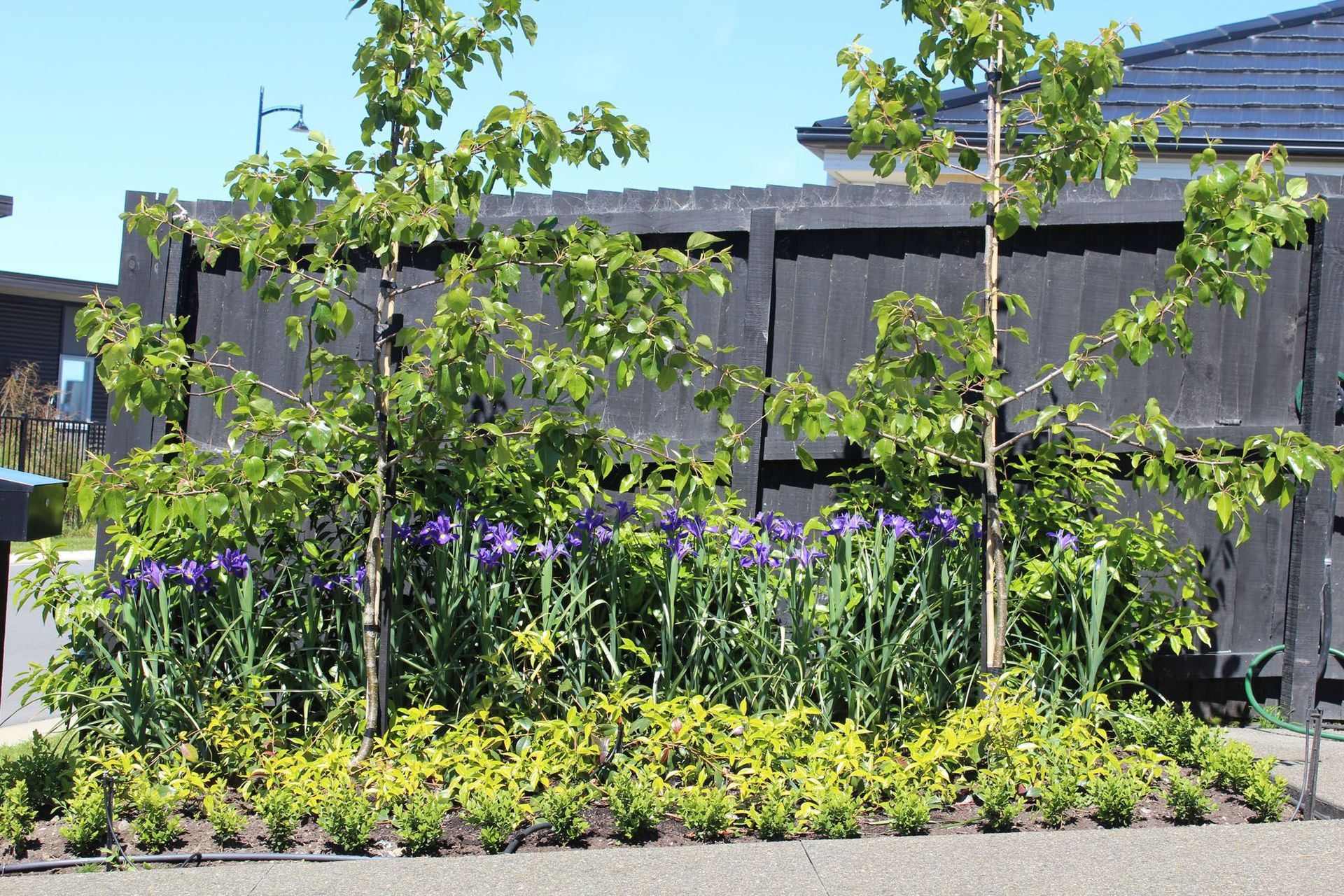 ArchiPro Project Summary - A thoughtfully designed garden at Lincoln Residence, featuring pleached Pyrus 'Bradford' for privacy on one boundary and Prunus lusitanica along the other, effectively screening the space from neighboring properties.