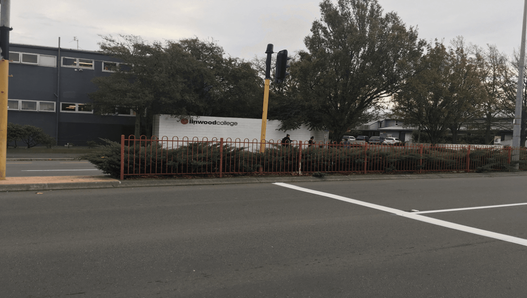 ArchiPro Project Summary - Pedestrian management solution at Linwood College, Christchurch, featuring effective fencing installation to enhance safety and encourage proper crossing usage, complemented by a striking red powdercoat finish that aligns with the college's branding.