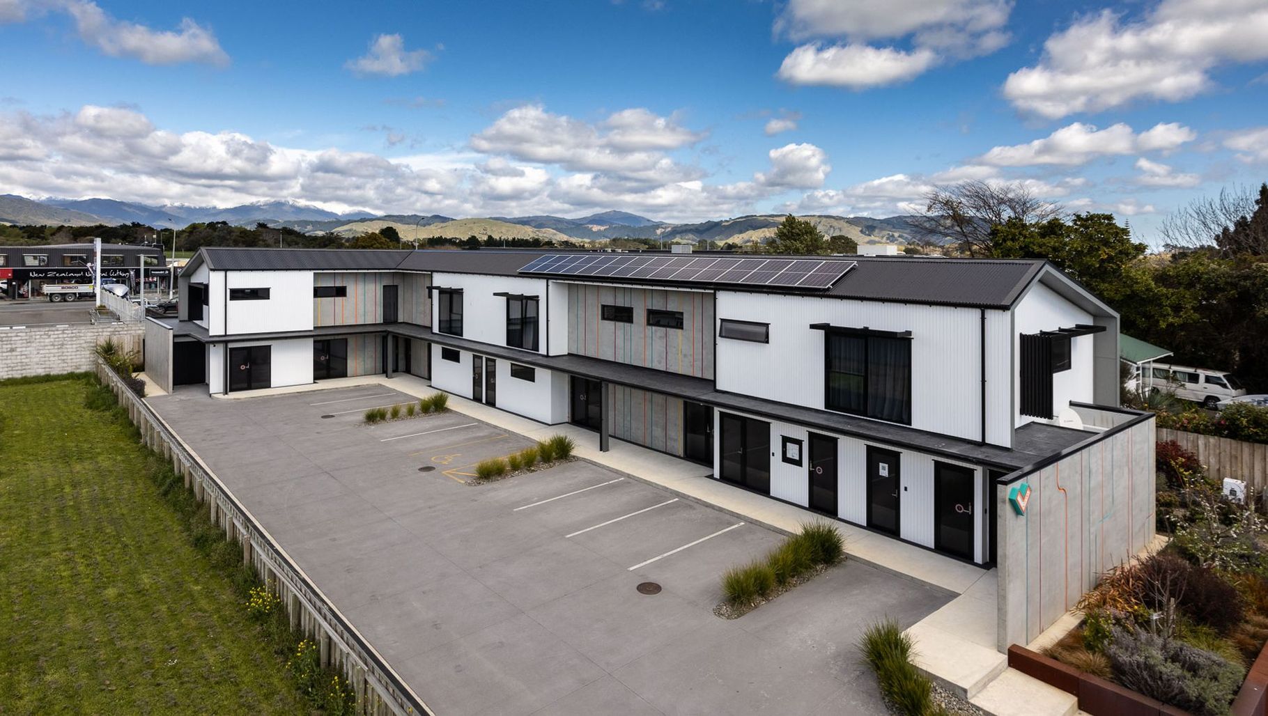 ArchiPro Project Summary - Littel Motel in Otaki features a reception-free, online booking system with 10 units, designed by Gil-plans architecture and constructed by Homestead Construction, showcasing low maintenance pre-cast concrete walls embossed with vibrant lines.