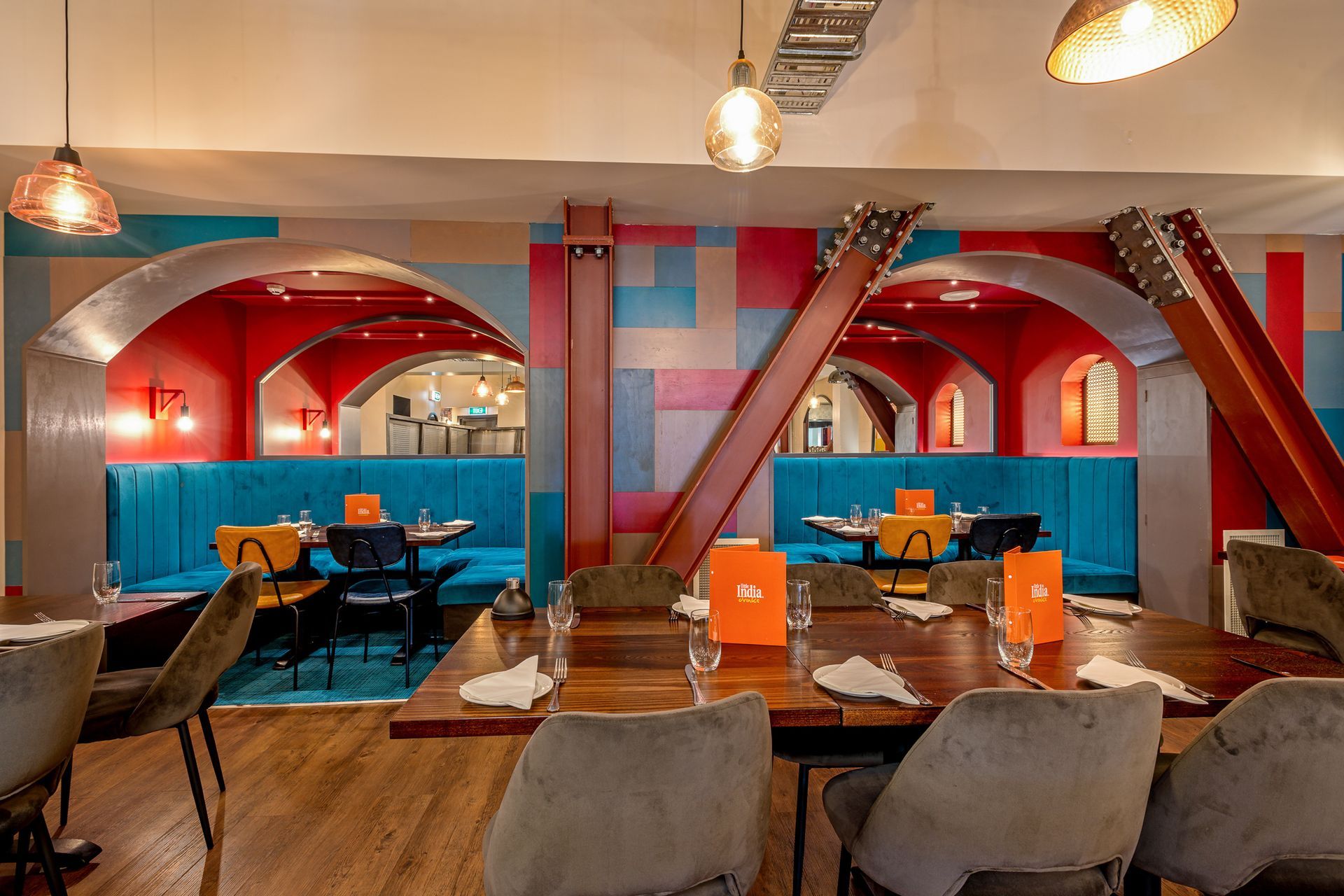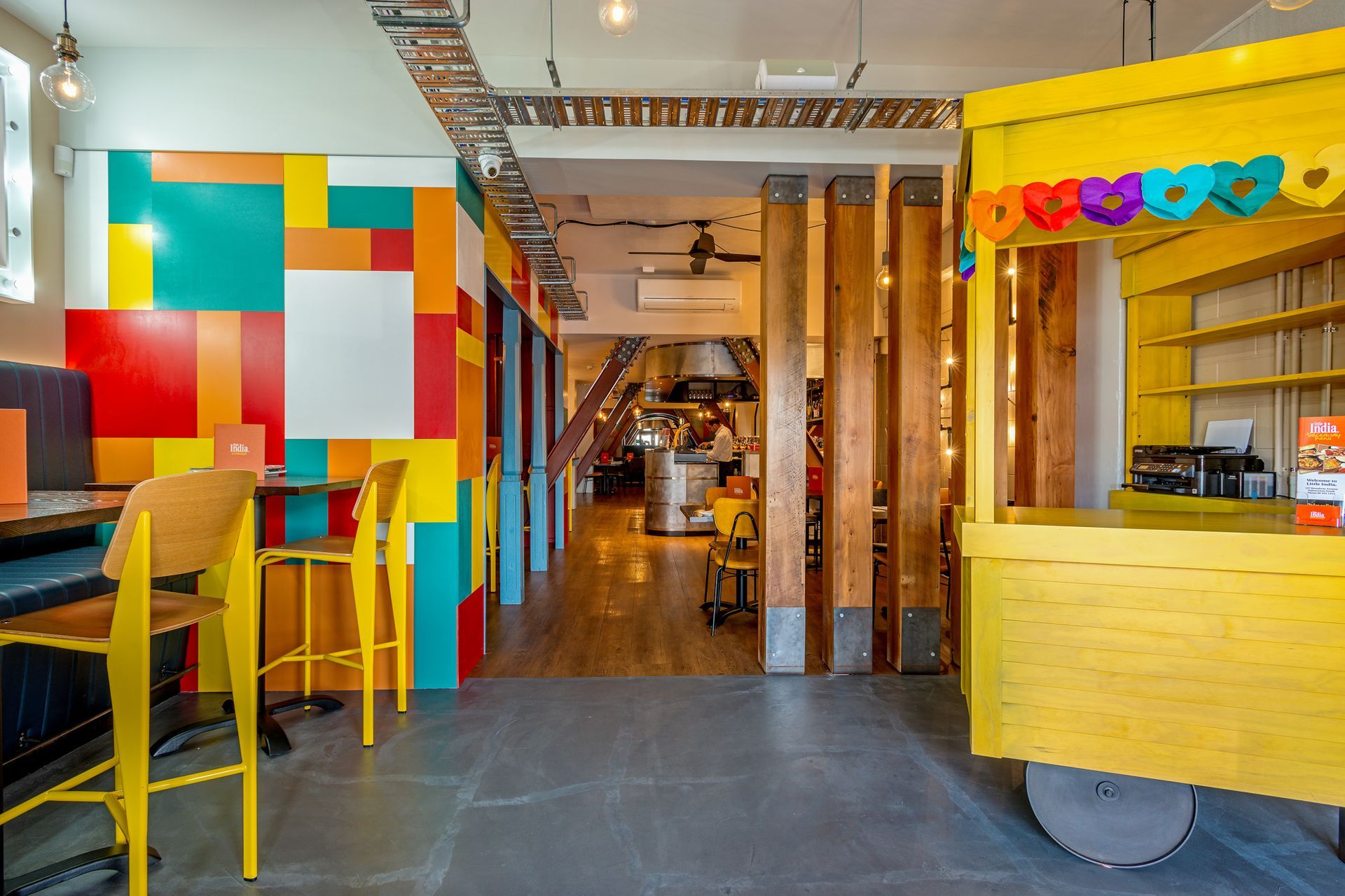 ArchiPro Project Summary - A vibrant commercial interior refit that harmonizes bold colors, textures, and an industrial layout, enhancing customer experience while complementing earthquake strengthening efforts.