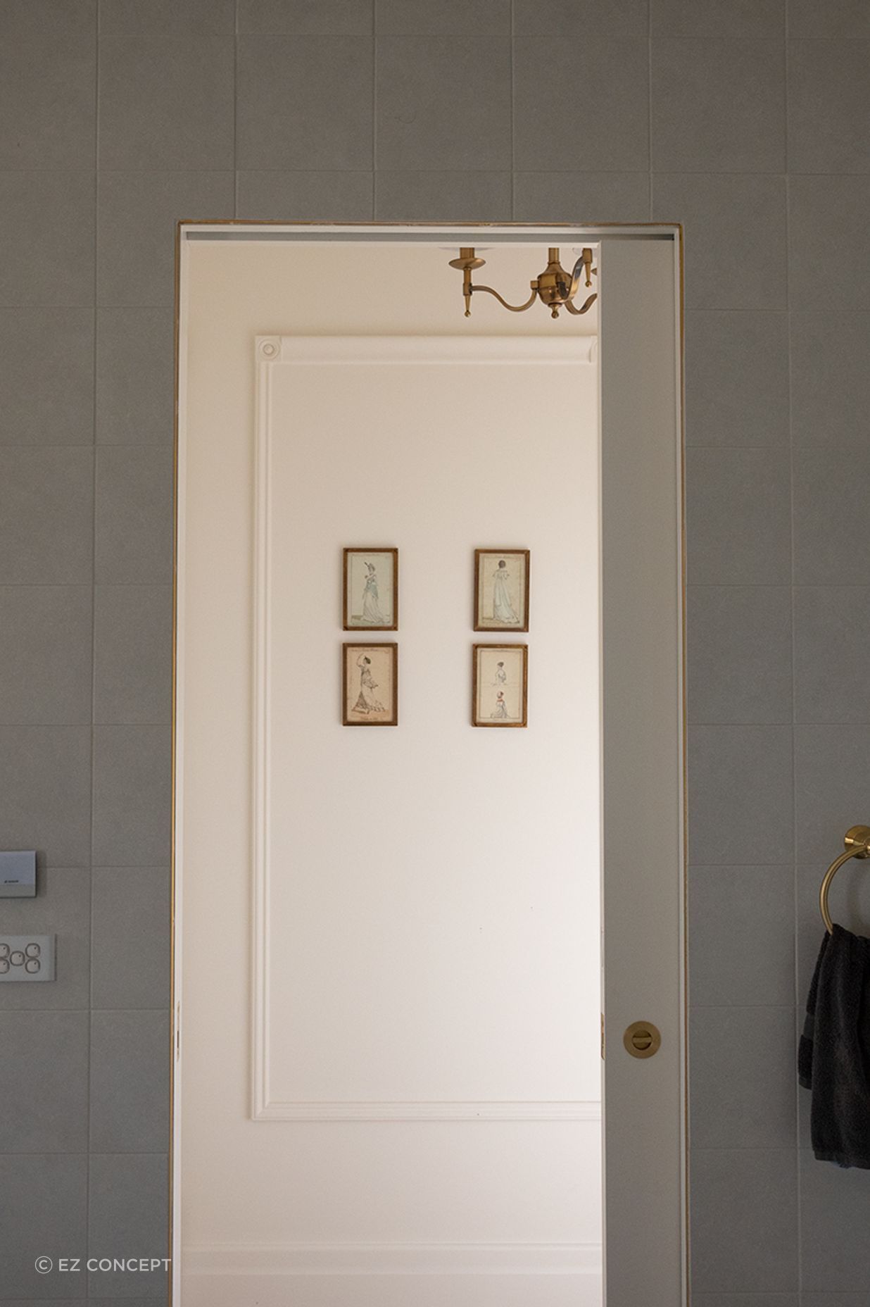 In the children’s bathroom, natural light enhances the room’s vivid feel. EzyJamb Single Rebate frame is utilised here to quietly expand the sense of space and reduce visual clutter. Without the presence of architraves, the room’s finer details, such as gold fixtures and intricate tiling, stand out with clarity and charm.