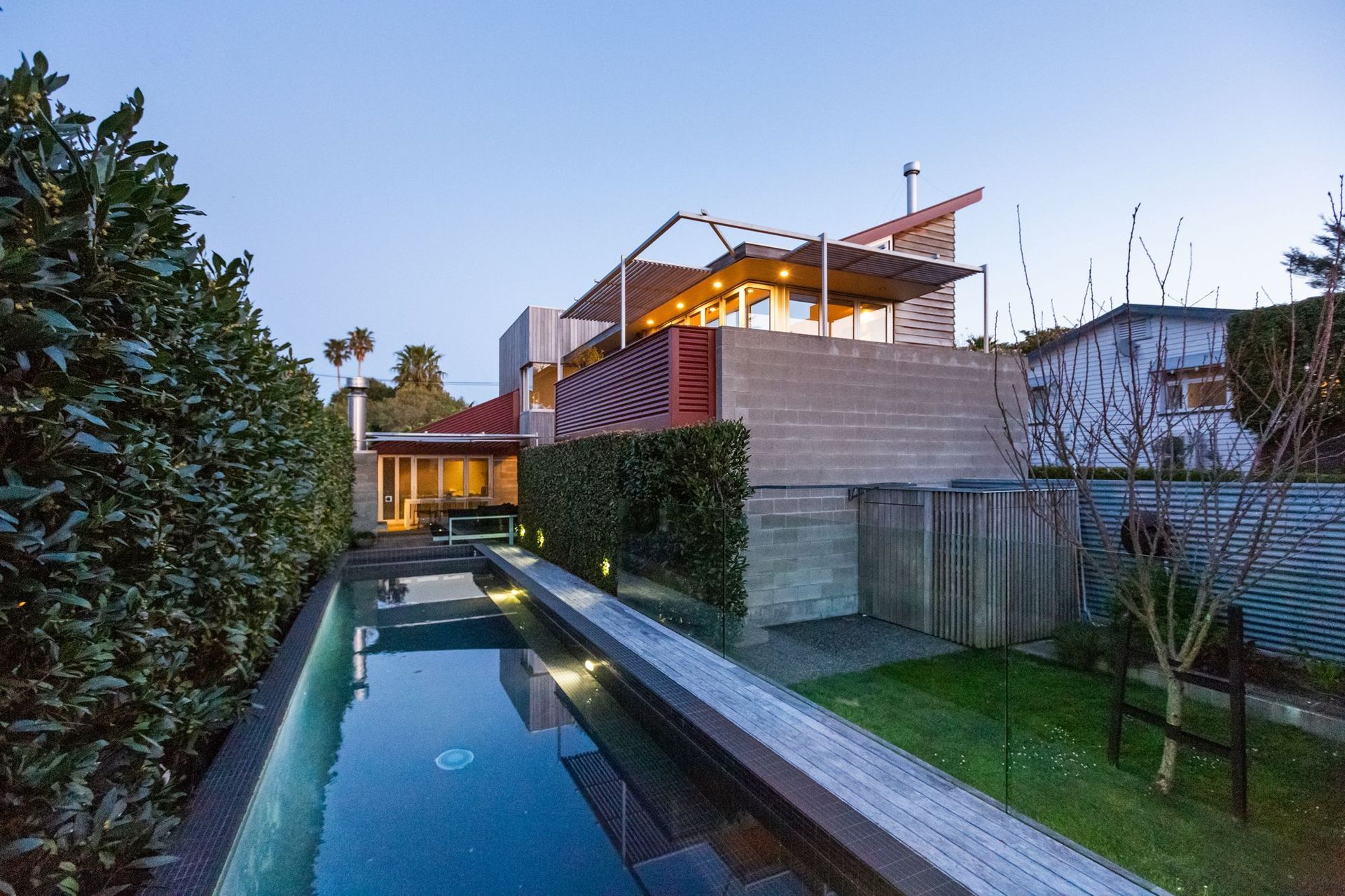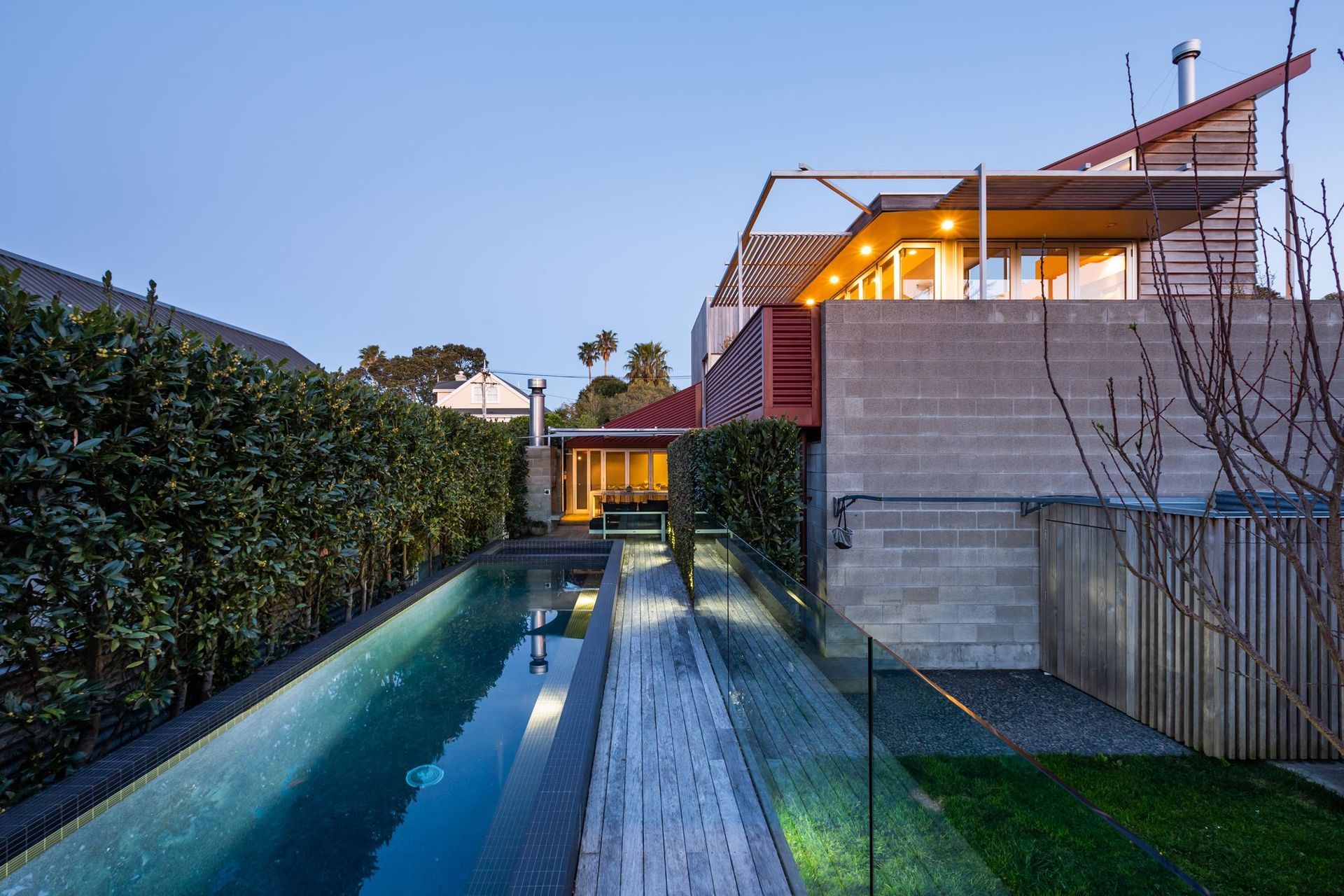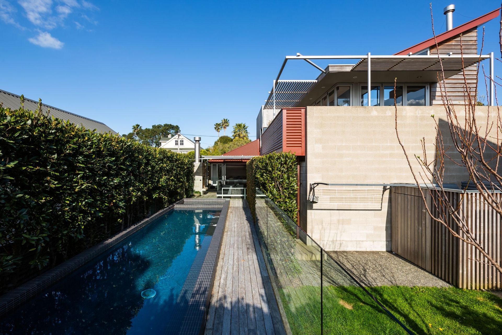 ArchiPro Project Summary - Landscaping enhancement for a Westmere townhouse featuring a concrete swimming pool, spa, outdoor fireplace, and timber decks, designed to complement the original architecture by Felicity Wallace.
