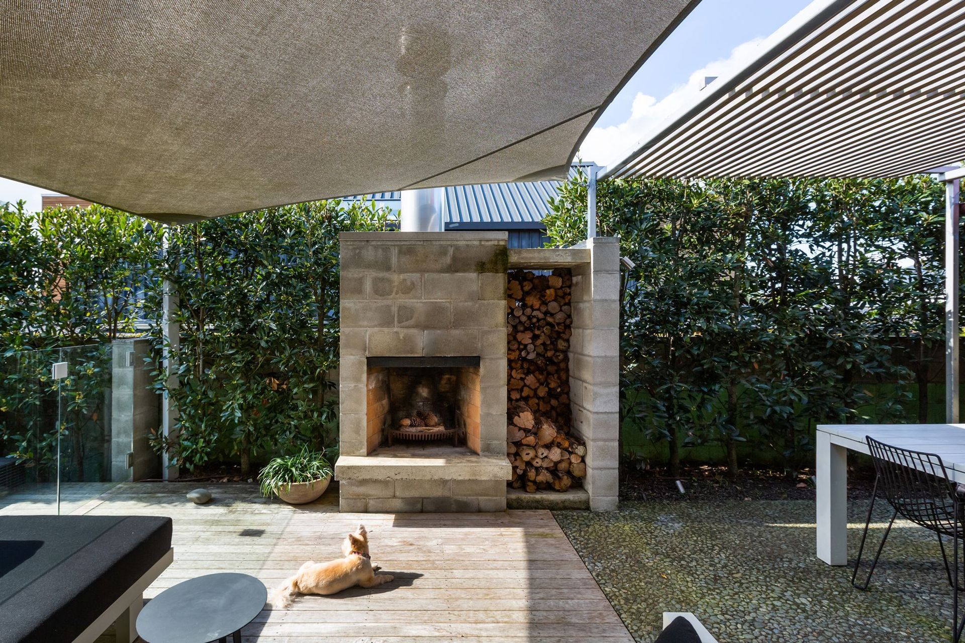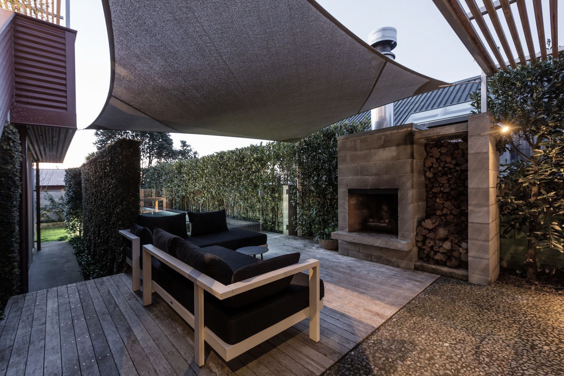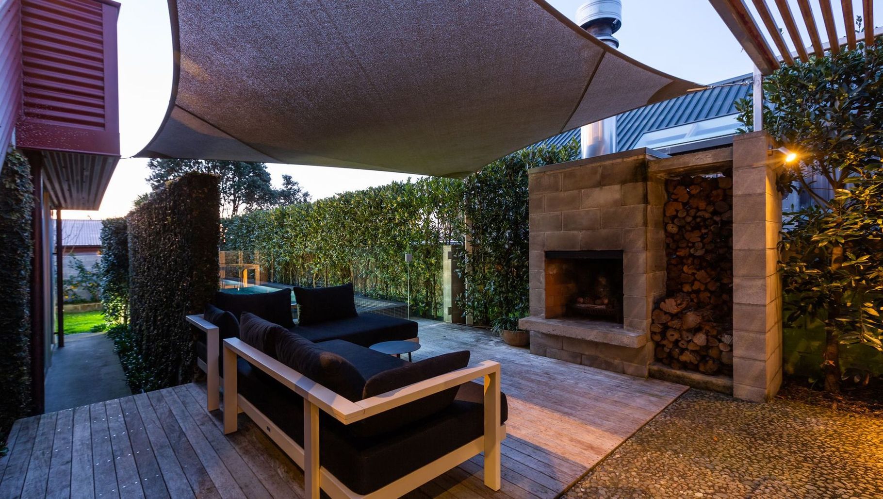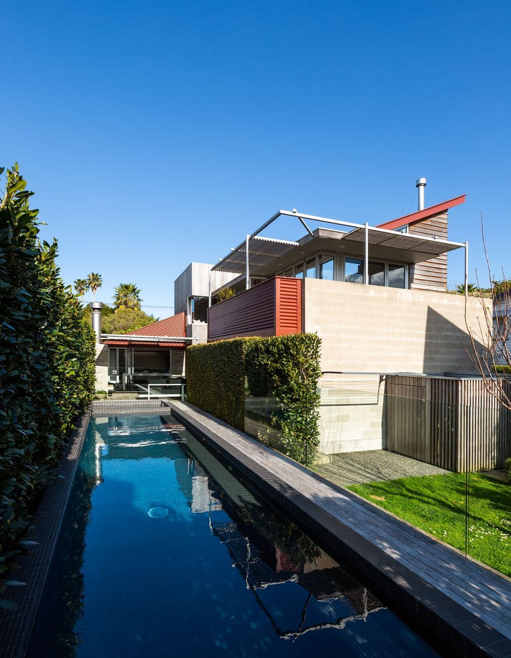ArchiPro Project Summary - Landscaping enhancement for a Westmere townhouse featuring a concrete swimming pool, spa, outdoor fireplace, and timber decks, designed to complement the original architecture by Felicity Wallace.