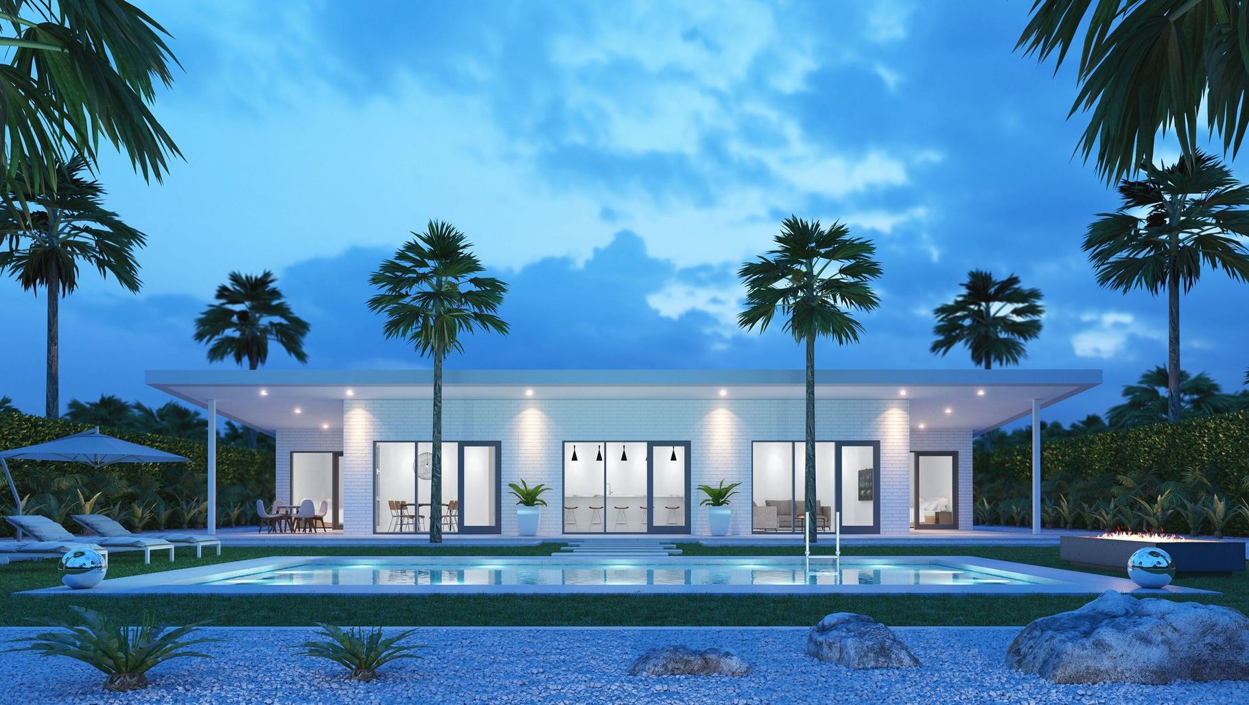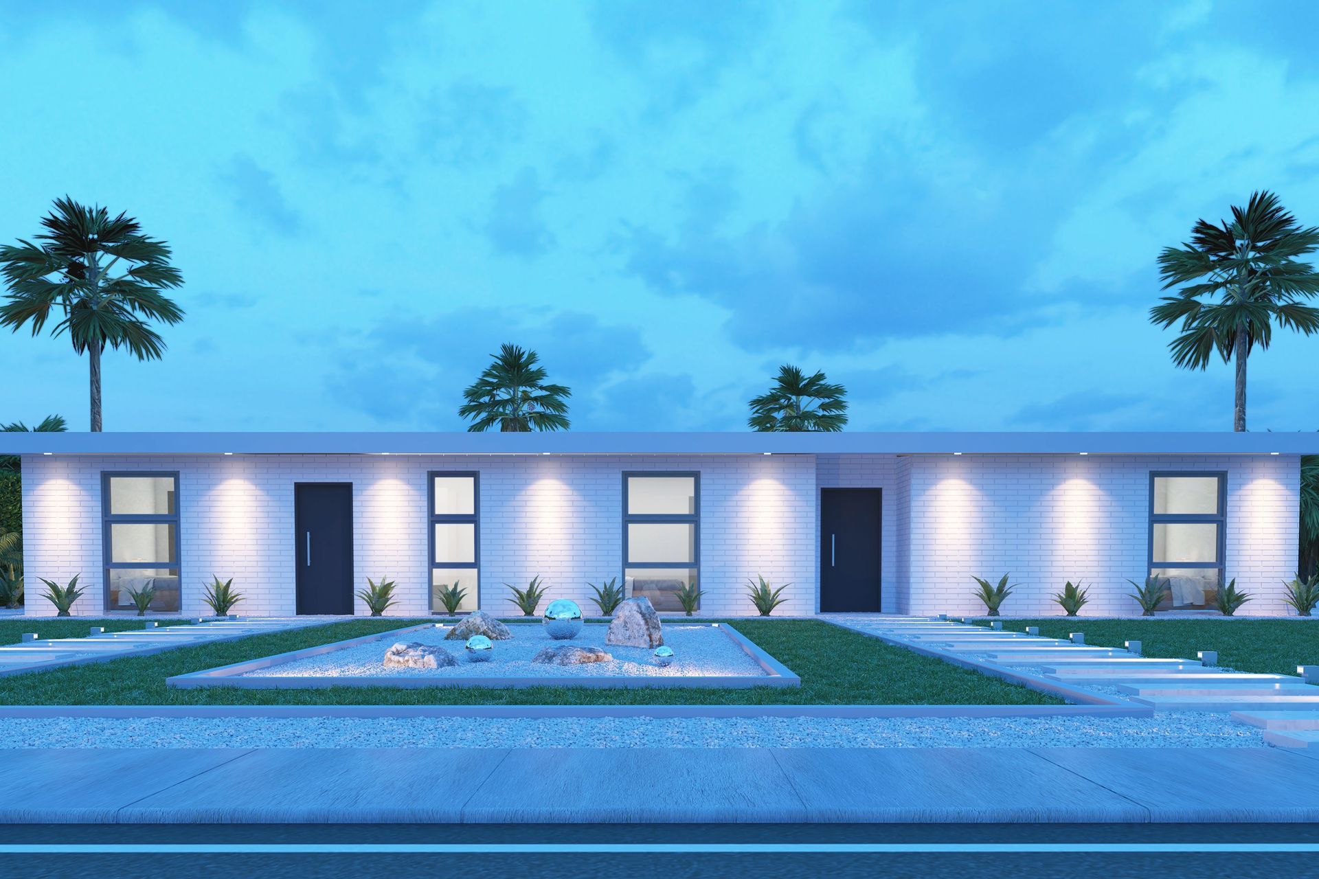 ArchiPro Project Summary - A modern 3-bedroom house inspired by Palm Springs, featuring a minimalistic design, strategically positioned to maximize sunlight with a north-facing pool area, complemented by 3D elevations showcasing all sides of the property.