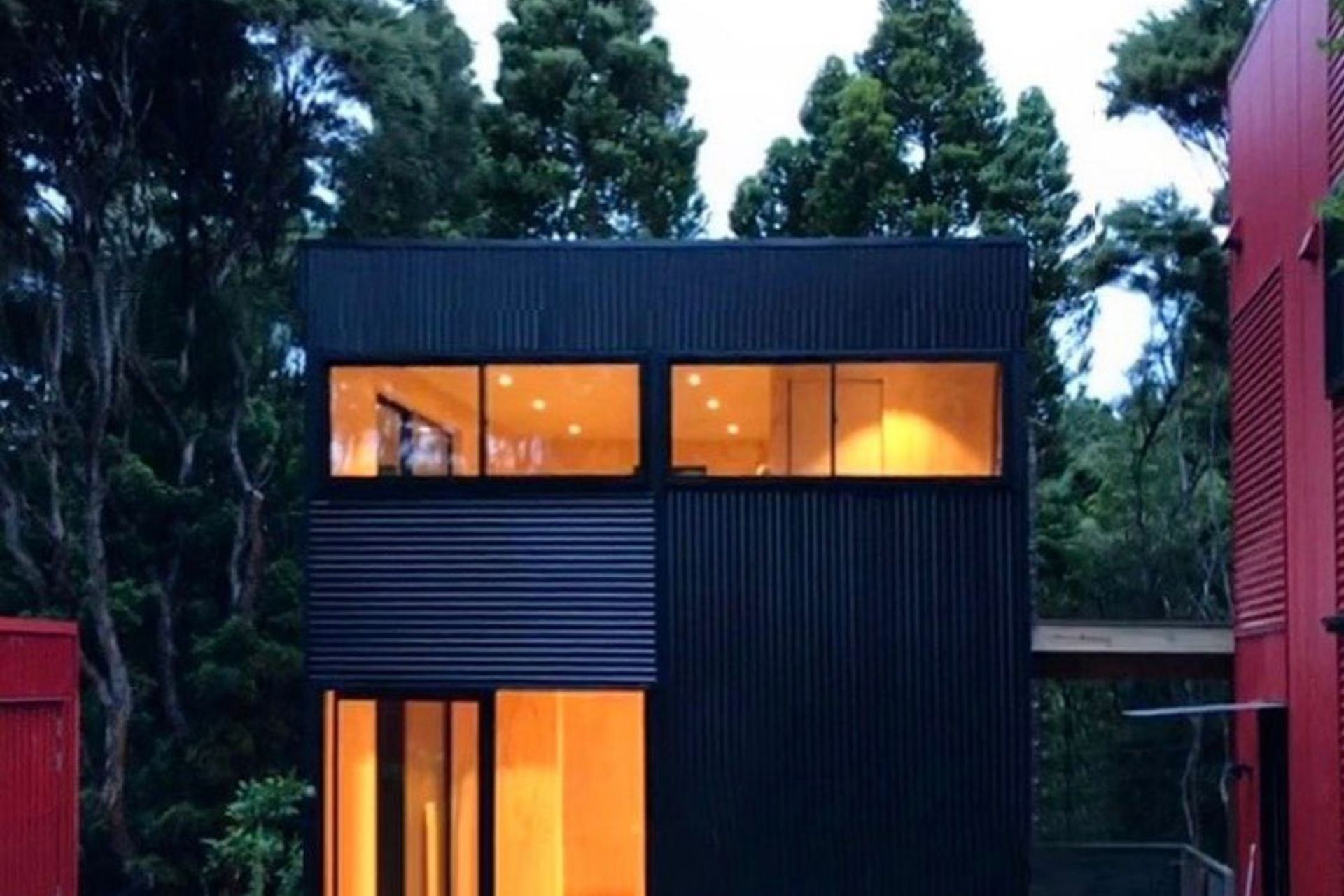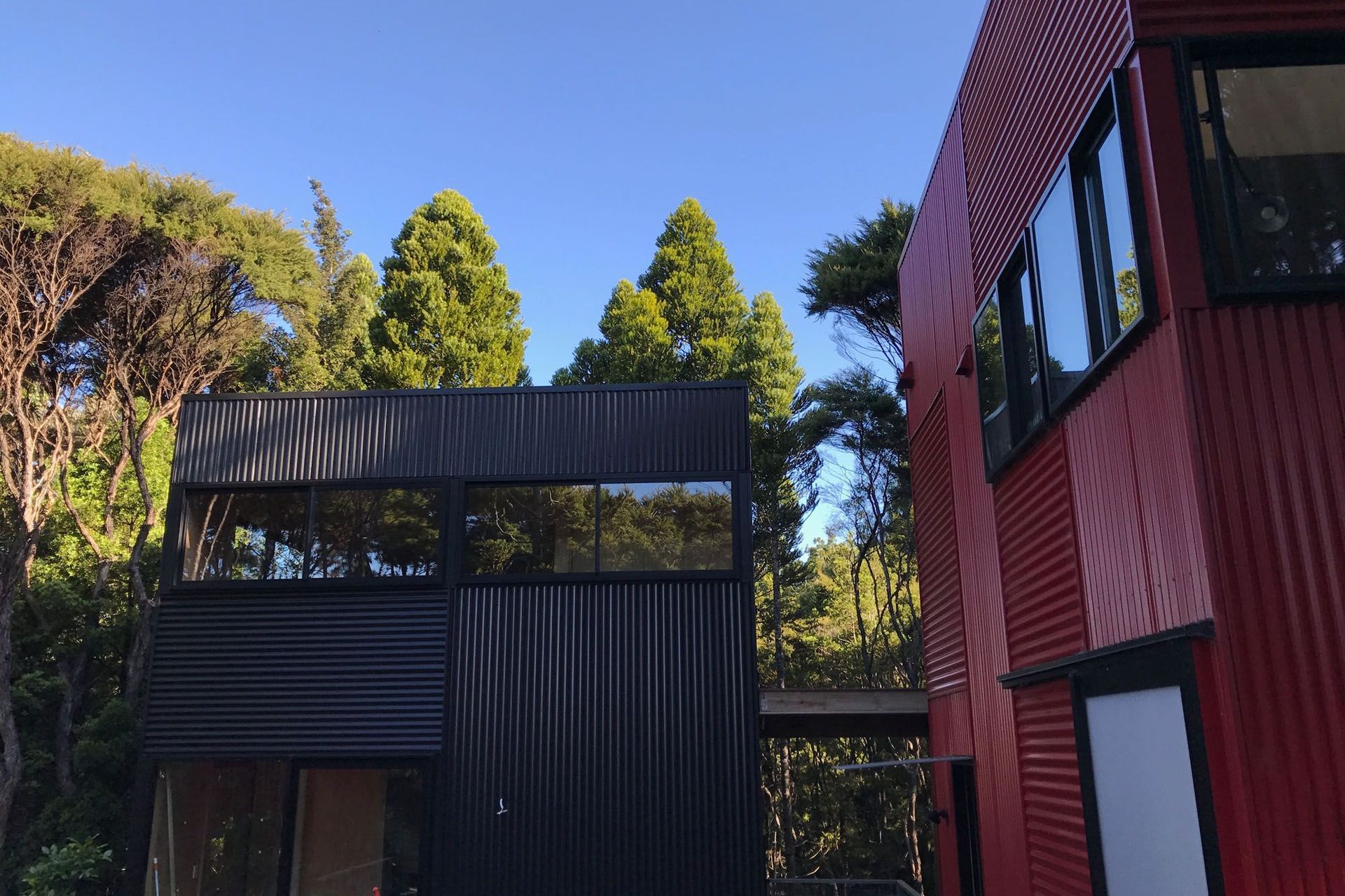 ArchiPro Project Summary - A stunning black architectural home in Titirangi, designed for family enjoyment, featuring lift access to both dwellings and a unique apprenticeship opportunity that fostered team growth.