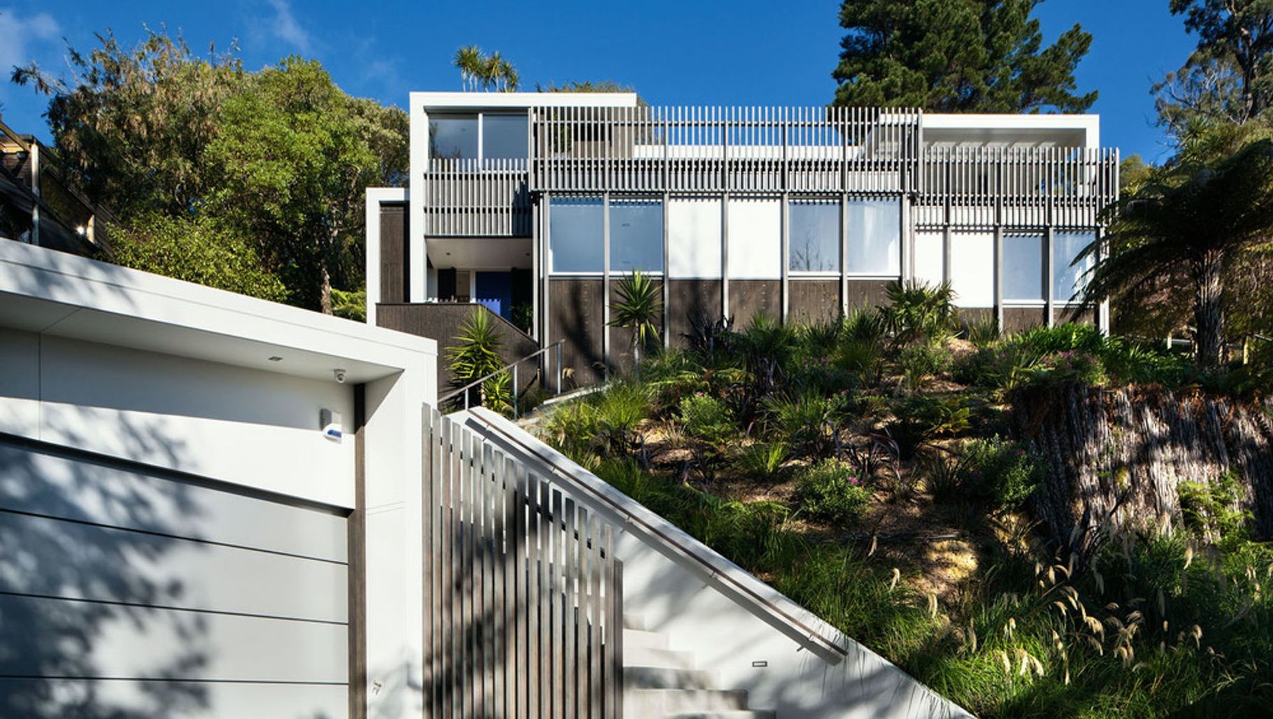 ArchiPro Project Summary - A harmonious blend of social living and natural surroundings, Lowry Bay House features a spacious living area and outdoor deck, seamlessly integrated into the hillside with a unique architectural character that complements the lush environment.