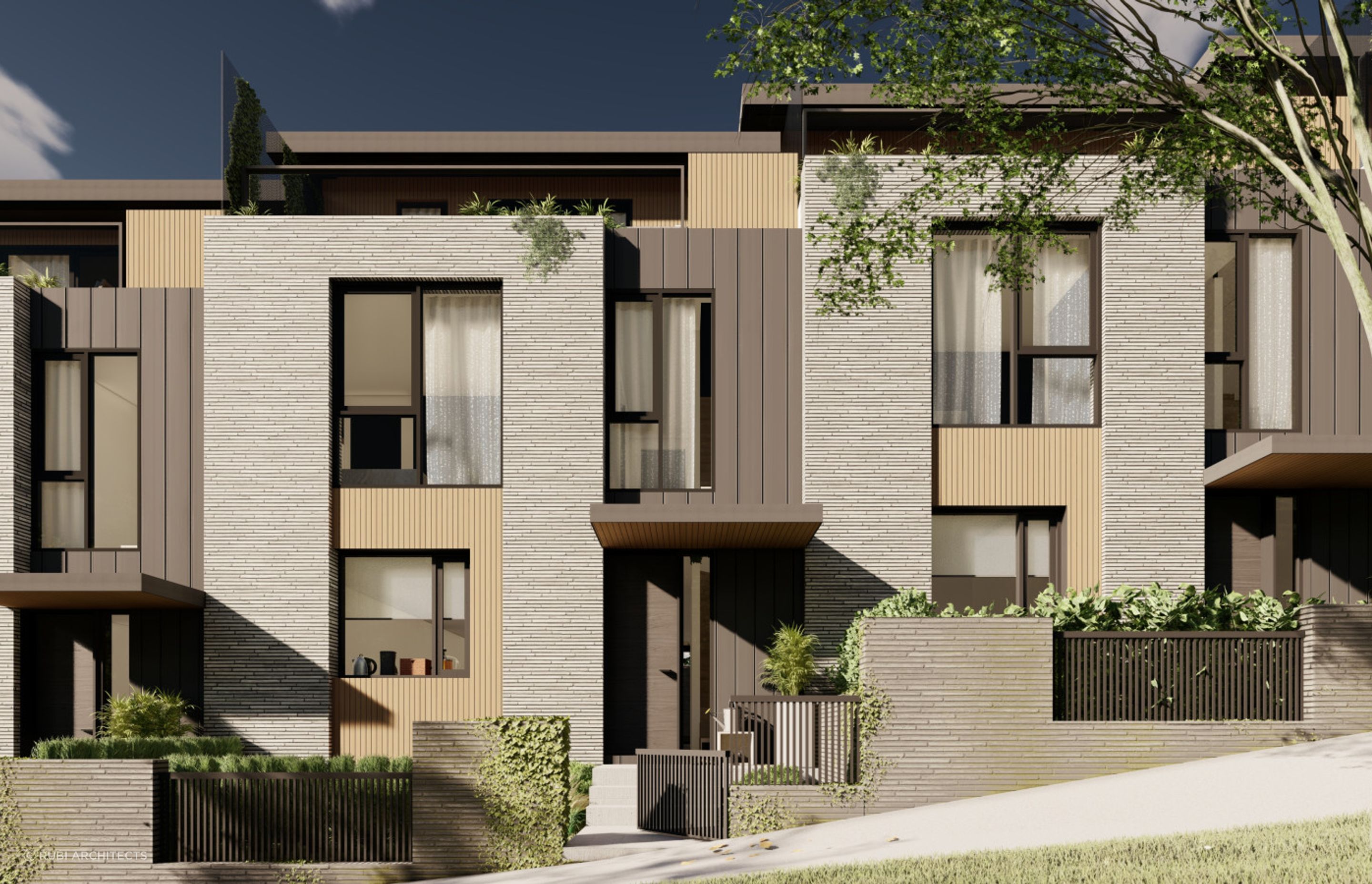 ArchiPro Project Summary - Luxury townhouses in Oak Park featuring five spacious three-bedroom dwellings, designed by RUBI Architects, blending contemporary urban architecture with natural materials for an upscale living experience close to amenities and the city.