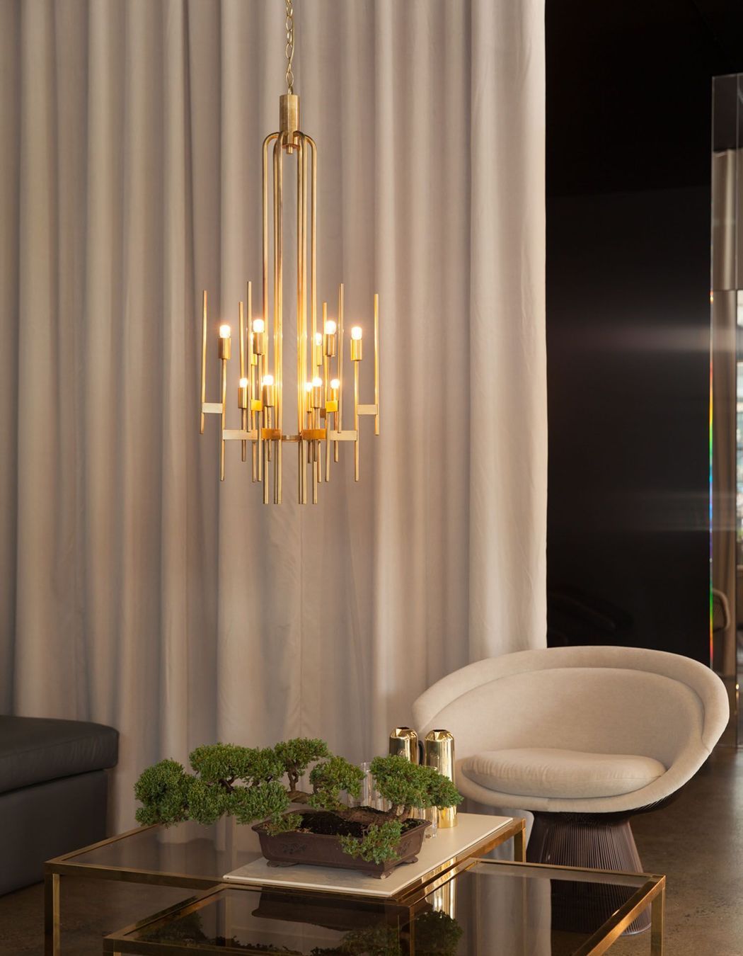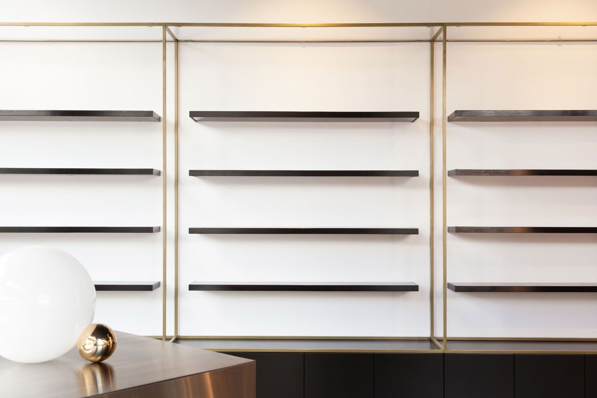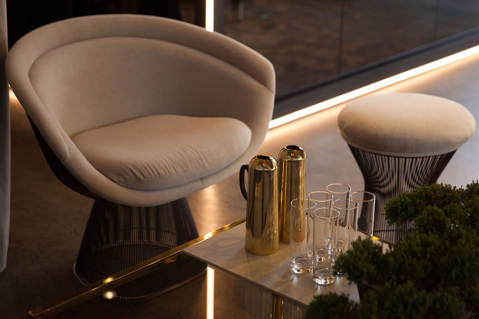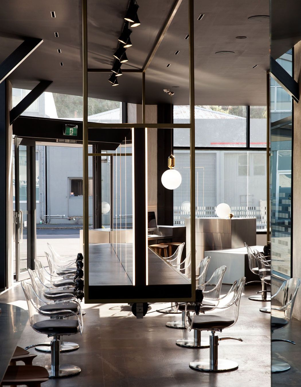 ArchiPro Project Summary - A striking transformation of an art gallery into a high-end hair salon, featuring sculptural design elements, reflective materials, and a carefully curated lighting scheme that enhances the atmosphere and creates private enclaves.