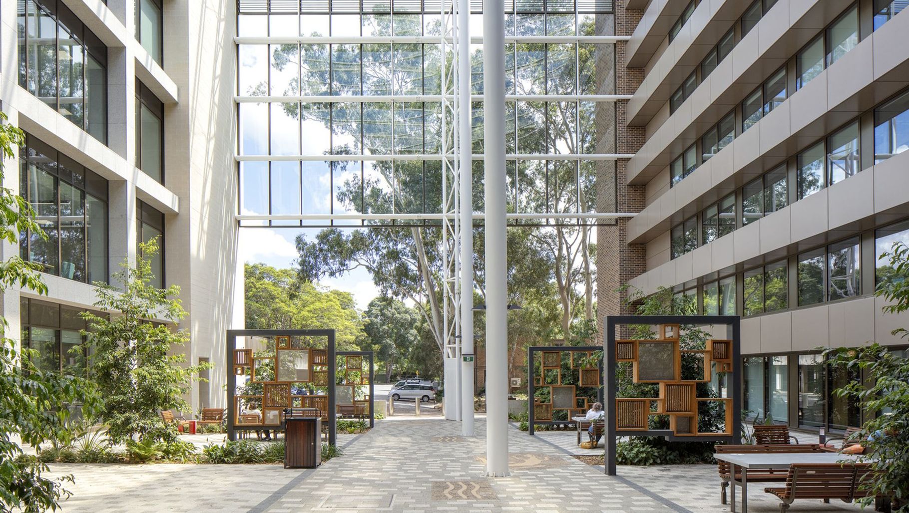 ArchiPro Project Summary - Upgraded public domain precincts at Macquarie University enhance connectivity and foster a vibrant academic environment, featuring innovative outdoor spaces, smart technology, and a focus on faculty identity within a natural setting.