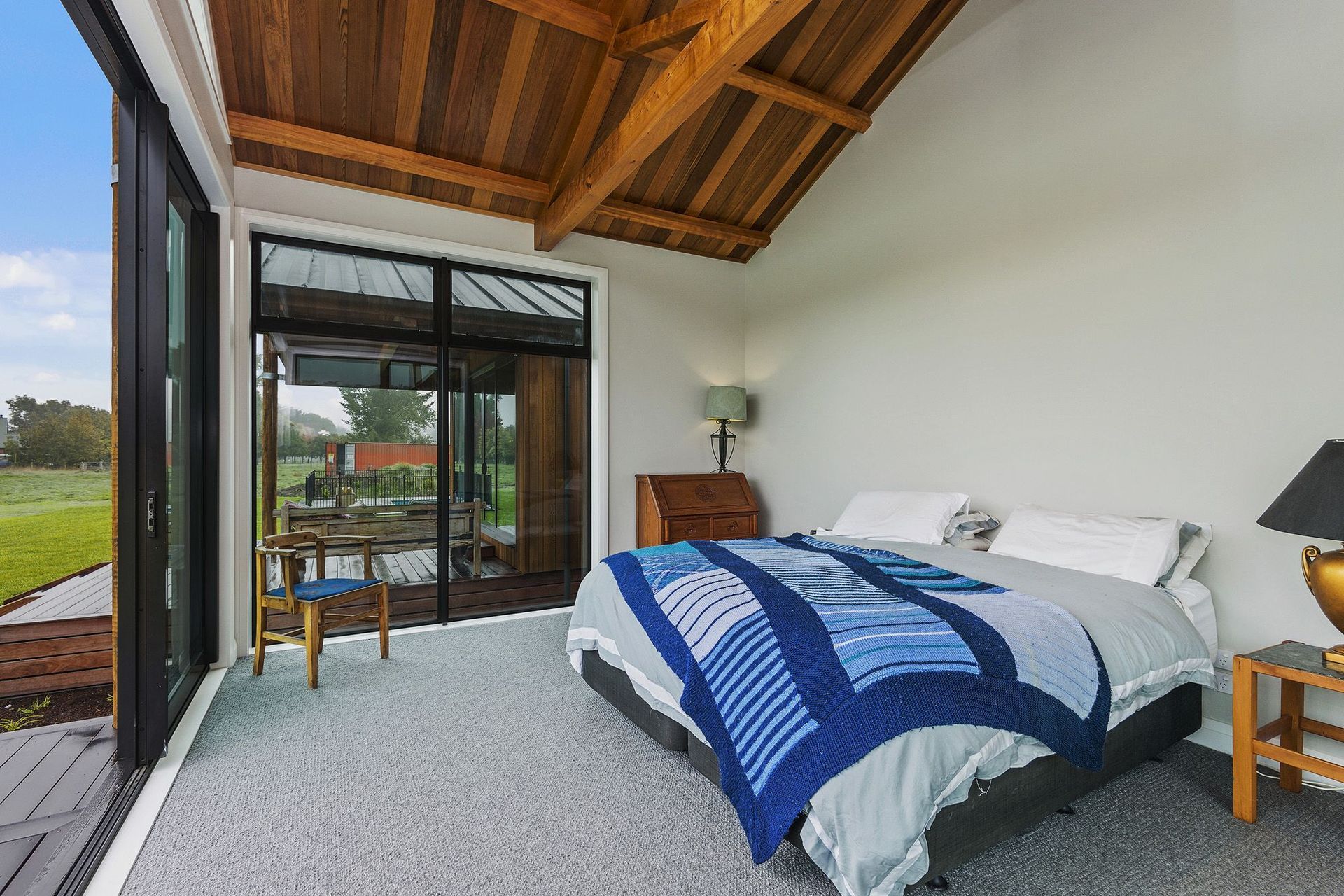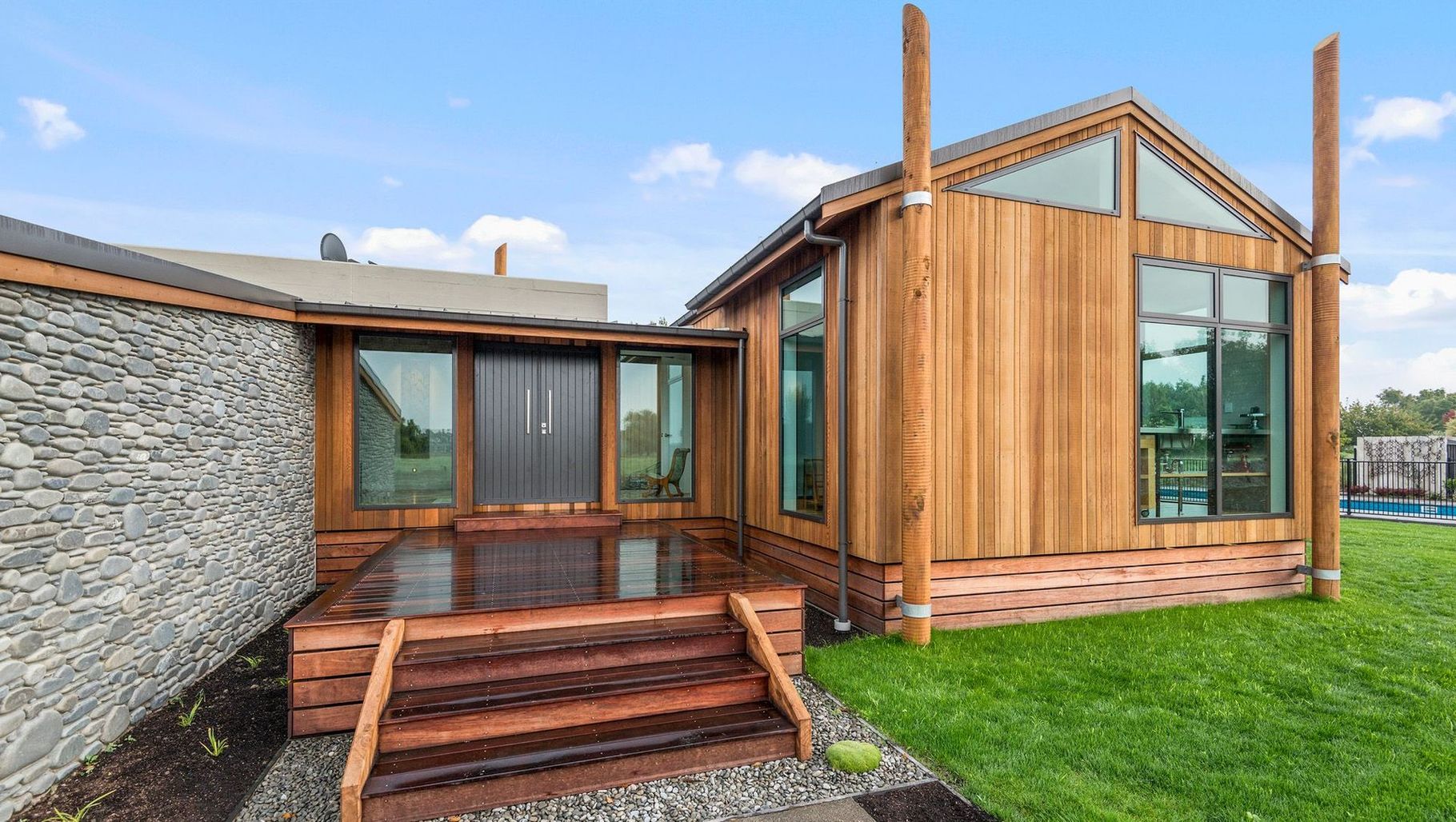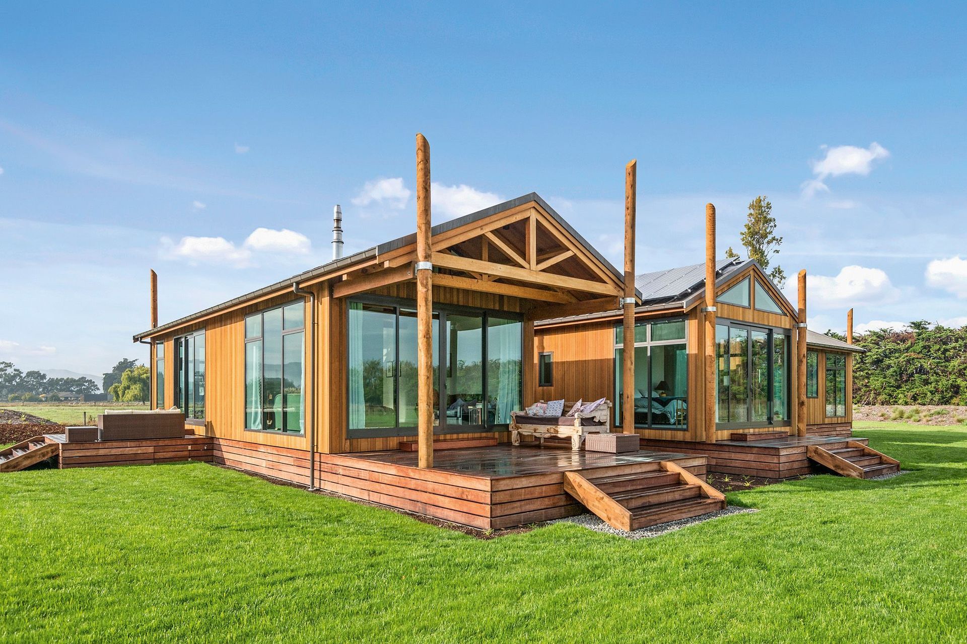 ArchiPro Project Summary - A stunning Maimai-inspired home featuring handmade Macrocarpa trusses, a robust cast-in-situ concrete spine wall, elegant cedar ceilings and claddings, oak flooring, handpicked river stone accents, and a lodge-style kitchen with a striking stainless steel bench. Winner of a House of the Year Gold Award.