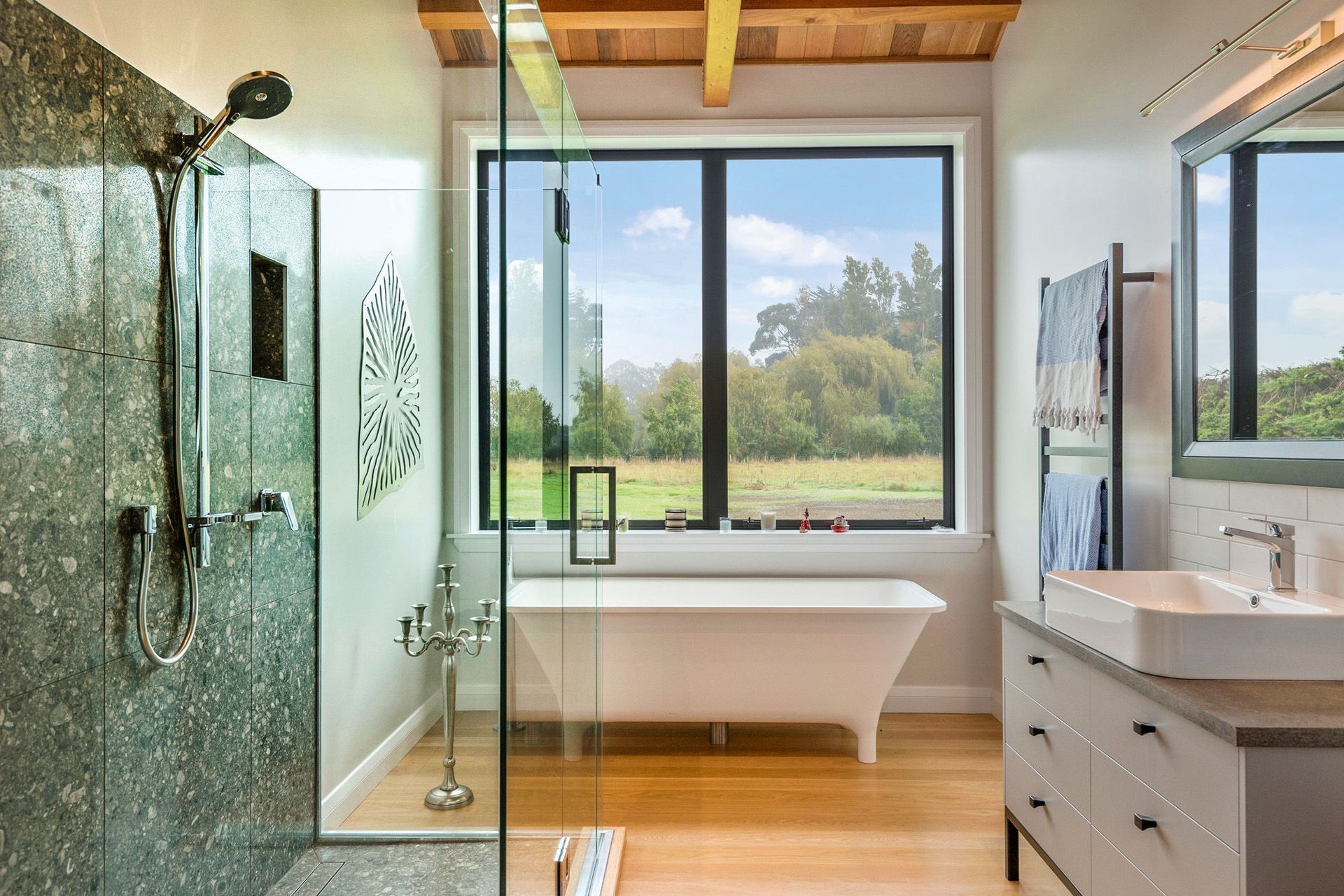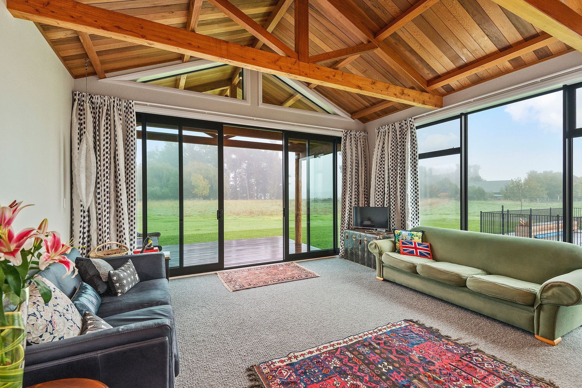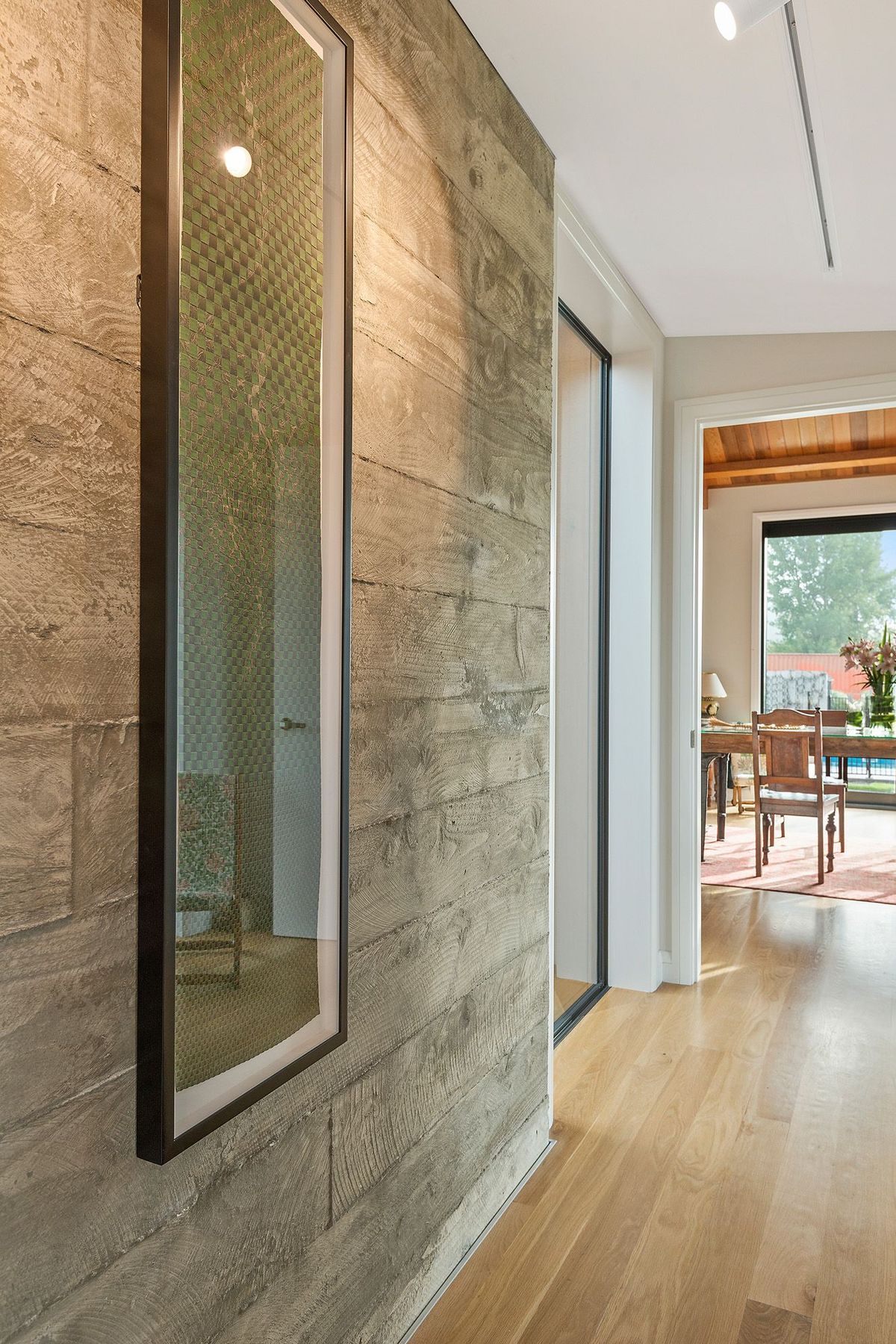 ArchiPro Project Summary - A stunning Maimai-inspired home featuring handmade Macrocarpa trusses, a robust cast-in-situ concrete spine wall, elegant cedar ceilings and claddings, oak flooring, handpicked river stone accents, and a lodge-style kitchen with a striking stainless steel bench. Winner of a House of the Year Gold Award.