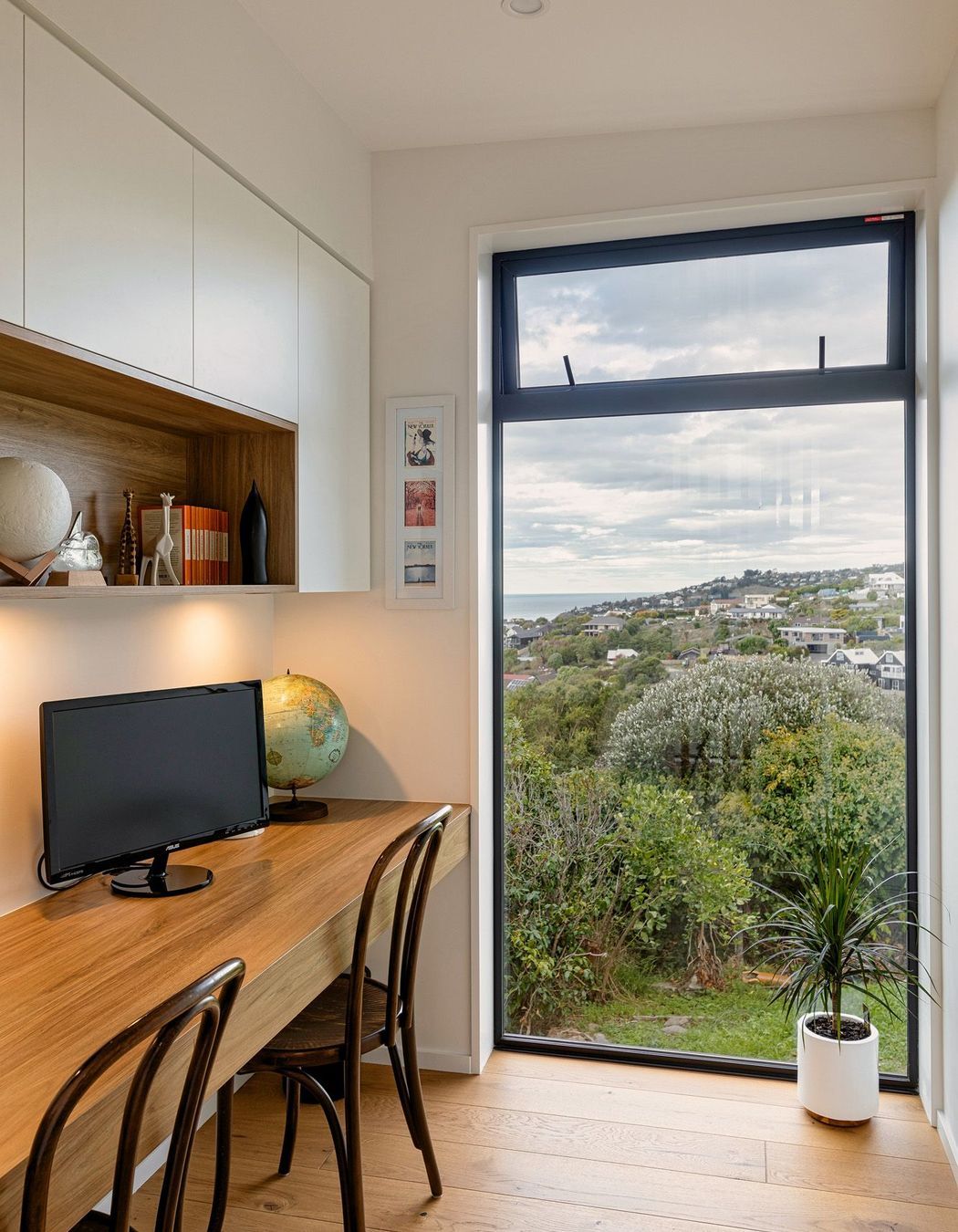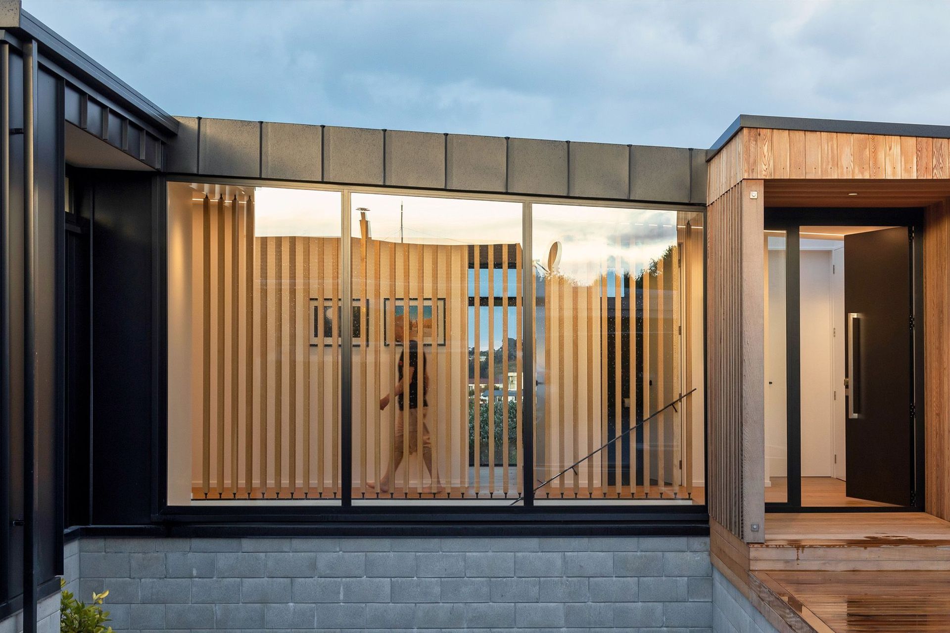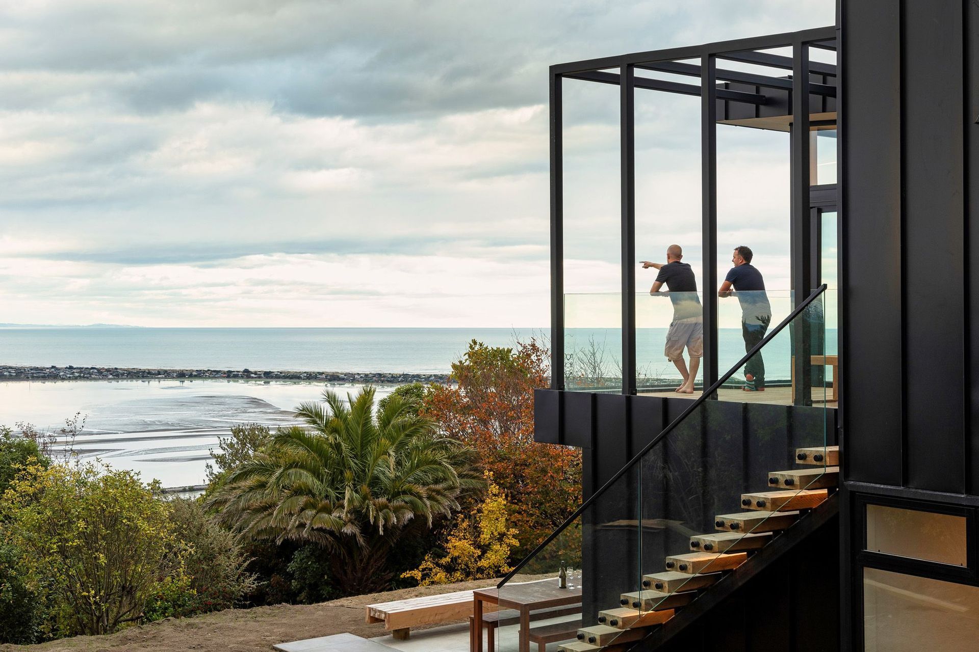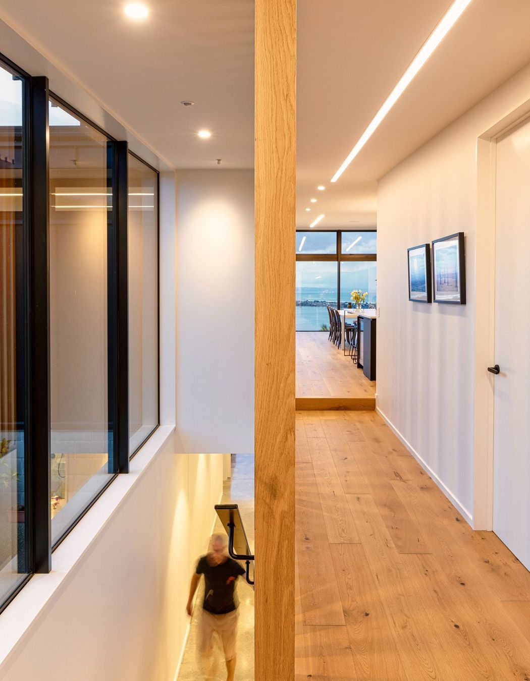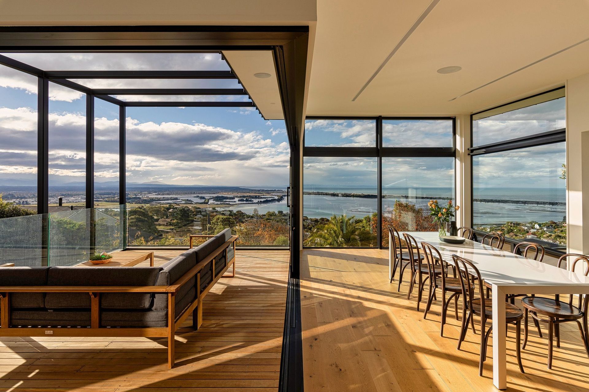 ArchiPro Project Summary - A thoughtfully designed residence featuring a single pitch sloping roof that harmonizes with the natural terrain, offering stunning views of the Kaikoura ranges and the ocean, while creating a gradual reveal of space and light as one moves through the home.
