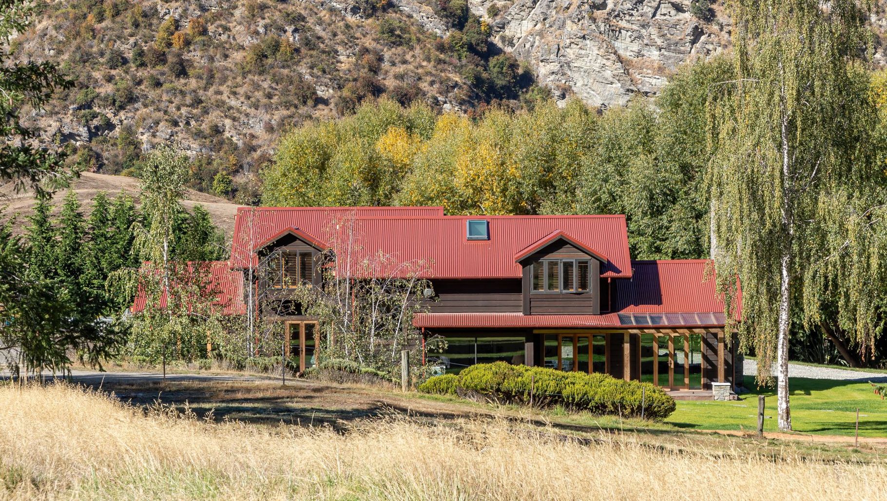 ArchiPro Project Summary - Classic home featuring dark chocolate timbers and a striking red roof, completed in 2023 for client Kim Pham, showcasing exquisite craftsmanship and thoughtfully designed interiors by Queenstown Interiors.