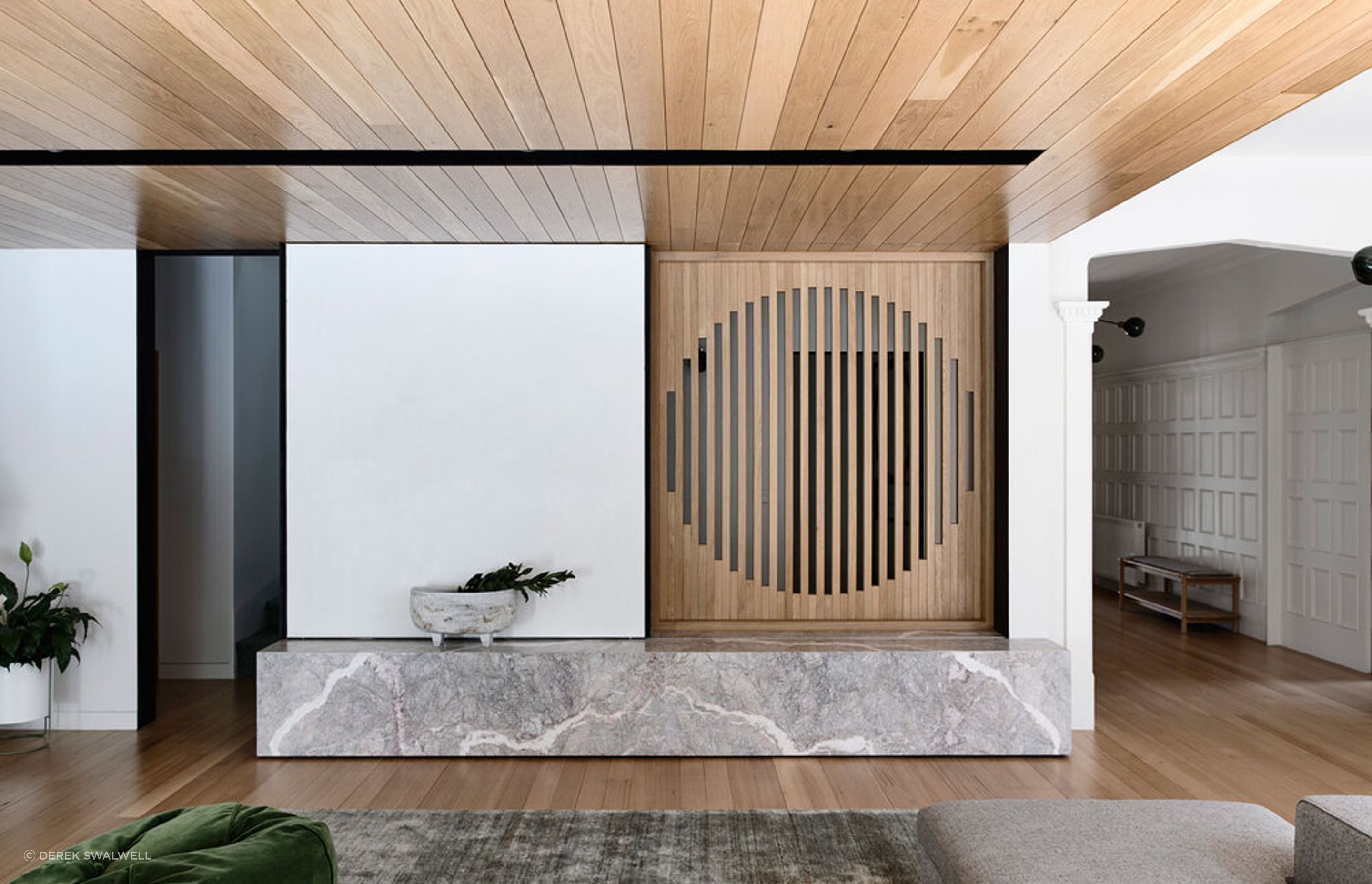 Malvern Garden House celebrates the contrast of heavy and solid materials like concrete and brick with soft, organic forms such as natural materials and the garden itself. The living room showcases a beautiful American oak ceiling, the timber continuing into the kitchen and dining area through furniture and cabinetry. “We added timber screens like the beautiful circular screen concealing the TV in the living rom, which is a reference to the old heritage door that was there before,” says Peter. “The screens bring light into the corridor and they also help to not give everything away immediately. You get a glimpse of the garden, but it’s not until you come around the corner that it really opens up.”