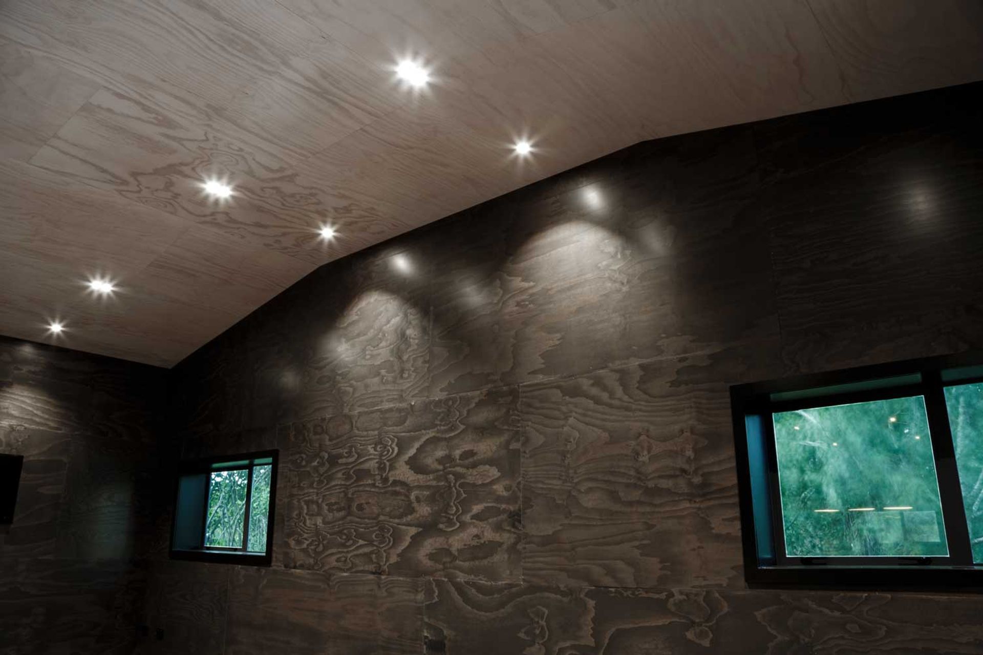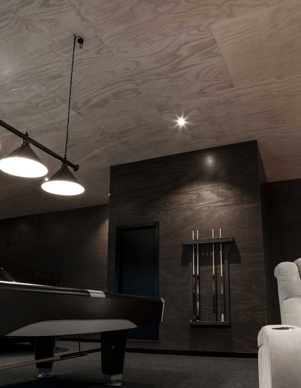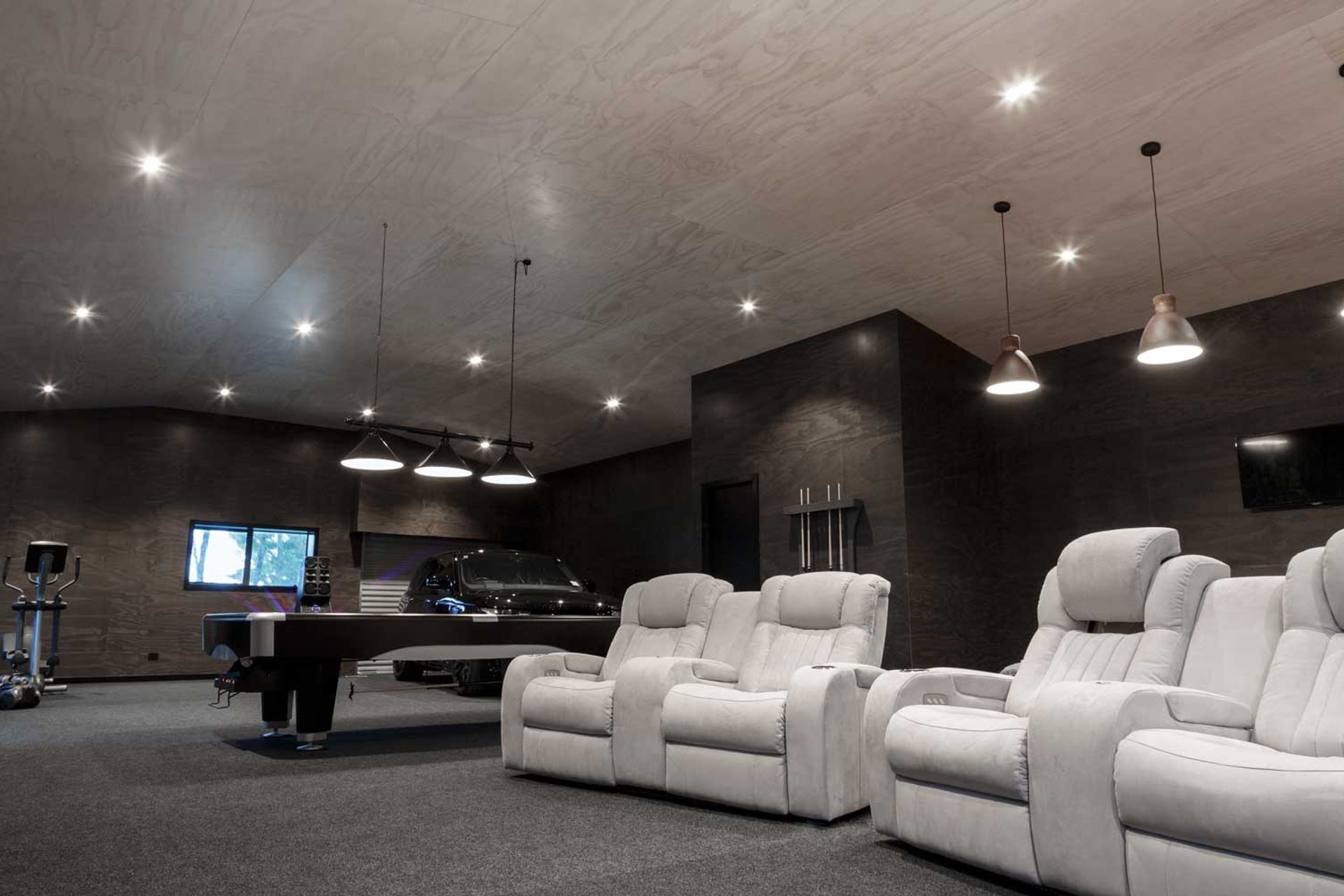 ArchiPro Project Summary - A meticulously finished man cave in Riverhead, featuring a spacious 170 square metre layout with a kitchen, bathroom, and personal gym, all designed for comfort and entertainment, showcasing PlyPlay's innovative materials and soundproofing capabilities.