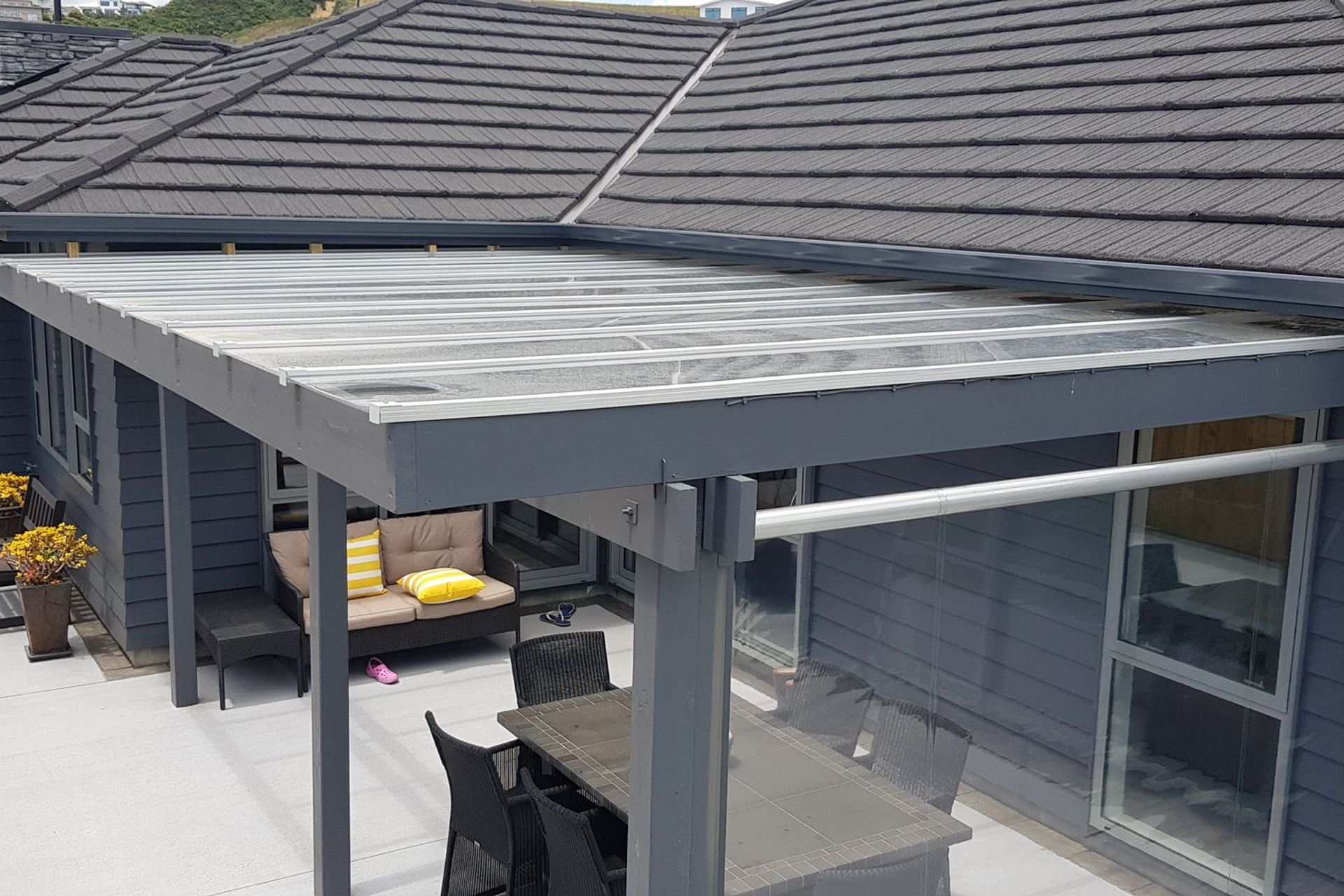 ArchiPro Project Summary - Innovative design enhances outdoor living with a durable, clear roof canopy that allows natural light.