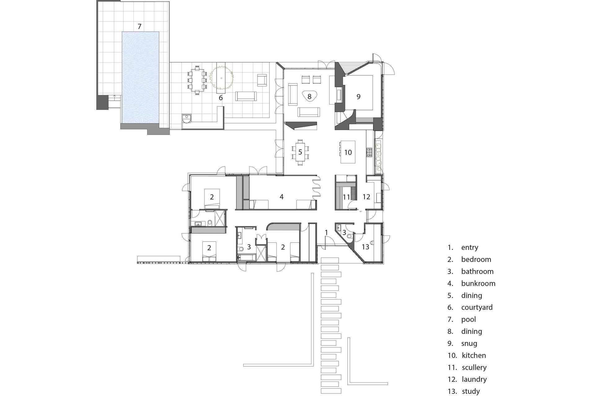 More steel doors link the courtyard to private areas of the house: two of the four bedrooms and the kids’ playroom – a fun space for the children and their friends to play and to stay overnight in the bunkbeds.