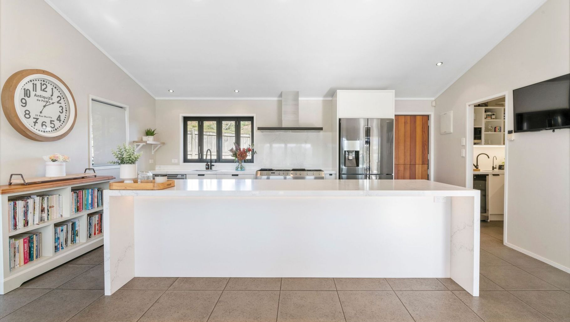 ArchiPro Project Summary - A modern kitchen makeover in Matakana, completed in 2023, featuring luxurious Trendstone Cala Royale benchtops, Resene Rice Cake lacquer, and innovative Blum soft close mechanisms for a seamless and sophisticated culinary experience.