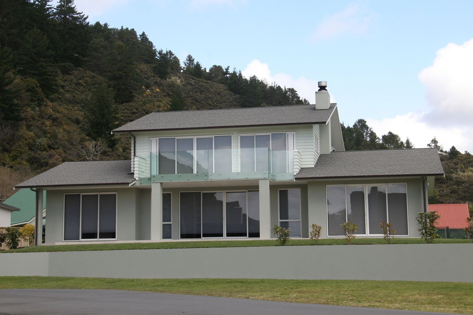 ArchiPro Project Summary - A distinguished residence in Matarangi, featuring Linea Weatherboard & Plaster cladding and Shingle roofing, harmoniously blending with its stunning natural surroundings.