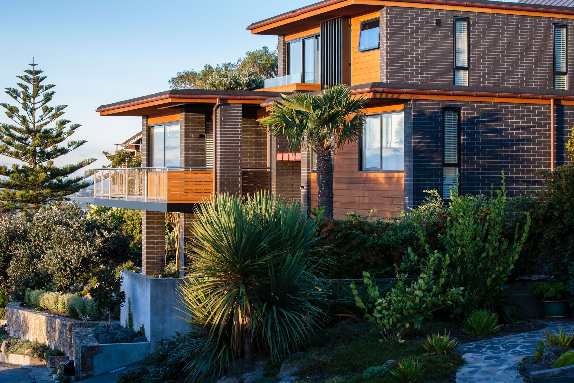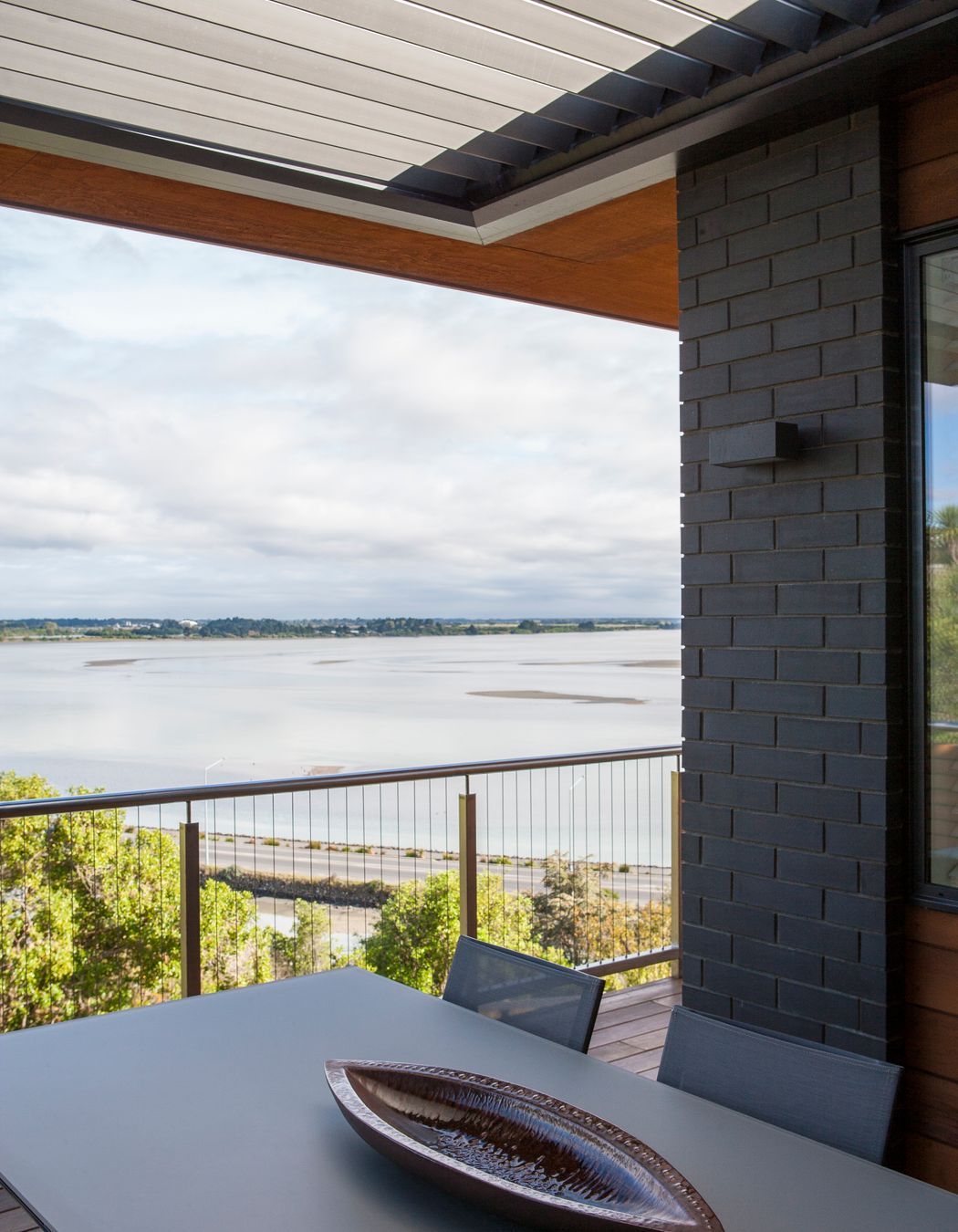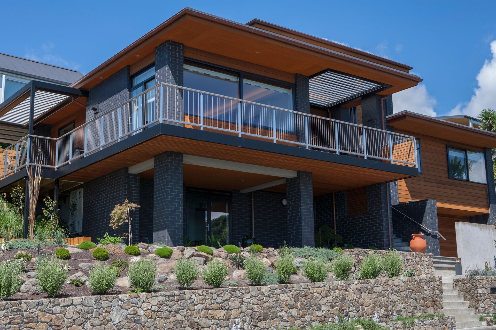 ArchiPro Project Summary - A modern replacement home in McCormacks Bay featuring striking black clay brick and cedar cladding, designed for passive solar gain and comfort, with cantilevered decks, a stunning fireplace, and luxurious finishes throughout.