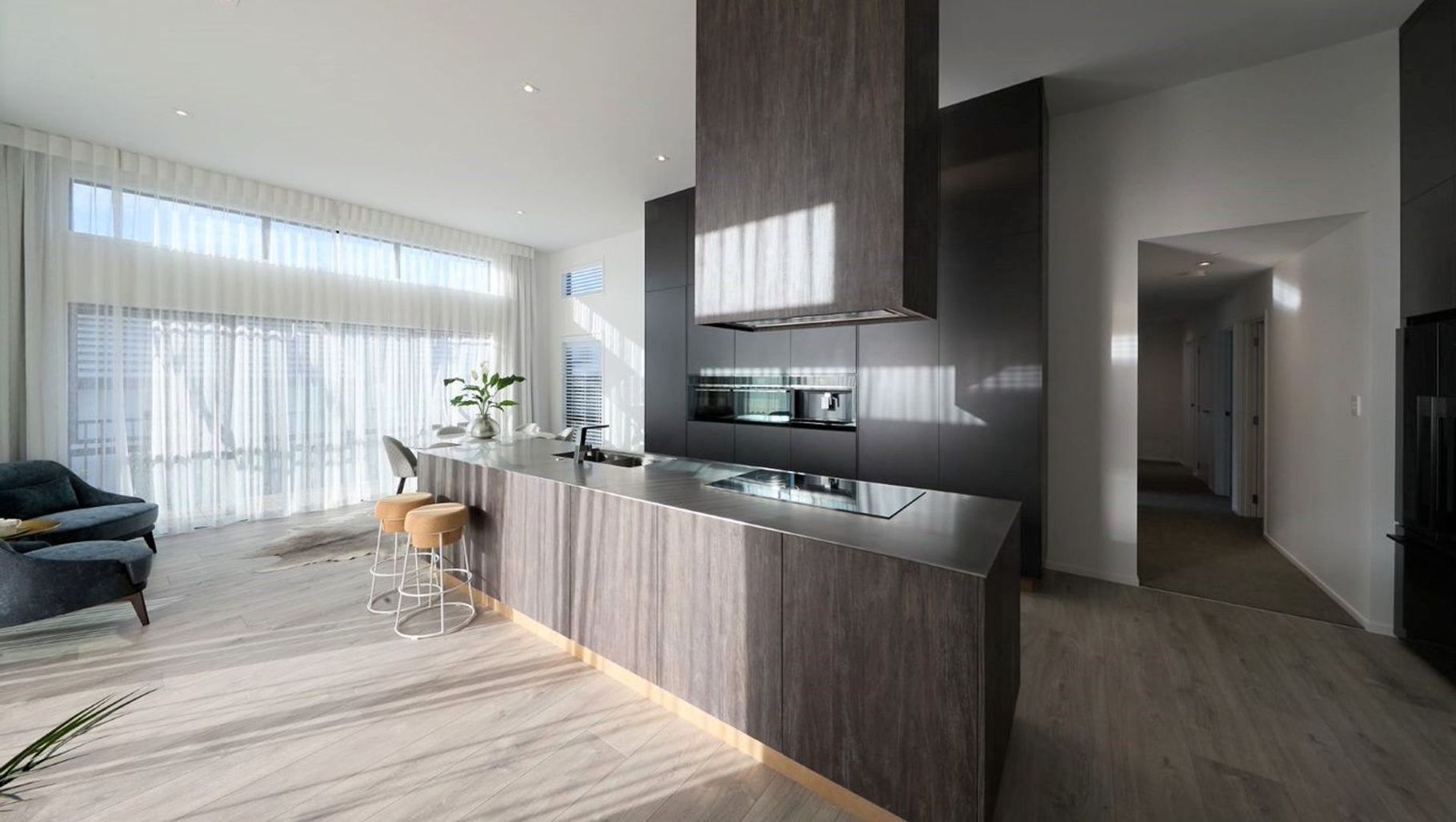 ArchiPro Project Summary - A luxurious kitchen design featuring Bestwood Melamine in Carbon and Blackened Teak, crafted by Isla Ross from Interior Fittings, showcasing seamless handle-less cabinetry and warm recessed lighting for a sophisticated open space.