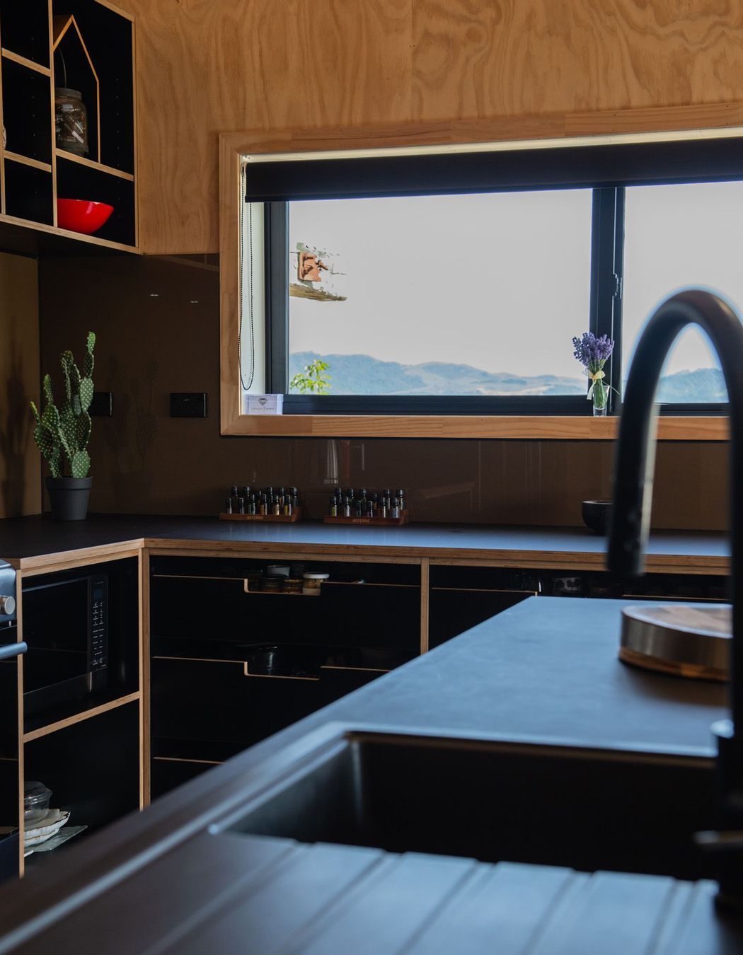 ArchiPro Project Summary - A sophisticated kitchen featuring natural birch plywood and matte black laminate, combining warmth and elegance with custom handles and shaped panels, while maintaining a minimalistic aesthetic and a beach Bach feel through the absence of kickboards.