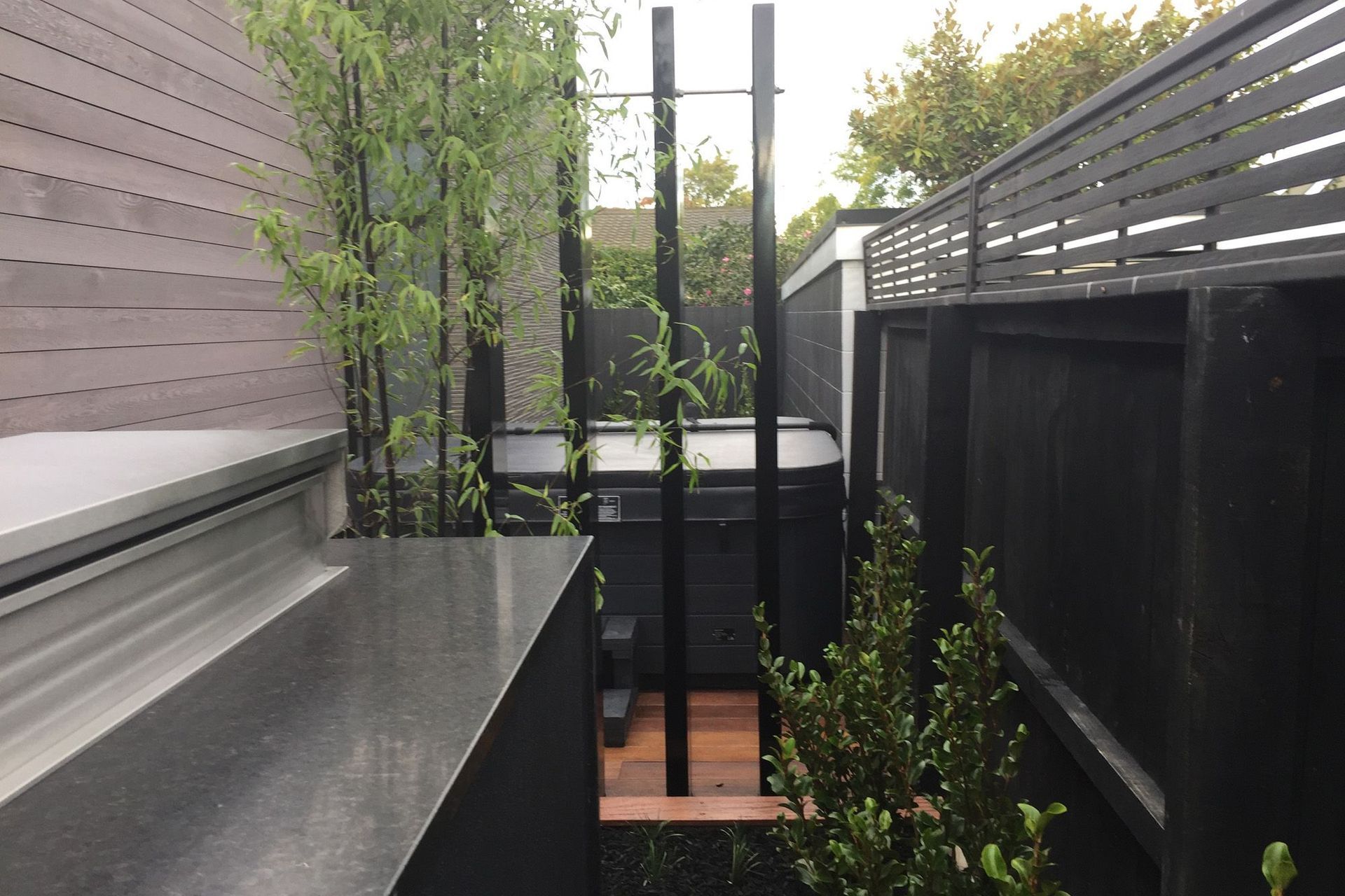 ArchiPro Project Summary - A thoughtfully designed outdoor space for a townhouse, featuring a seamless blend of functionality and aesthetics, including an outdoor kitchen, spa, and multi-zone entertaining areas, all while enhancing the property's architectural appeal.