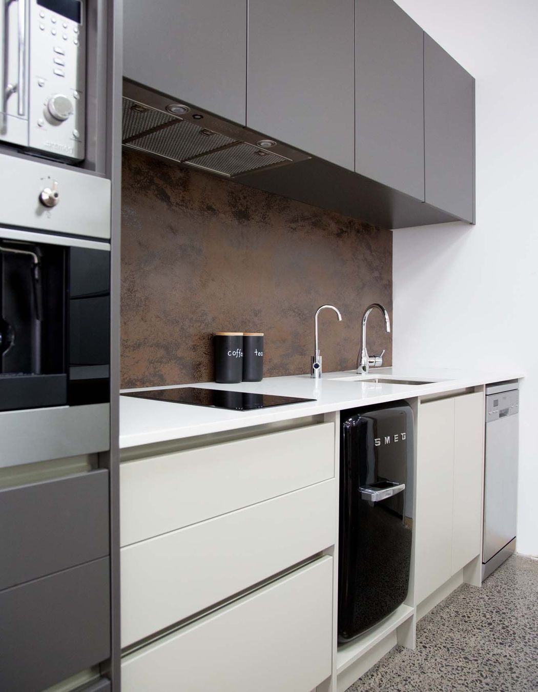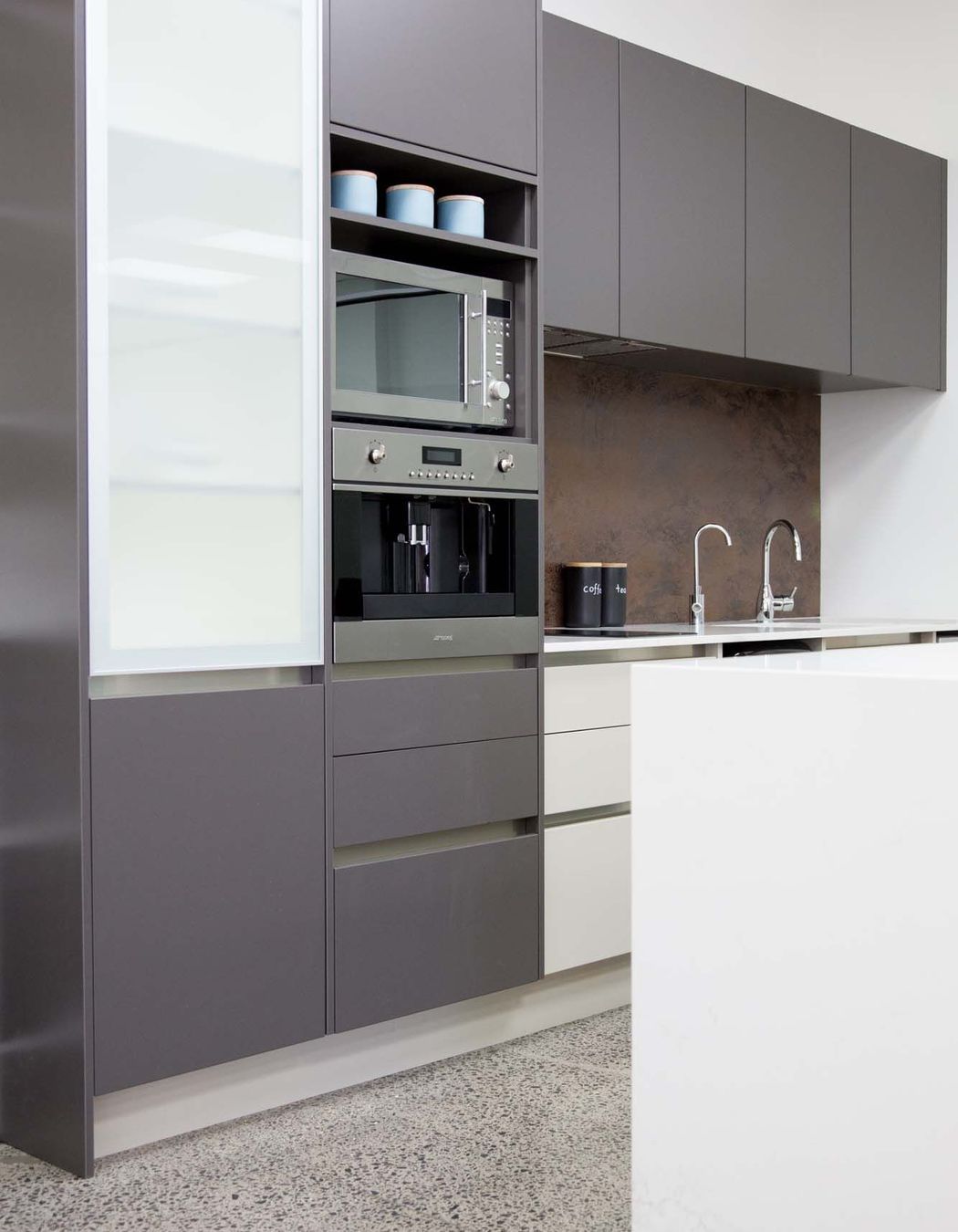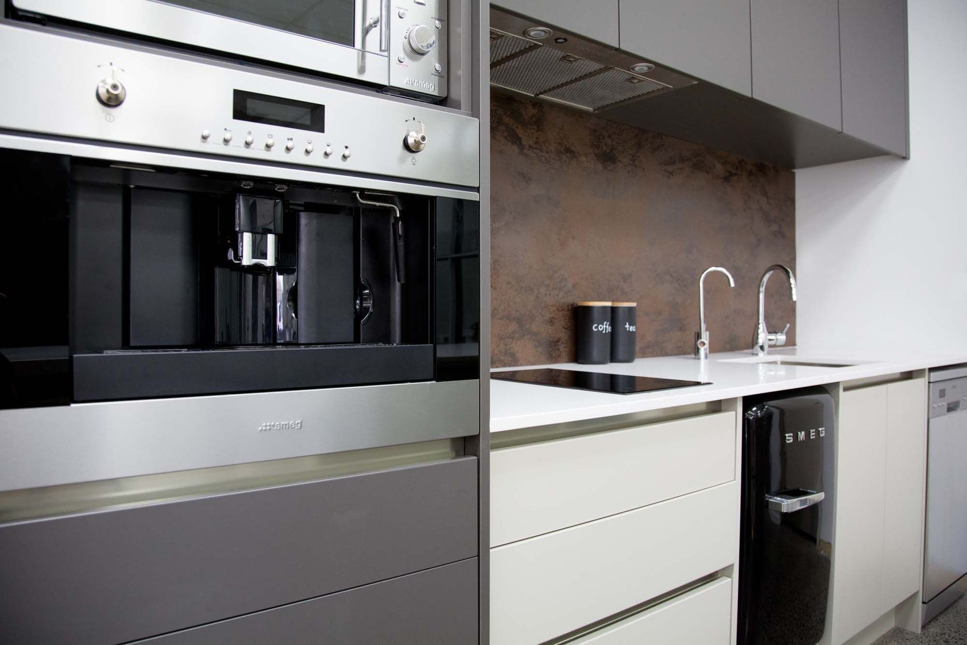 ArchiPro Project Summary - Moda Kitchens Showroom featuring Durostyle Lyell doors in Irish Crème and Wolfram Grey, designed to highlight an industrial-style kitchen, located in Mairangi Bay, Auckland.