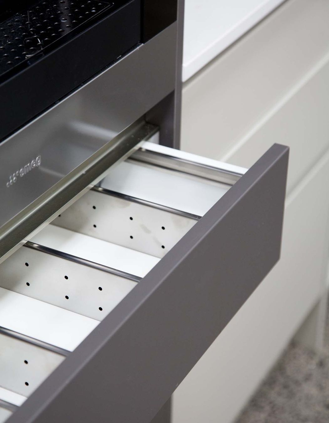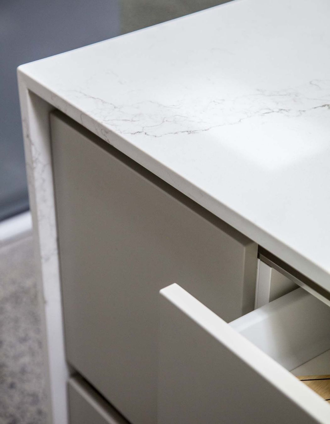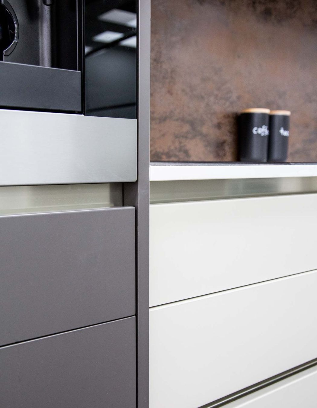 ArchiPro Project Summary - Moda Kitchens Showroom featuring Durostyle Lyell doors in Irish Crème and Wolfram Grey, designed to highlight an industrial-style kitchen, located in Mairangi Bay, Auckland.