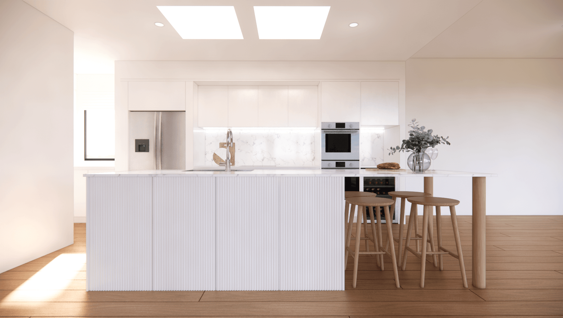 ArchiPro Project Summary - Project Glendowie features modern interior design with wood flooring, bespoke cabinetry, and a stylish kitchen, creating a warm and inviting atmosphere.