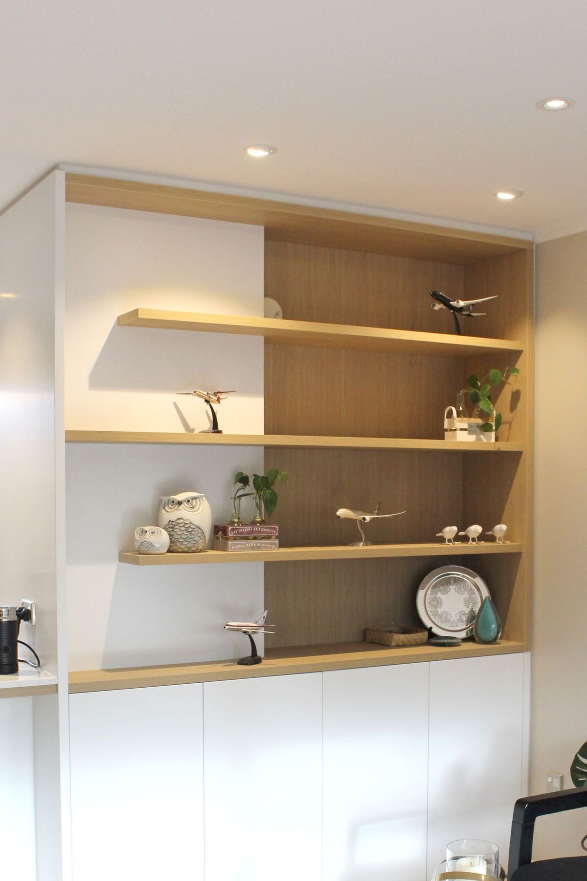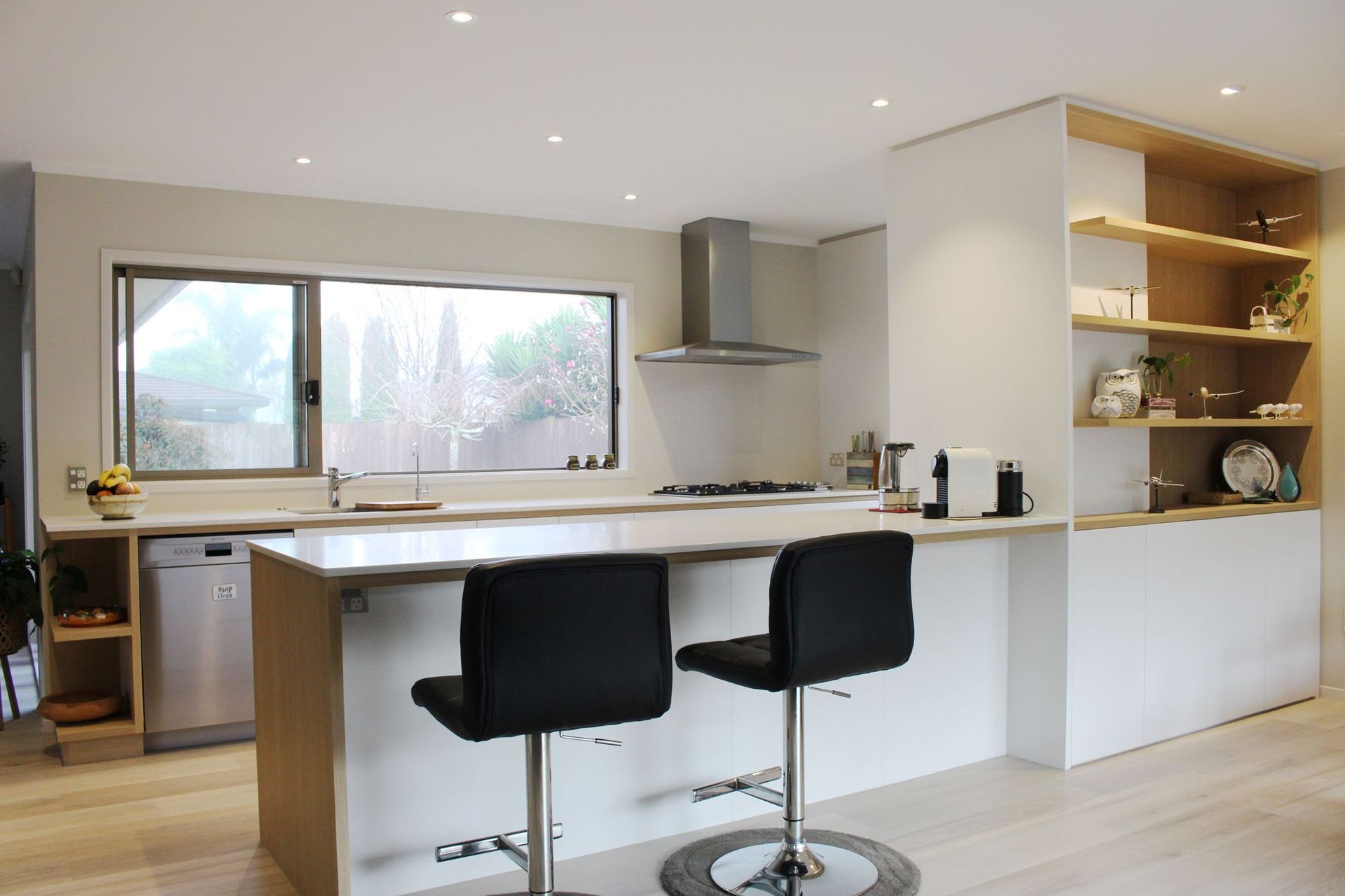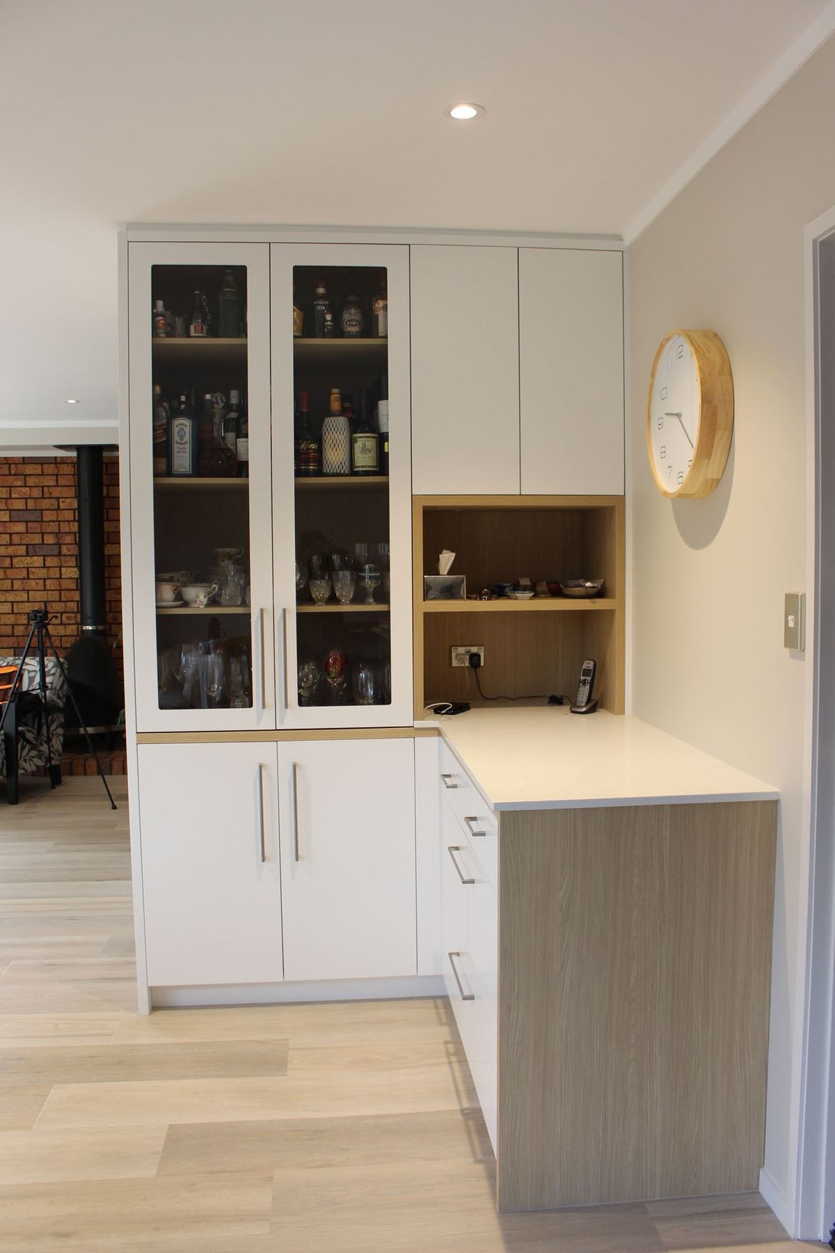 ArchiPro Project Summary - A modern renovation that enhances living spaces through innovative design, featuring a transformed kitchen with a peninsula island, cohesive cabinetry extending into the living room, and stylish floating shelves that elevate the overall aesthetic.