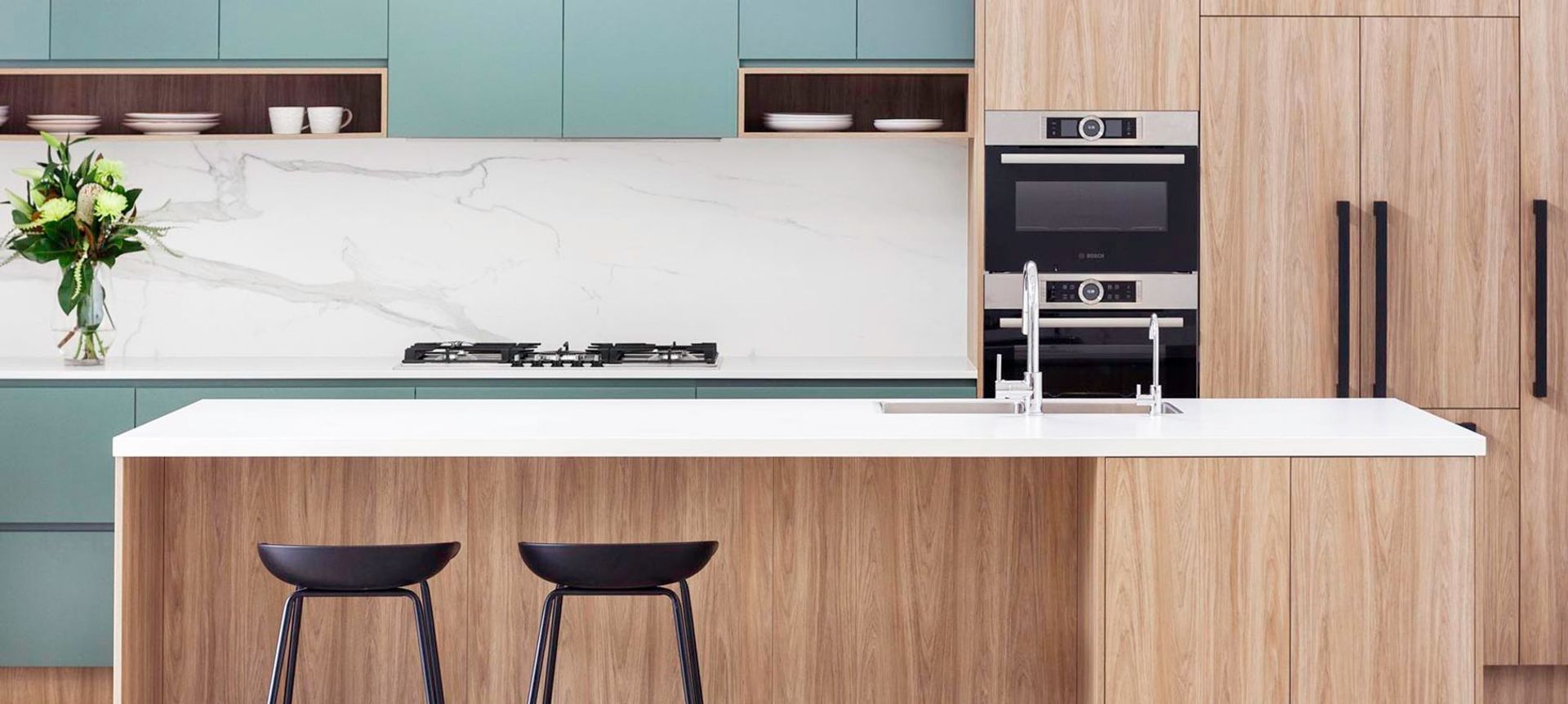 ArchiPro Project Summary - A contemporary kitchen featuring striking green cabinetry, warm oak finishes, and a durable Neolith splashback, designed for both aesthetics and practicality, completed in 2021 in Gladesville.
