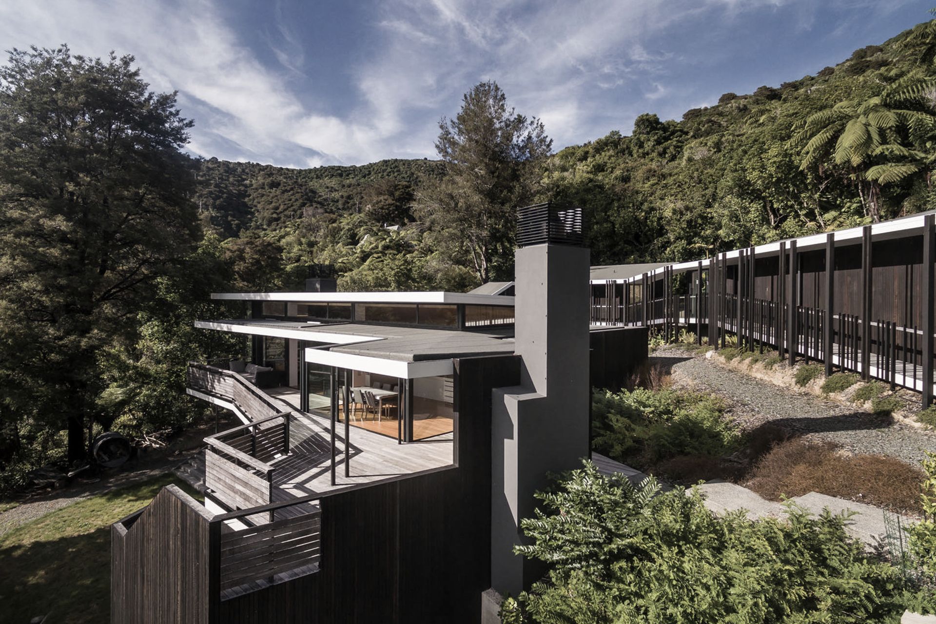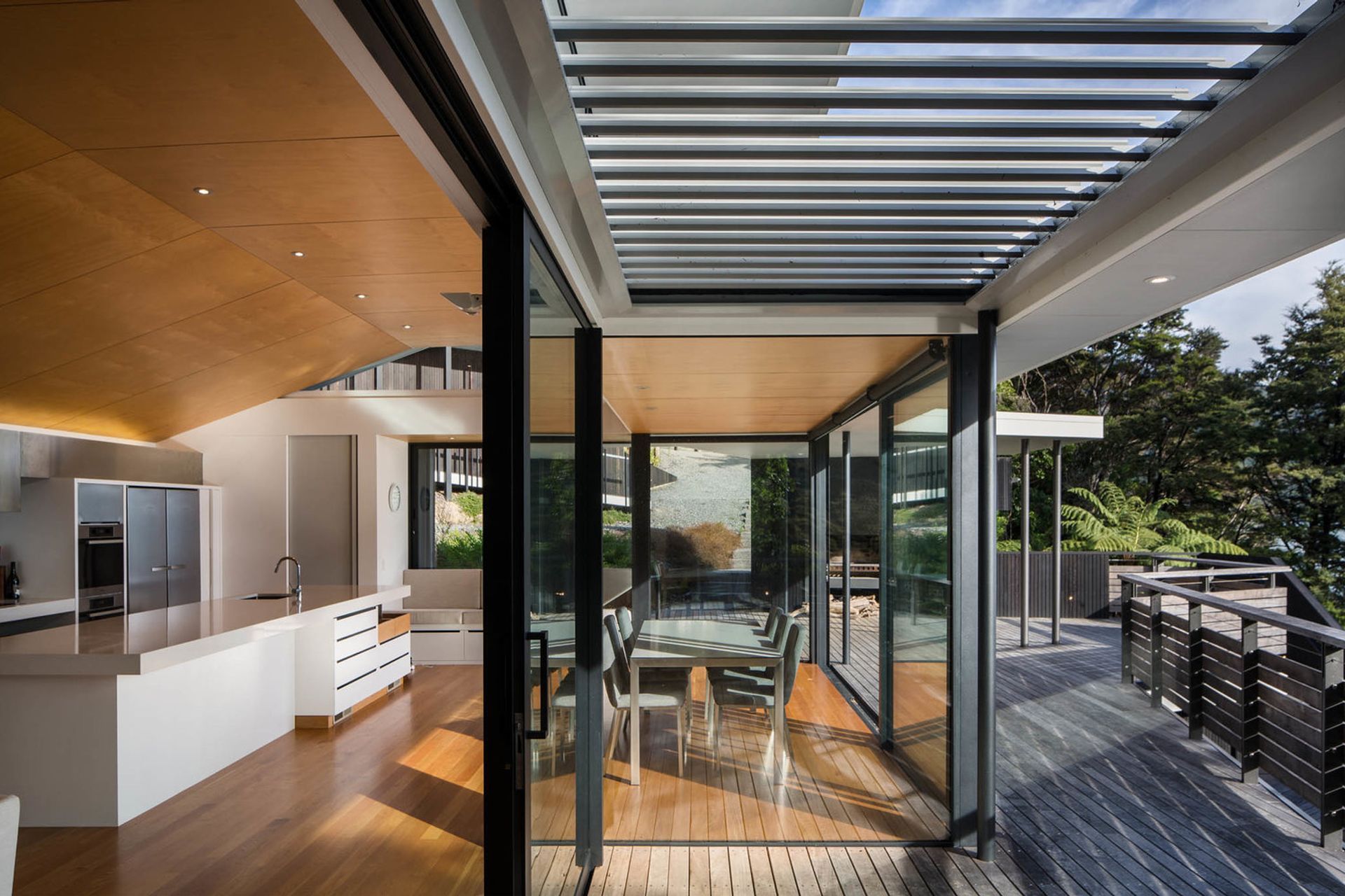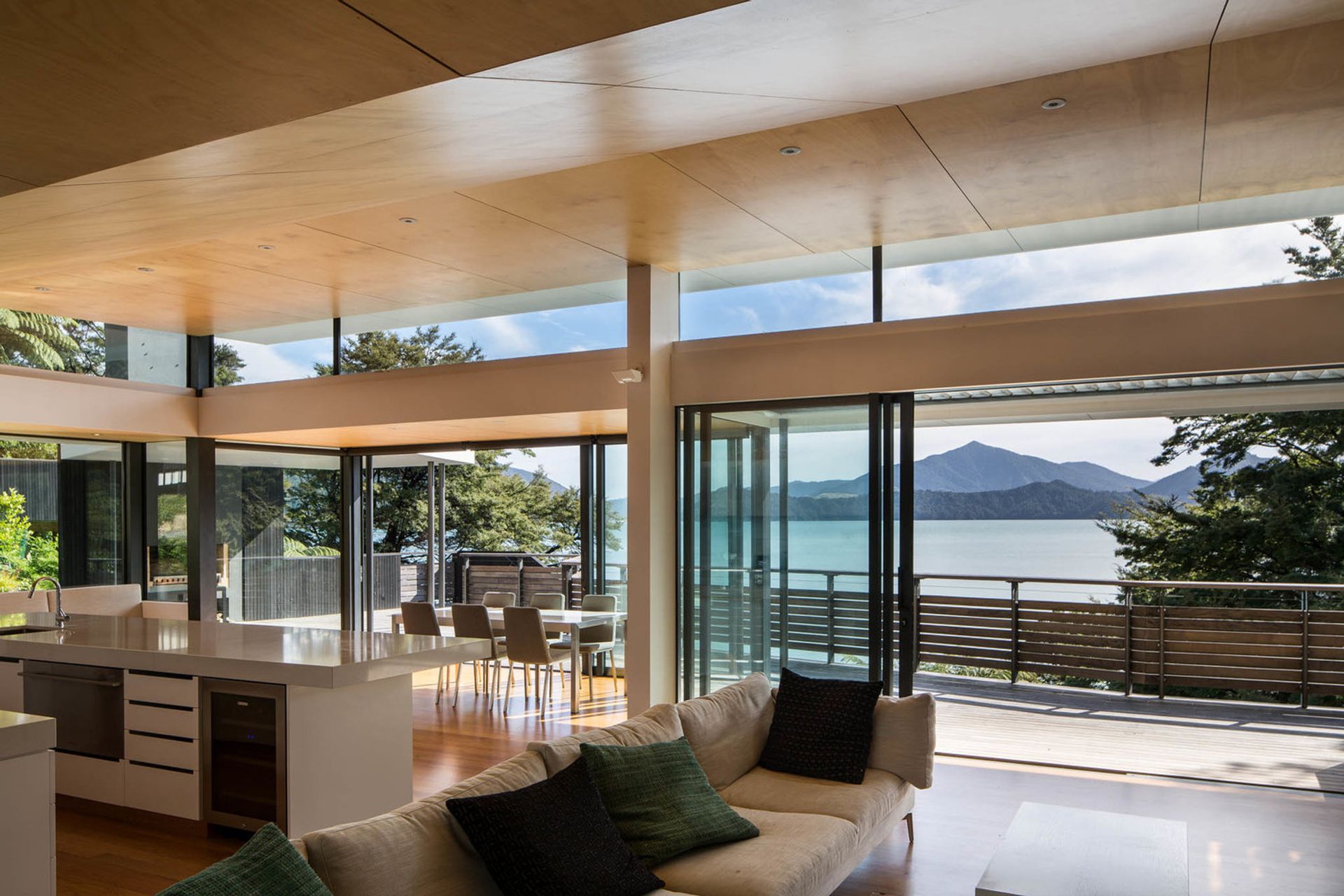 ArchiPro Project Summary - Moetapu Beach House: A thoughtfully designed holiday retreat nestled in the bush, featuring a unique roof form that integrates with the landscape, offering versatile accommodation and seamless indoor-outdoor living with stunning views of Pelorus Sound.