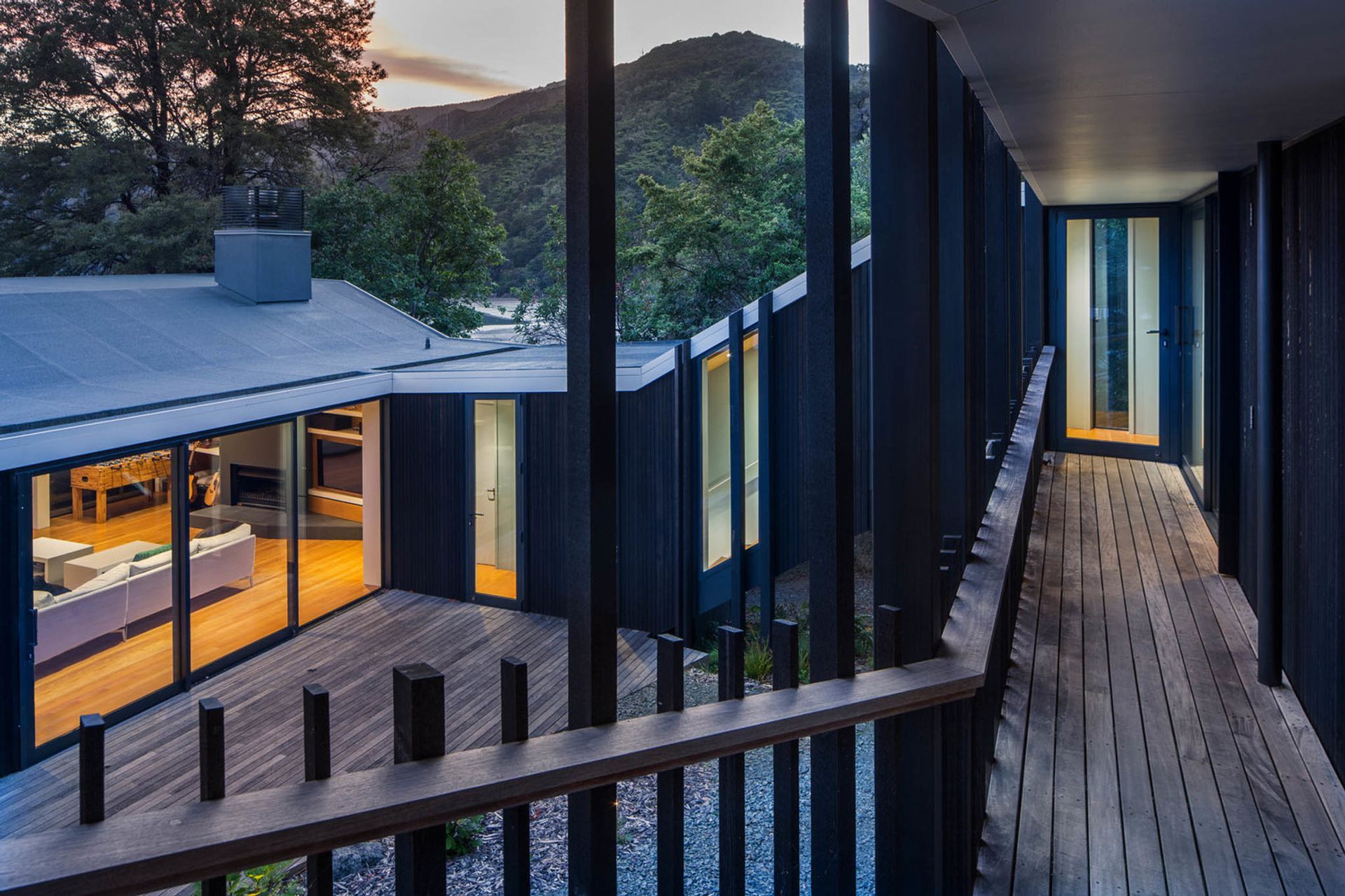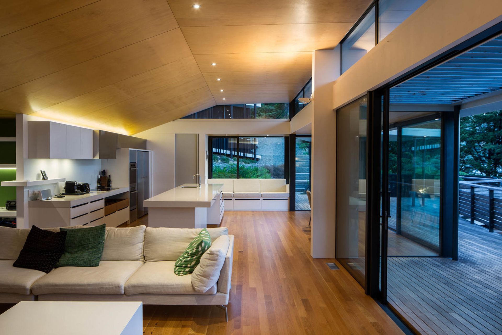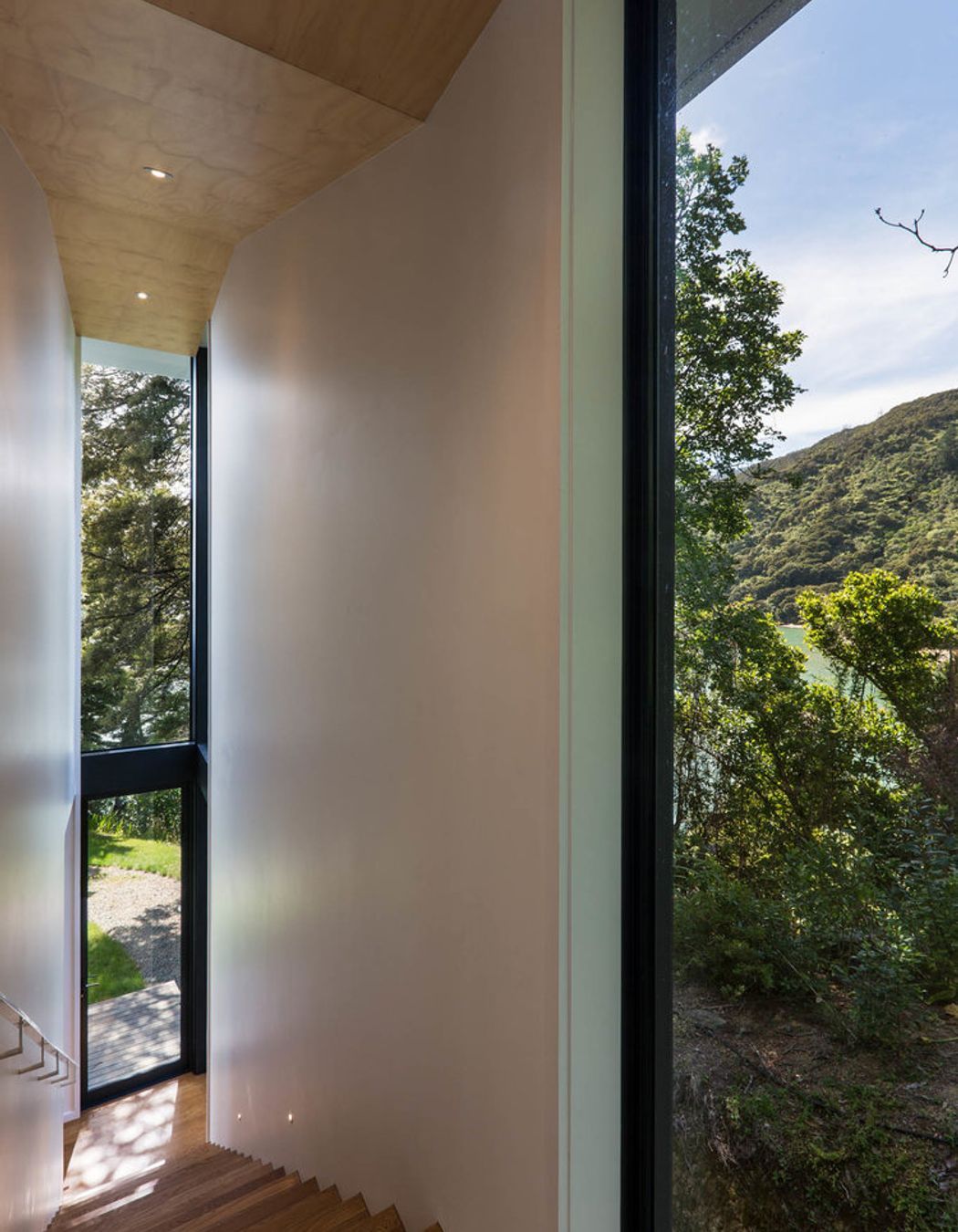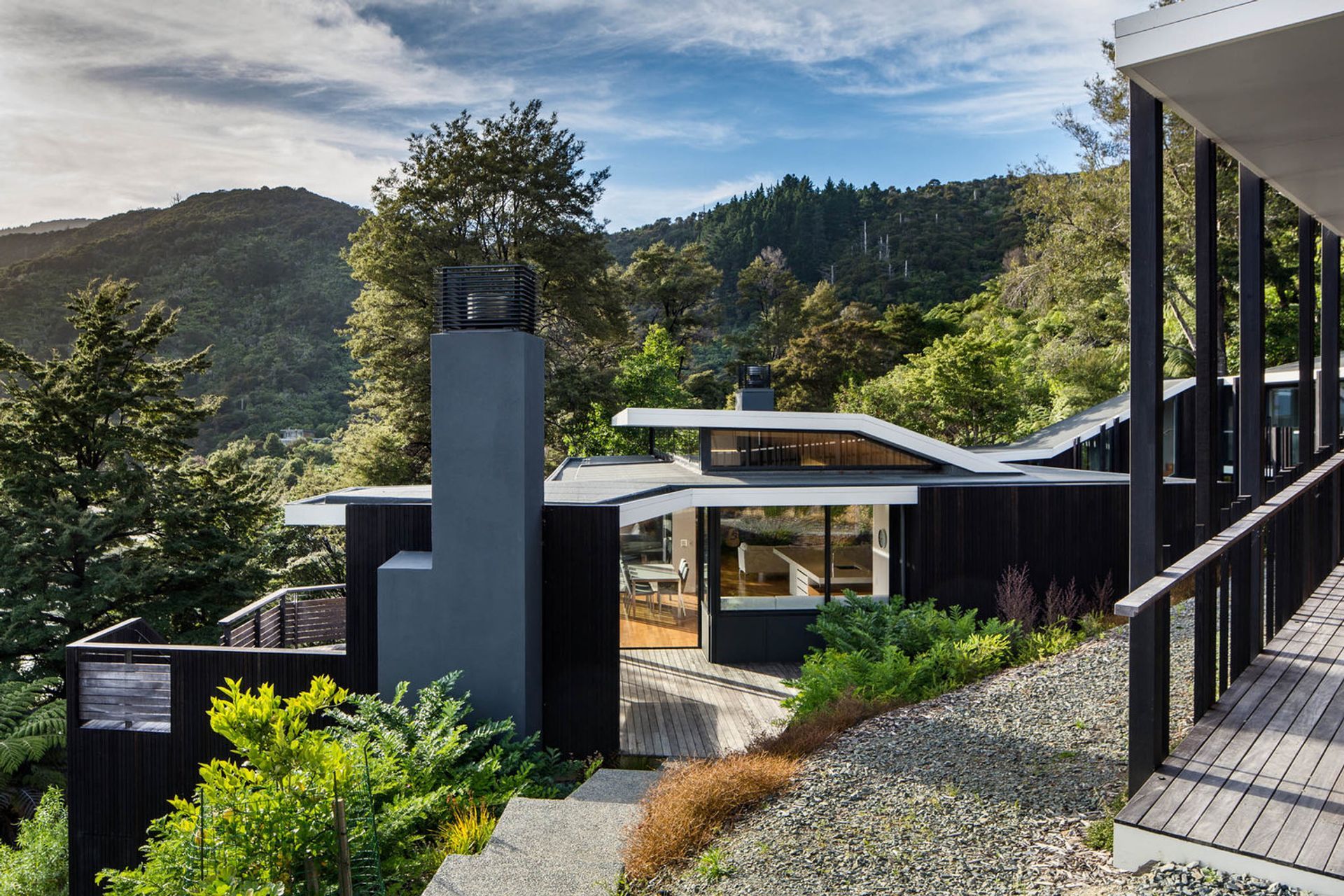 ArchiPro Project Summary - Moetapu Beach House: A thoughtfully designed holiday retreat nestled in the bush, featuring a unique roof form that integrates with the landscape, offering versatile accommodation and seamless indoor-outdoor living with stunning views of Pelorus Sound.