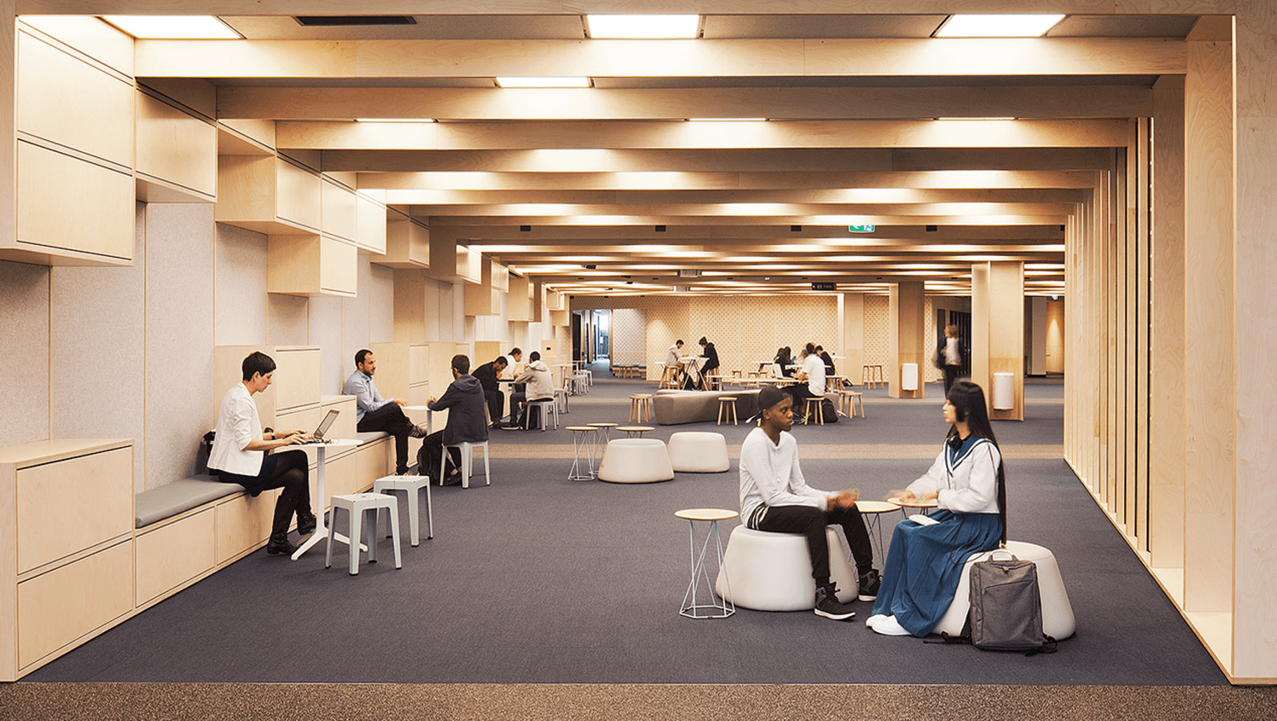 ArchiPro Project Summary - Innovative learning spaces at Monash University’s Bourke St Campus, featuring flexible classrooms and collaborative areas designed by Jackson Interiors, utilizing eco-friendly DesignerPly for durability and acoustic performance.