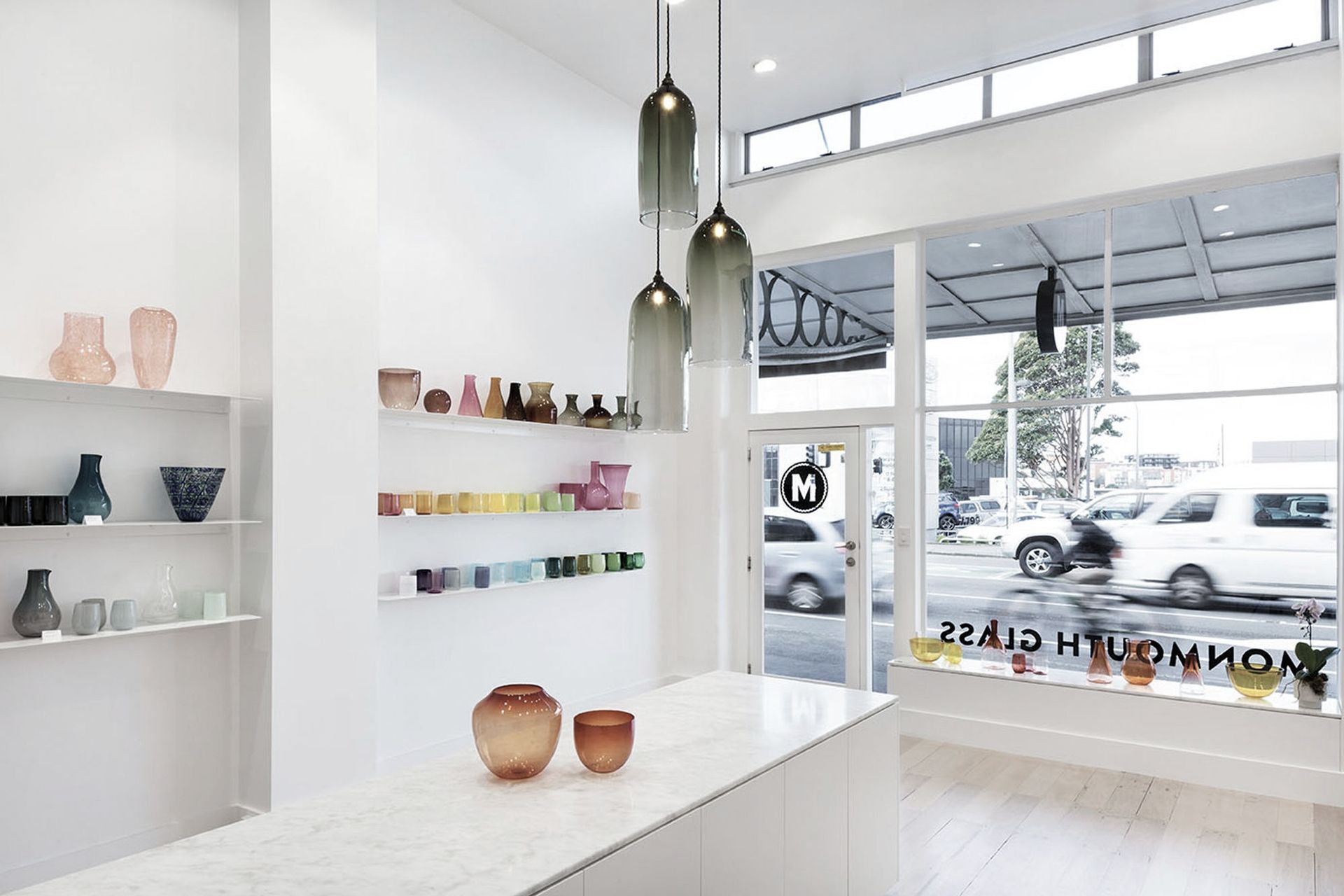 ArchiPro Project Summary - Monmouth Glass Studio features a gallery-inspired design that highlights vibrant colored glass within a spacious, high-ceilinged environment, creating an inviting atmosphere for customers.