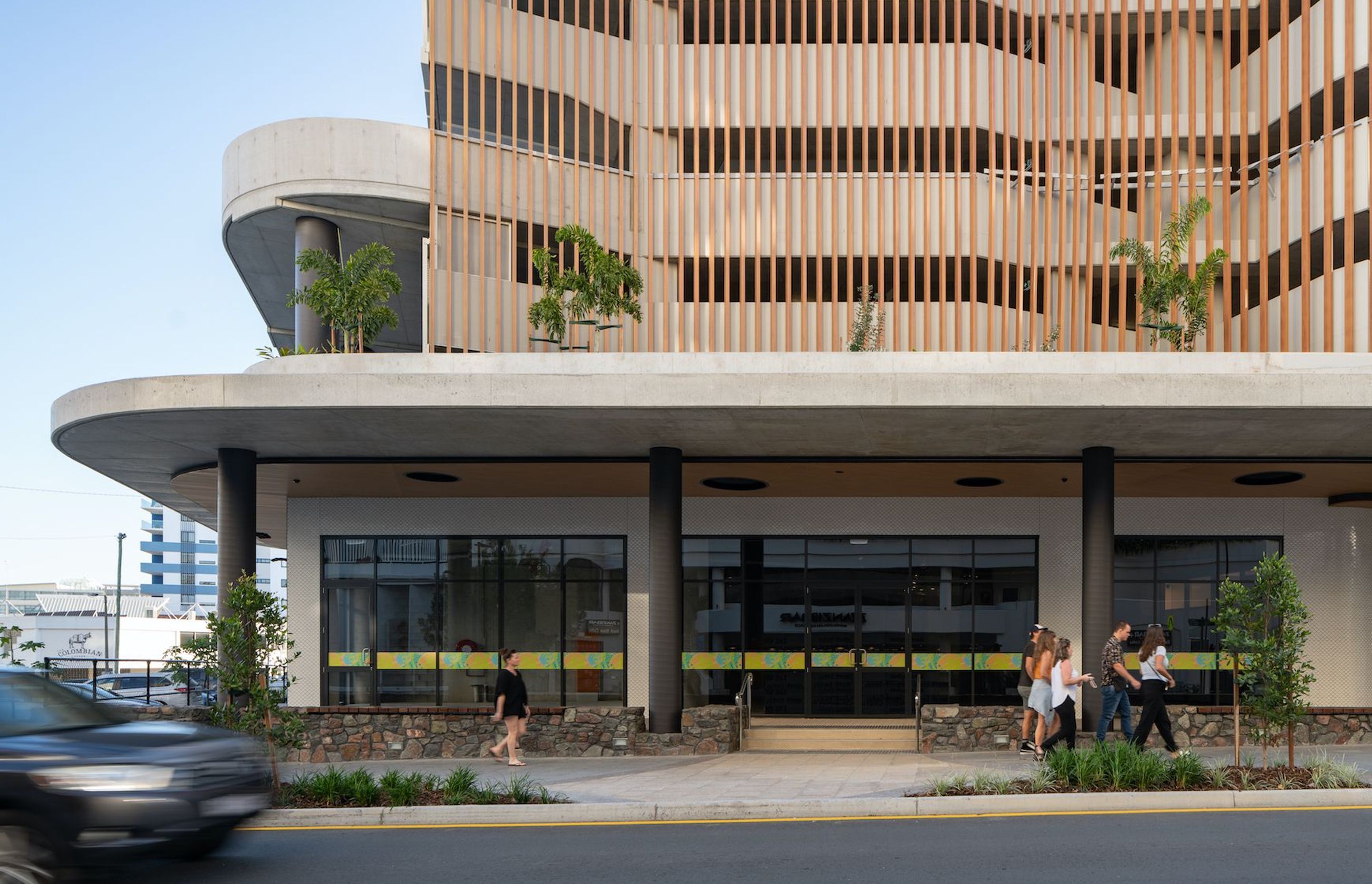 ArchiPro Project Summary - Mooloolaba Car Park: A thoughtfully designed structure that enhances community transport, featuring a textured façade that reflects local heritage while providing functional utility and visual relief within the surrounding urban landscape.